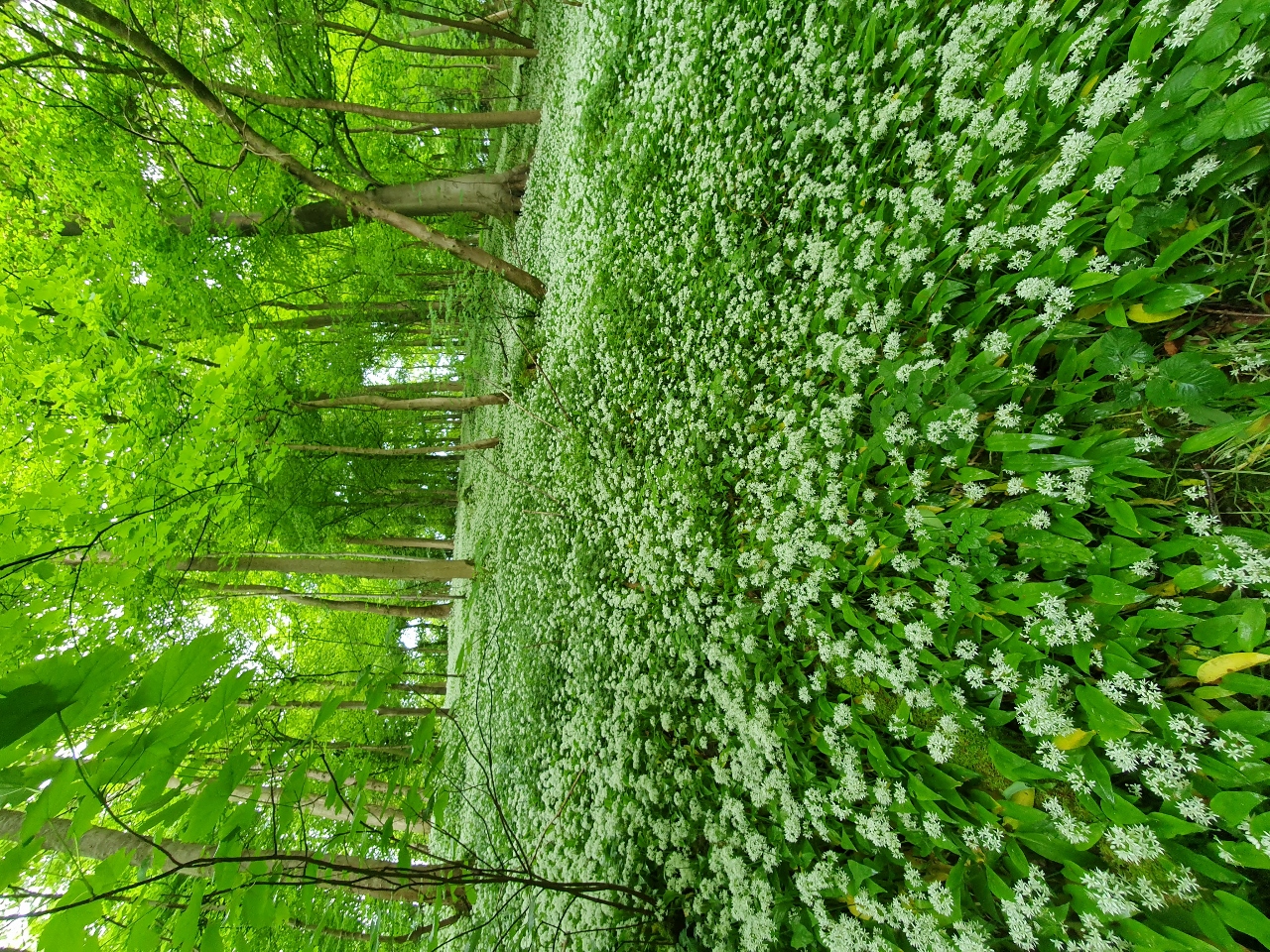 Neben den uralten riesigen Bäumen, Buchen, Eichen und Eschen, fällt wieder der Bärlauch auf. Stellenweise