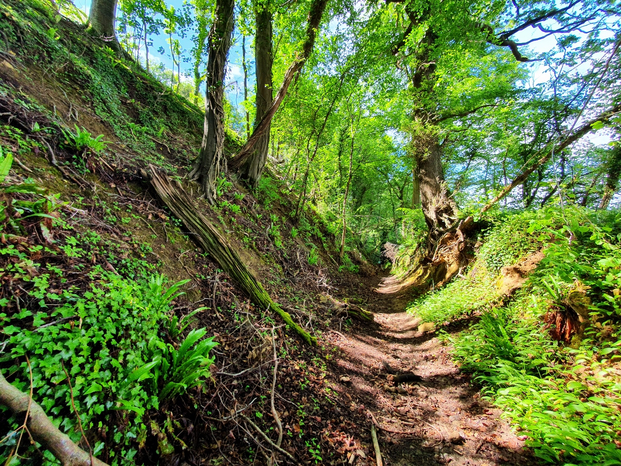 malerische Wiesen, dann durch den Wald, wo uns die extrem feuchte Luft