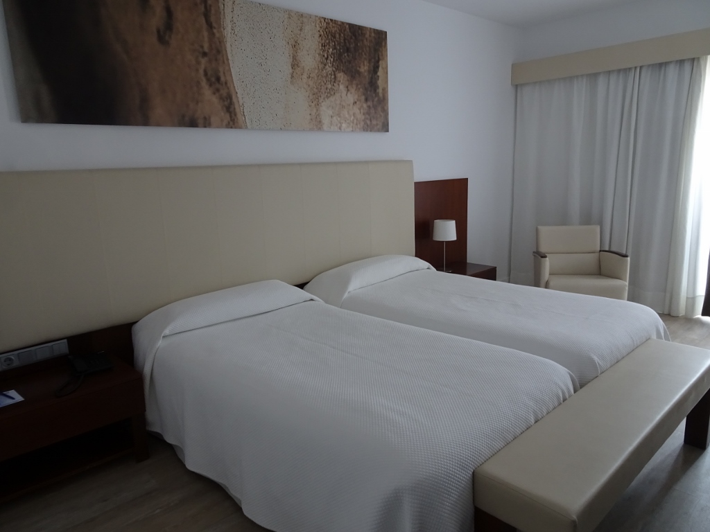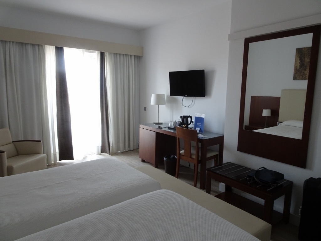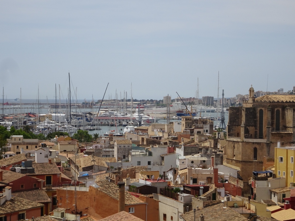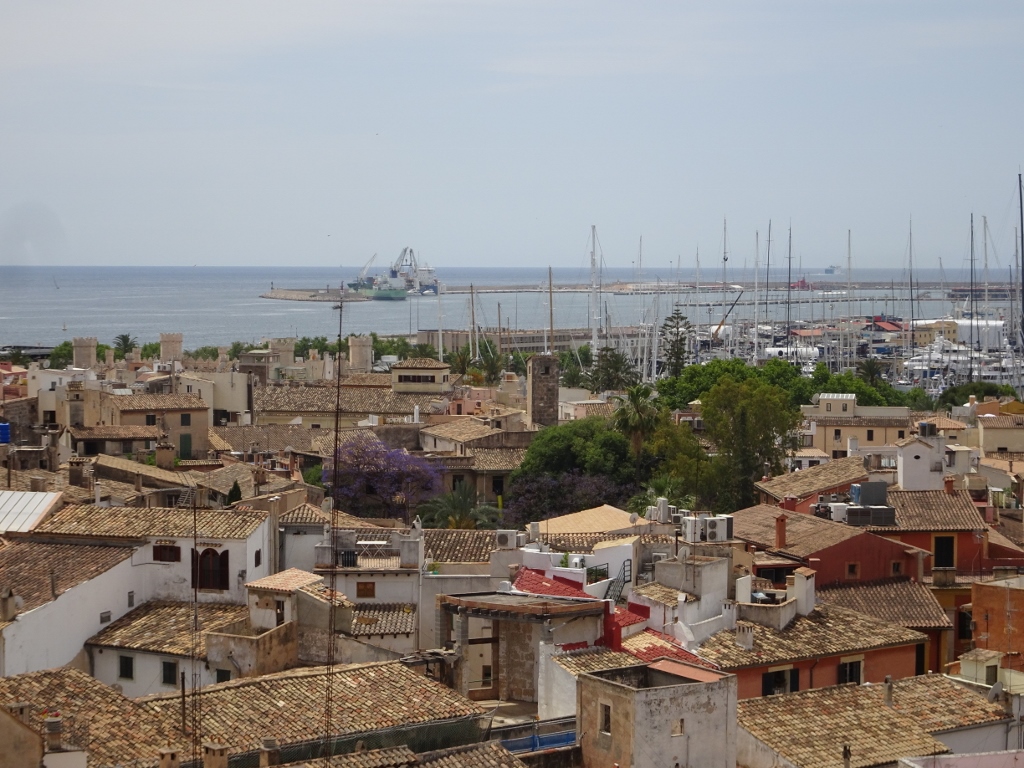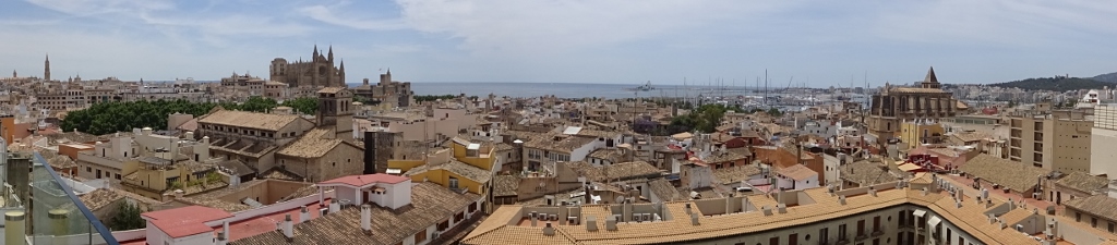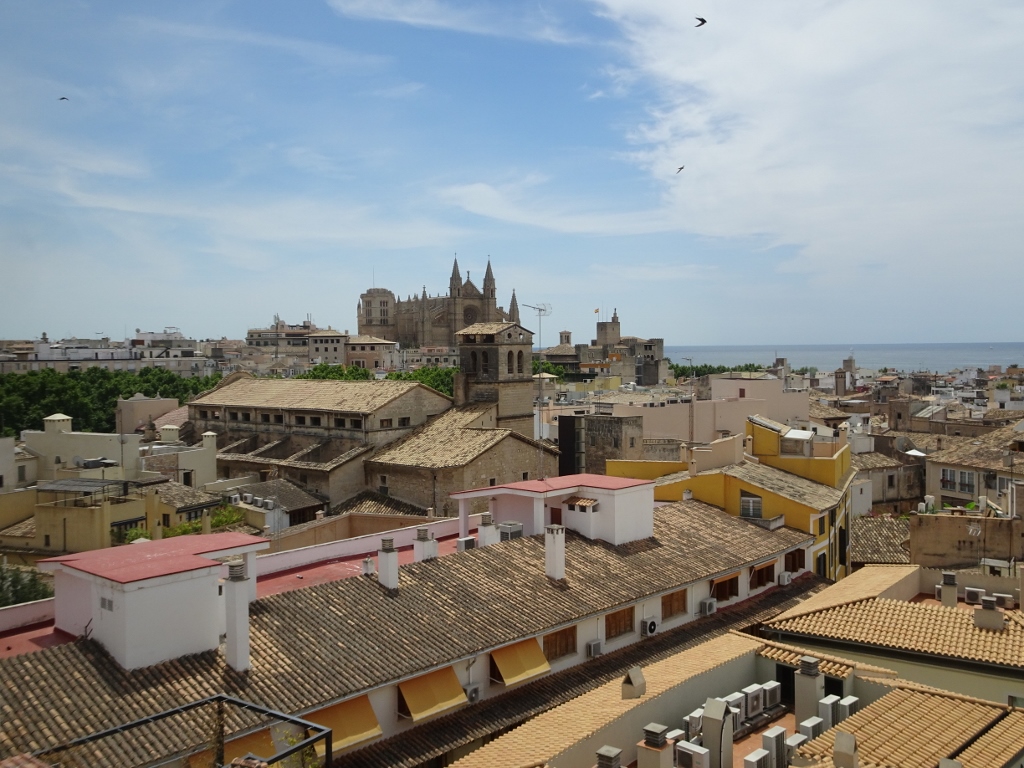 Wir starten also am Montag nach ausgiebigem Frühstück und dem lästigen Akt des Kofferpackens zum Bahnhof der historischen Eisenbahn, der nur wenige Gehminuten entfernt liegt und sitzen kurz darauf in der nur spärlich besetzten Bahn. Vormittags ist der Hauptverkehr von Palma nach Sòller unterwegs, erst abends sind die Bahnen in Richtung Palma brechend voll, um die Tagestouristen zurück zu bringen. Zunächst quält sich die Bahn, die 1912 eingeweiht wurde und bereits 1929 vollständig elektrifiziert wurde (übrigens von der Firma Siemens) den Berg hinauf. In mehreren Schleifen geht es bergan, währenddessen man einen fantastischen Blick auf das Tal von Sòller hat, um dann in einer Reihe von Tunneln zu verschwinden, mittels derer der Hauptkamm der Serra de Tramuntana durchquert wird. Aus dem letzten Tunnel raus erreicht man schon Bunyola, der Ort, der gestern noch Ausgangspunkt unserer Wanderung war. Ich öffne das Fenster und lasse mir bei der gemächlichen Fahrt durch endlose Oliven- und Mandelhaine die warme Sommerluft um die Nase wehen. Dann nach etwa 40 Minuten Fahrt erreichen wir die Vororte von Palma, es geht direkt auf den Straßen der Hauptstadt zum Bahnhof, wo wir den Zug verlassen und uns mit dem Taxi in unser neues “Zuhause” bringen lassen. Das Hotel “Almudaina” ist ein Vier-Sterne-Haus mitten im geschäftlichen Zentrum von Palma. Zentraler geht nicht, etwa 5 Gehminuten jeweils zur Kathedrale, zum Hafen oder zum historischen Kern der Stadt. Das Zimmer ist entsprechend der Klasse des Hauses ausgestattet, wir haben zwar kein Zimmer in der obersten Etage, aber vom Balkon unseres Zimmers sehen wir genau über die Dächer der Stadt auf Kathedrale und Hafen, abgewandt von der Hauptverkehrsstraße, so das sogar bei geöffnetem Fenster nur ein Säuseln vom Verkehr zu hören ist.