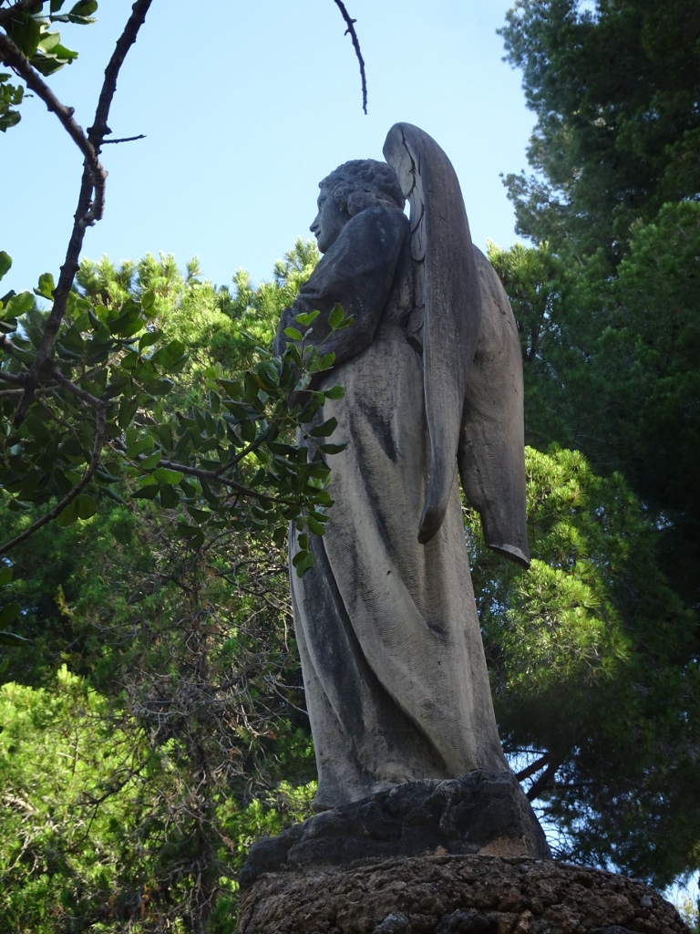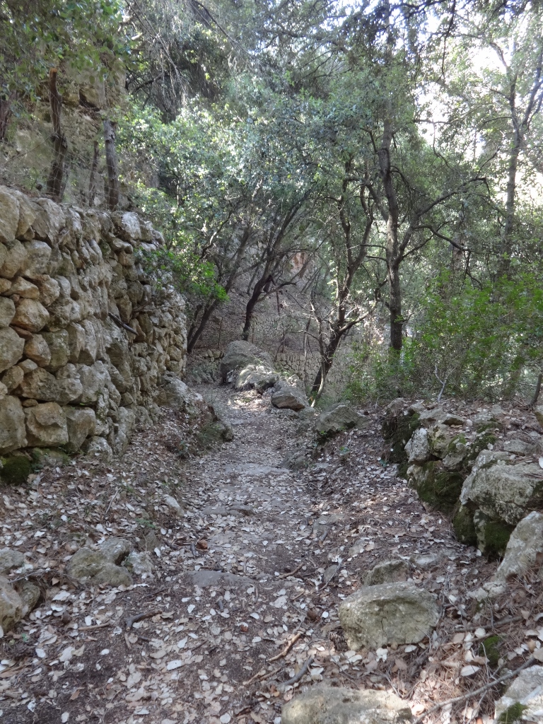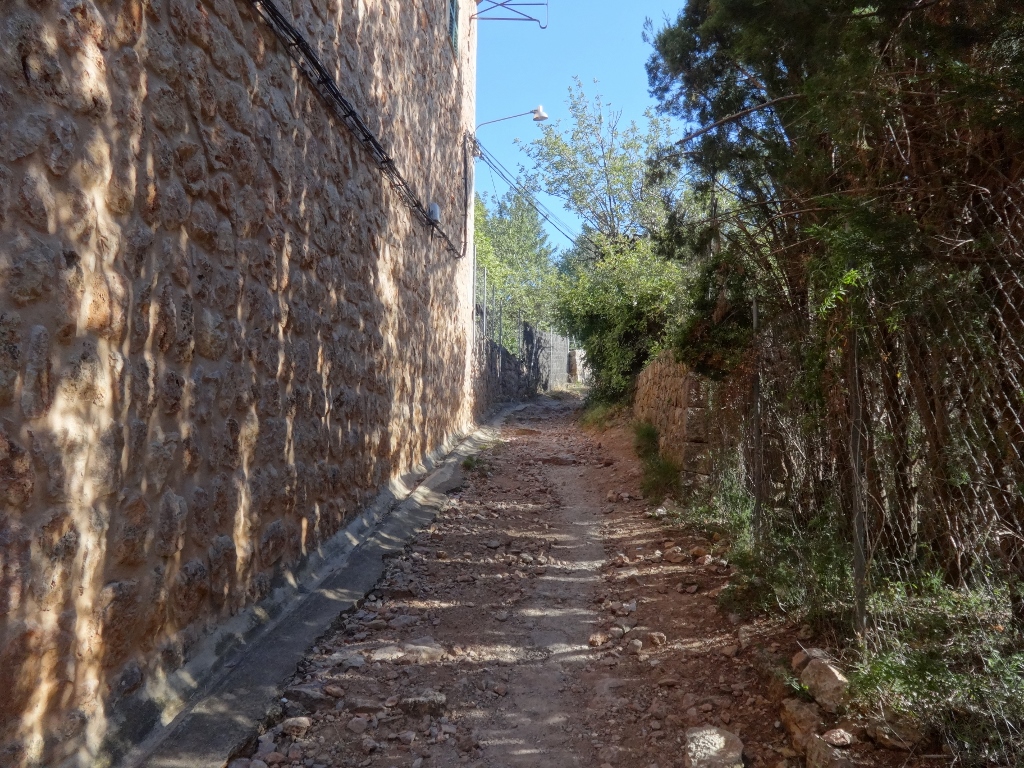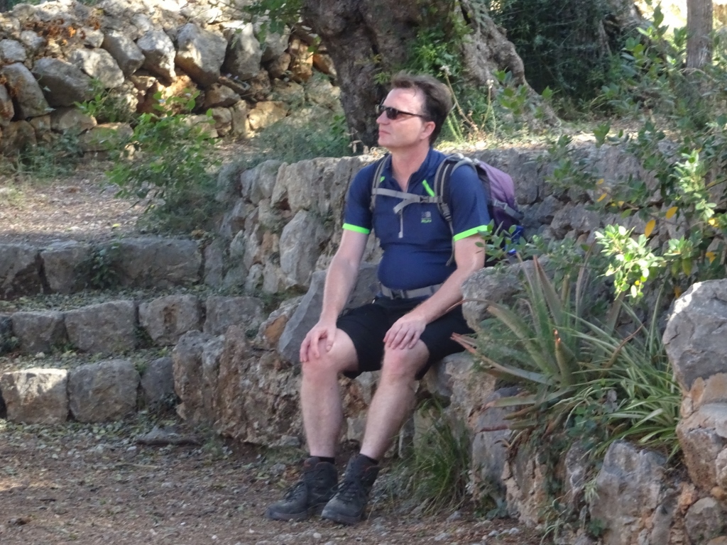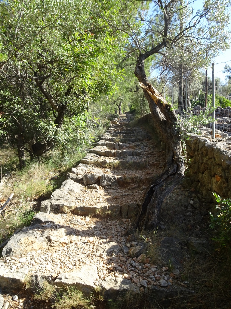 Wir starten wieder am Hotel und gehen ein wenig durch die Gassen von Sòller. Witzigerweise ist das der Weg, den wir am ersten Tag versehentlich gegangen sind, heute sind wir aber richtig hier. Wir gehen ziemlich flott, denn die Luft ist rauchgeschwängert. Jeden Morgen zündelt irgendeiner der Mallorquiner in seinem Garten, die verbrennen die Gartenabfälle und der Rauch bleibt hier im Tal hängen, dass es nicht zum Aushalten ist, die Sonne tut das ihrige dazu, den Rauch hier ins Tal zu drücken. So gehen wir fast 2km bergan, bis man einigermaßen Luft holen kann. Von oben sieht man die Stadt kaum unter der Dunstglocke. Es geht steil bergauf, über 5km lang nur Steine und Treppen.