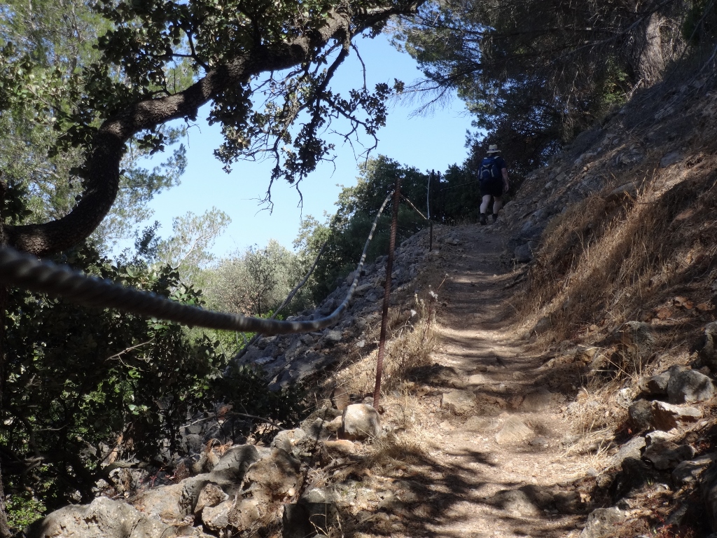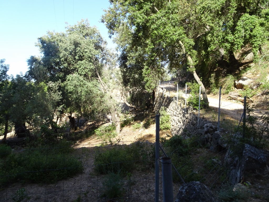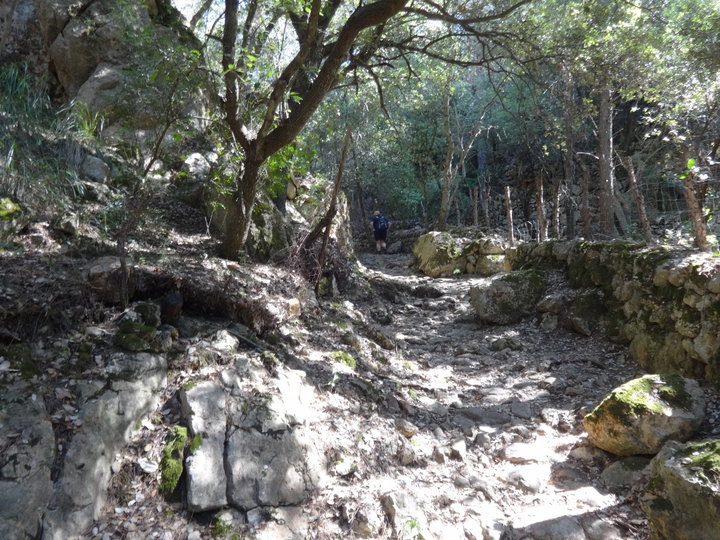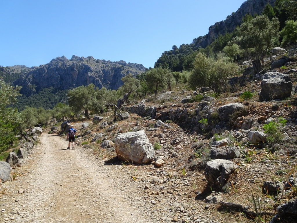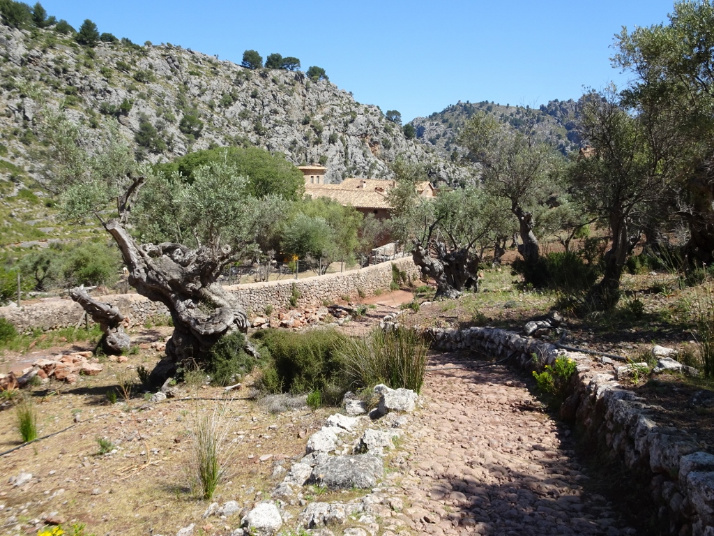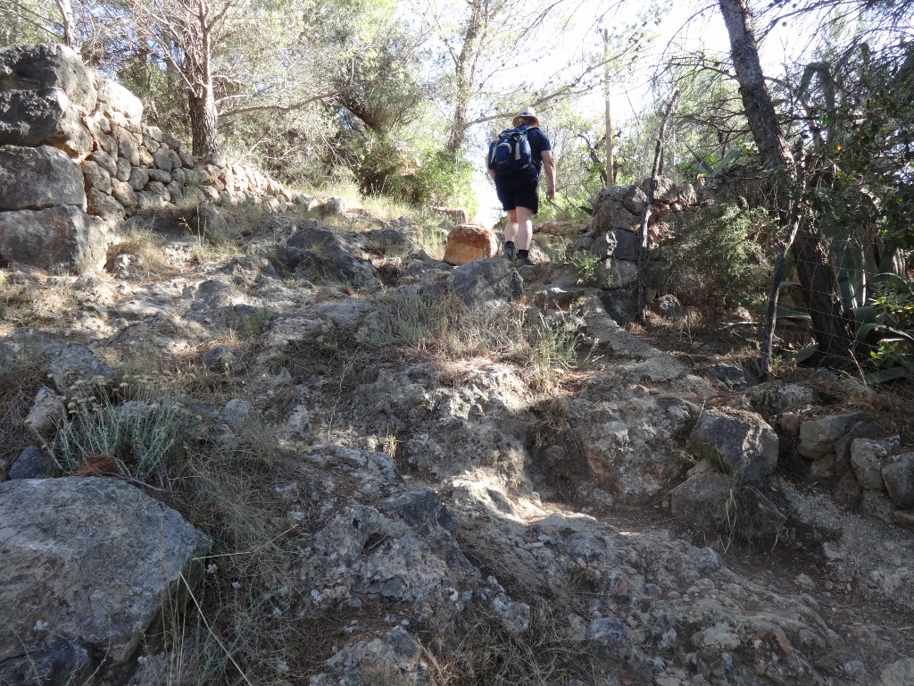 Am tiefsten Punkt des Tales steht die Finca Balitx, hier soll es frischen O-Saft und andere Getränke geben, aber nix isses, niemand zu Hause. So nehmen wir ungestärkt den nächsten Anstieg in Angriff und der kostet uns alle Kraft. Es geht wüste, wilde Wege und Stufen nach oben. Oft muss man echt kraxeln, weil die Stufen und Steine ein normales Gehen gar nicht zulassen. Zu allem noch dazu kommt, dass die Sonne genau auf den Hang brennt und es kaum mal schattige Stellen gibt. Die letzten Meter bis zum Pass führen auf einem Weg (in unserer Beschreibung als Schotterstraße tituliert), der kaum begehbar ist. Hier ist anscheinend ein Teil der Berges abgerutscht, auf jeden Fall ist der Weg die reine Geröllhalde.