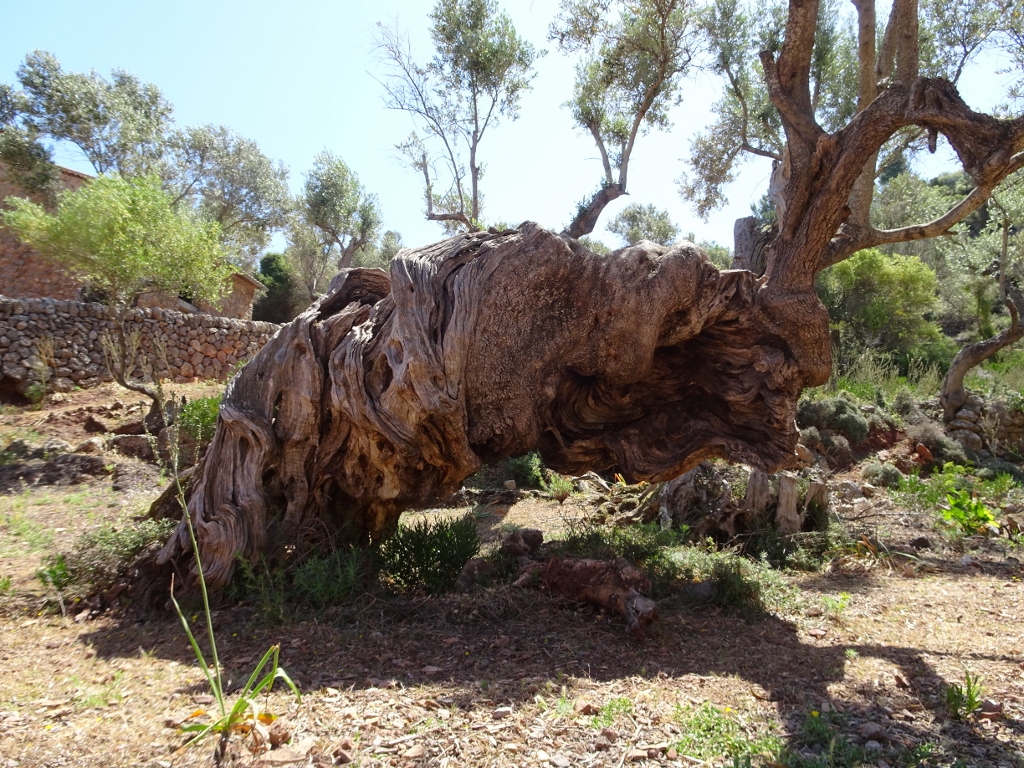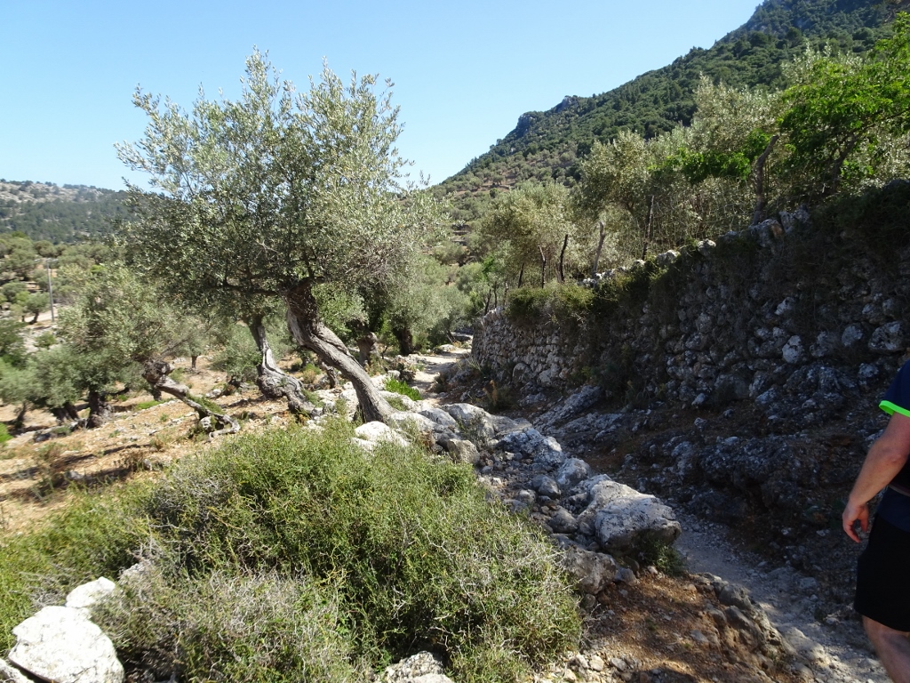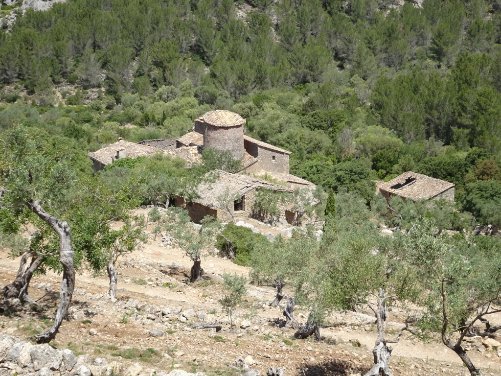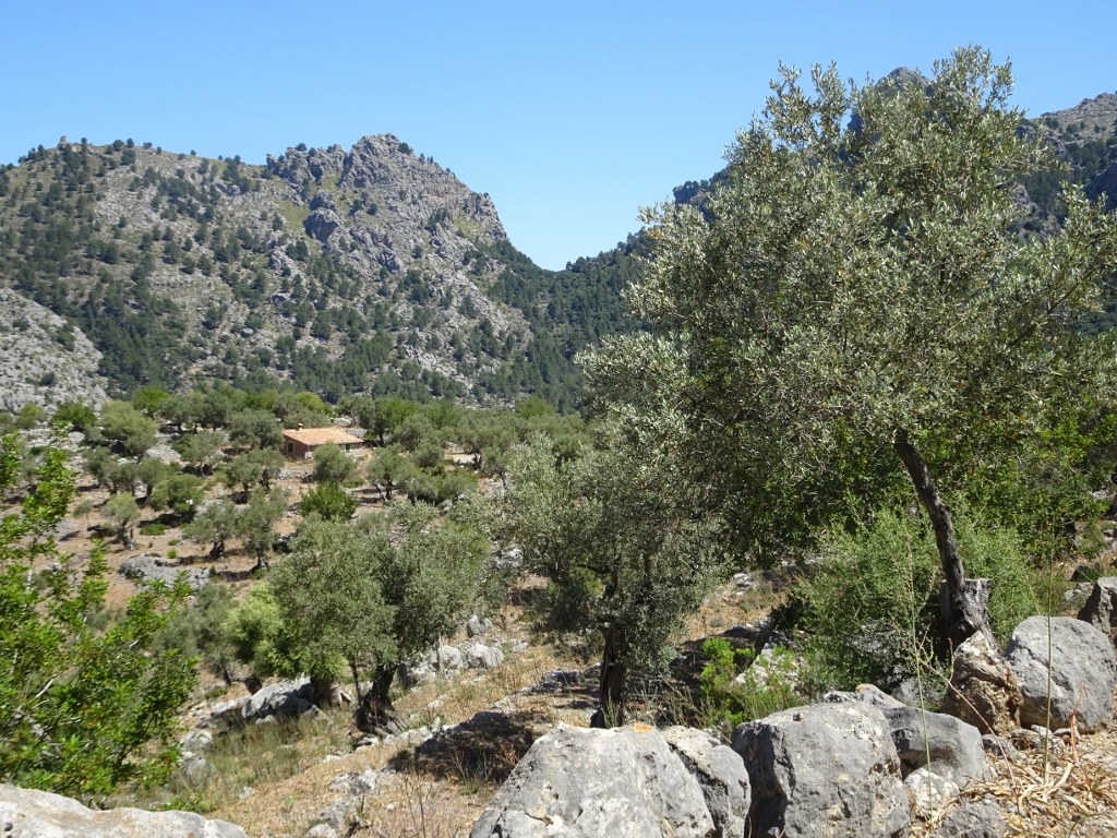 Von hier geht es nun zuerst sacht, dann immer steiler in ein Tal, wo wir am tiefsten Punkt die Finca Balitx finden werden. Durch Olivenhaine und brache Felder geht es über staubige Schotterstraßen und steinige Pflasterwege, hier weht kein Lüftchen und es hat mittlerweile 30°C, dass es uns die Schweißperlen aus allen Poren drückt. Und über uns kreisen schon die Geier. Hier gibt es nämlich reichlich Mönchsgeier, mit bis zu 3 Metern Spannweite der größte Vogel Europas. Wir sehen einige und machen unsere Witze darüber, warum die wohl gerade hier über uns kreisen. Noch fühlen wir uns gar nicht so schlapp. Noch…