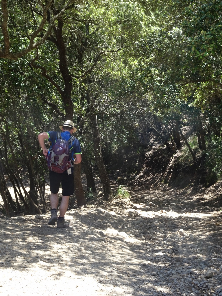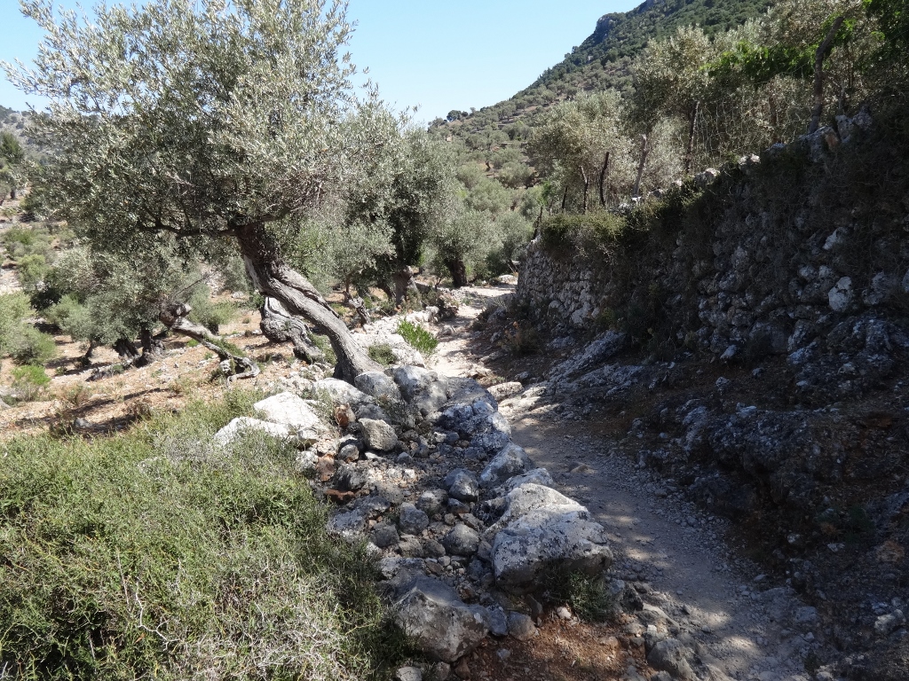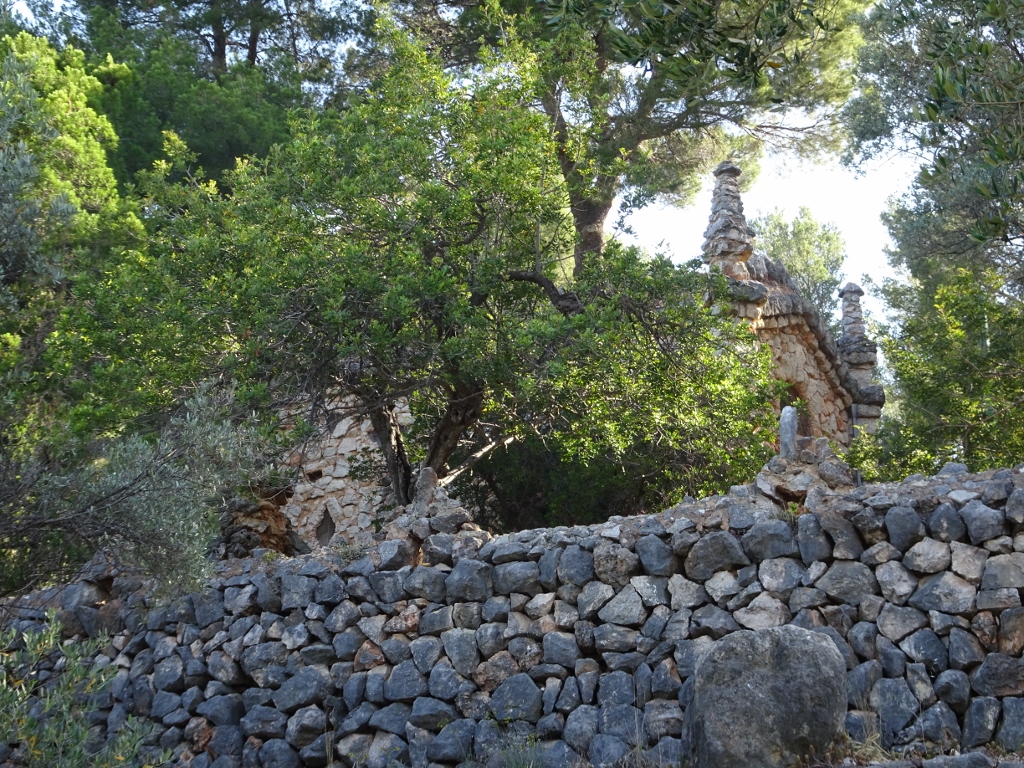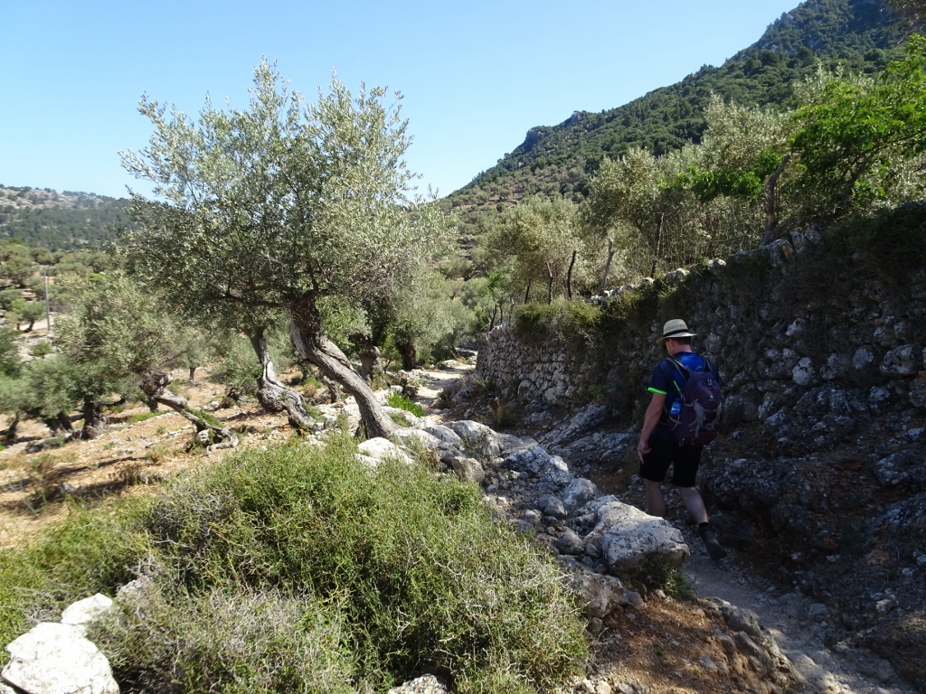 Von hier geht es nun zuerst sacht, dann immer steiler in ein Tal, wo wir am tiefsten Punkt die Finca Balitx finden werden. Durch Olivenhaine und brache Felder geht es über staubige Schotterstraßen und steinige Pflasterwege, hier weht kein Lüftchen und es hat mittlerweile 30°C, dass es uns die Schweißperlen aus allen Poren drückt. Und über uns kreisen schon die Geier. Hier gibt es nämlich reichlich Mönchsgeier, mit bis zu 3 Metern Spannweite der größte Vogel Europas. Wir sehen einige und machen unsere Witze darüber, warum die wohl gerade hier über uns kreisen. Noch fühlen wir uns gar nicht so schlapp. Noch…