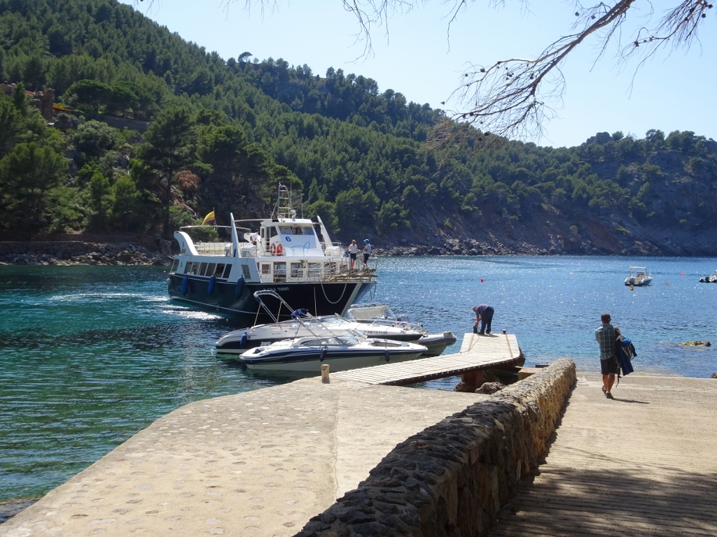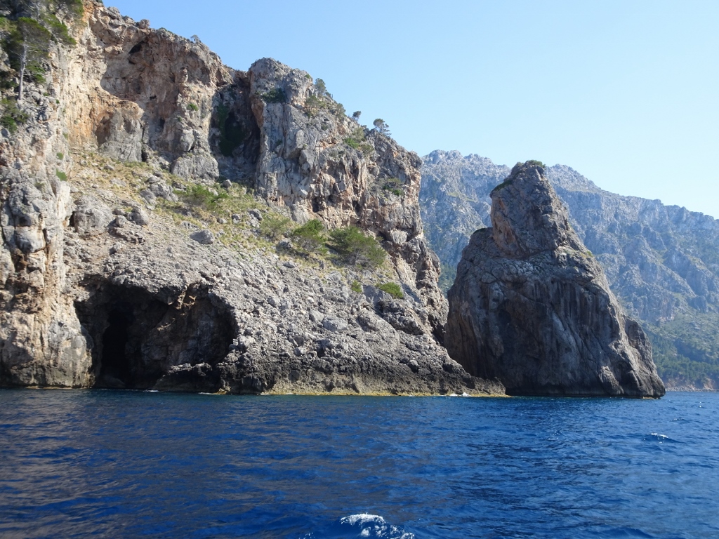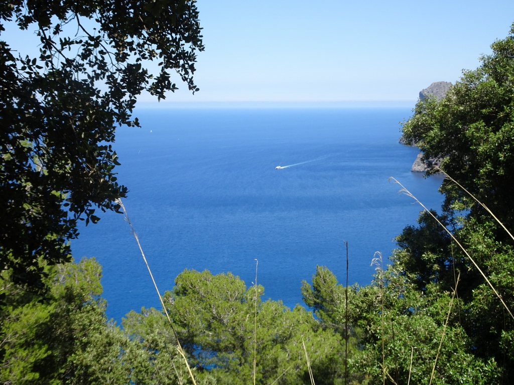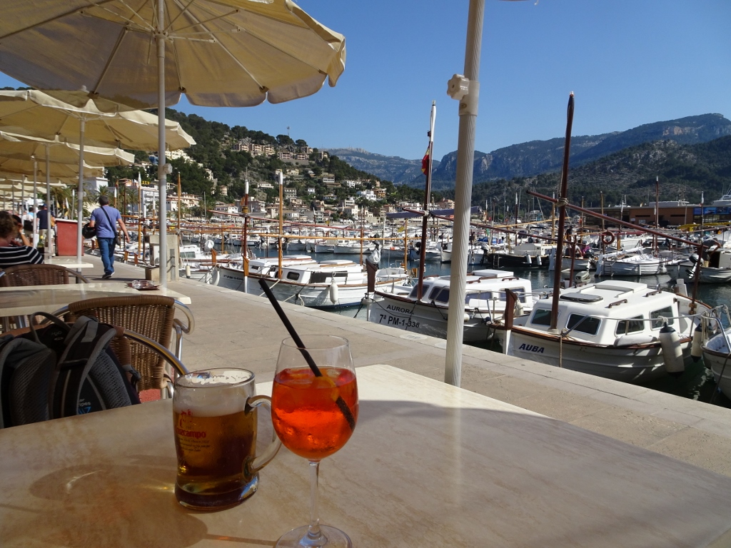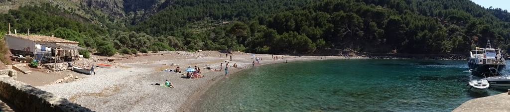 Oben am Pass können wir kaum noch schnaufen und genießen die Frische Prise Wind, die uns jetzt vom Meer her entgegenweht. Es geht steil bergab zur Küste, allerdings müssen wir hochkonzentriert bleiben, denn der Weg ist nach wie vor sehr schwierig. Dafür ist der Ausblick wieder überwältigend, wir sind hier auf dem Küstenweg Sa Costera. Dieser führt uns etliche Kilometer am Meer entlang, bis er zum Ende hin noch einmal heftig ansteigt. Nun ist endgültig Schluss mit lustig, wir können echt nicht mehr und stolpern anschließend mehr als wir gehen zur Küste hinab in die Cala Tuent. Dort gibt es wenigstens in einer Holzhütte kühle Getränke, das Wasser, das wir dabei hatten ist mittlerweile auch lauwarm. Wir sitzen noch ein wenig im Schatten und warten auf das Boot, das uns zurück in den Hafen von Sòller bringt, wo der Tag bei Aperol Spritz und Bierchen mit einem leckeren Abendessen ausklingt.