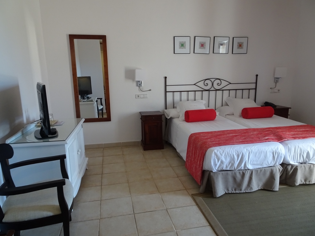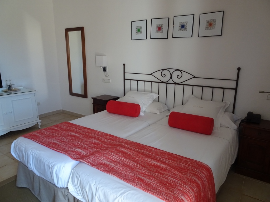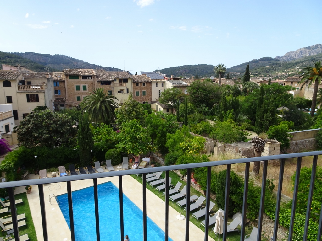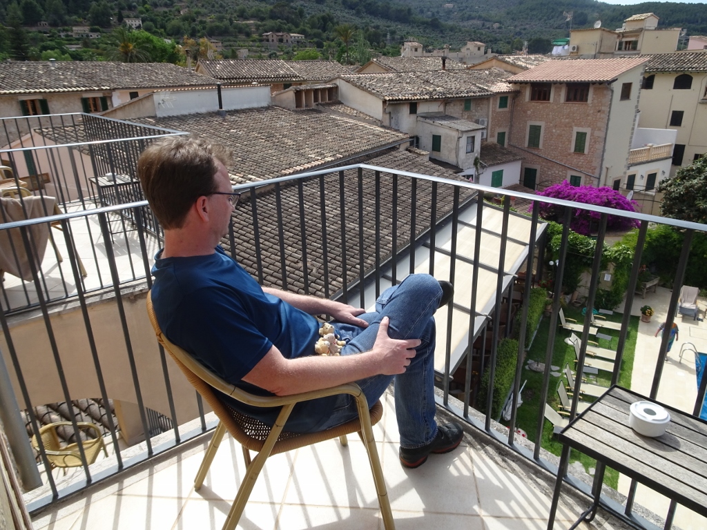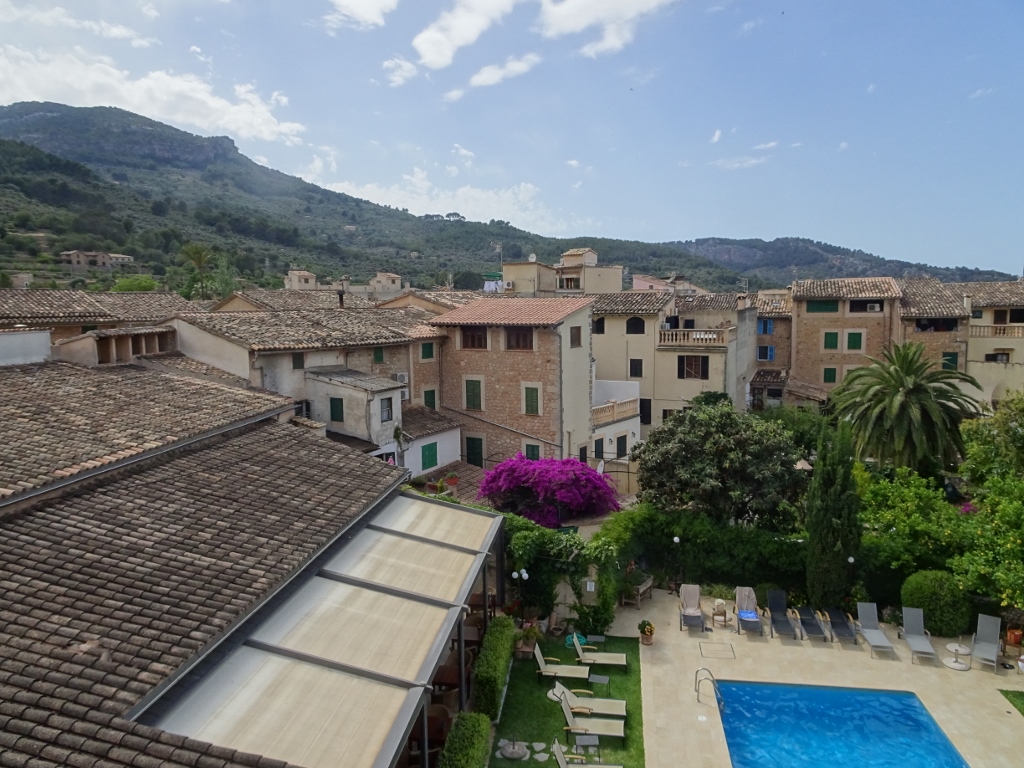 Die Maschine ist dann doch eine ganz schnöde airberlin-Maschine und die Crew ist von TUIFly. Bei dem Chaos, was die Firma verzapft, sind die blutroten Zahlen, die die schreiben wirklich kein Wunder… Die Crew meistert den Flug dann aber routiniert und nach nicht einmal 2 Stunden landen wir in Palma de Mallorca. Wir warten dann kurz auf unsere Koffer und schon wenige Minuten später sitzen wir im Taxi in Richtung Soller. Wir müssen auf keinen Bustransfer o.ä. warten, da wir alles selbst organisiert haben, hatten wir uns gar keine weiteren Gedanken über den Transfer nach Soller gemacht, sondern gleich an ein Taxi gedacht, das klappt auch sofort und ohne Verzögerungen. Der Fahrer ist dann in Soller ein bisschen planlos, schließlich fragt er dann doch noch mal sein Navi und schon ist das Hotel gefunden. Eine alte ausgebaute Ölmühle, am Rande der kleinen Stadt. Ein wunderschönes Haus und ein tolles Zimmer mit Balkon, der Ausblick auf die Berge ist nicht zu beschreiben, da freu ich mich ja schon auf unsere Wandertouren.