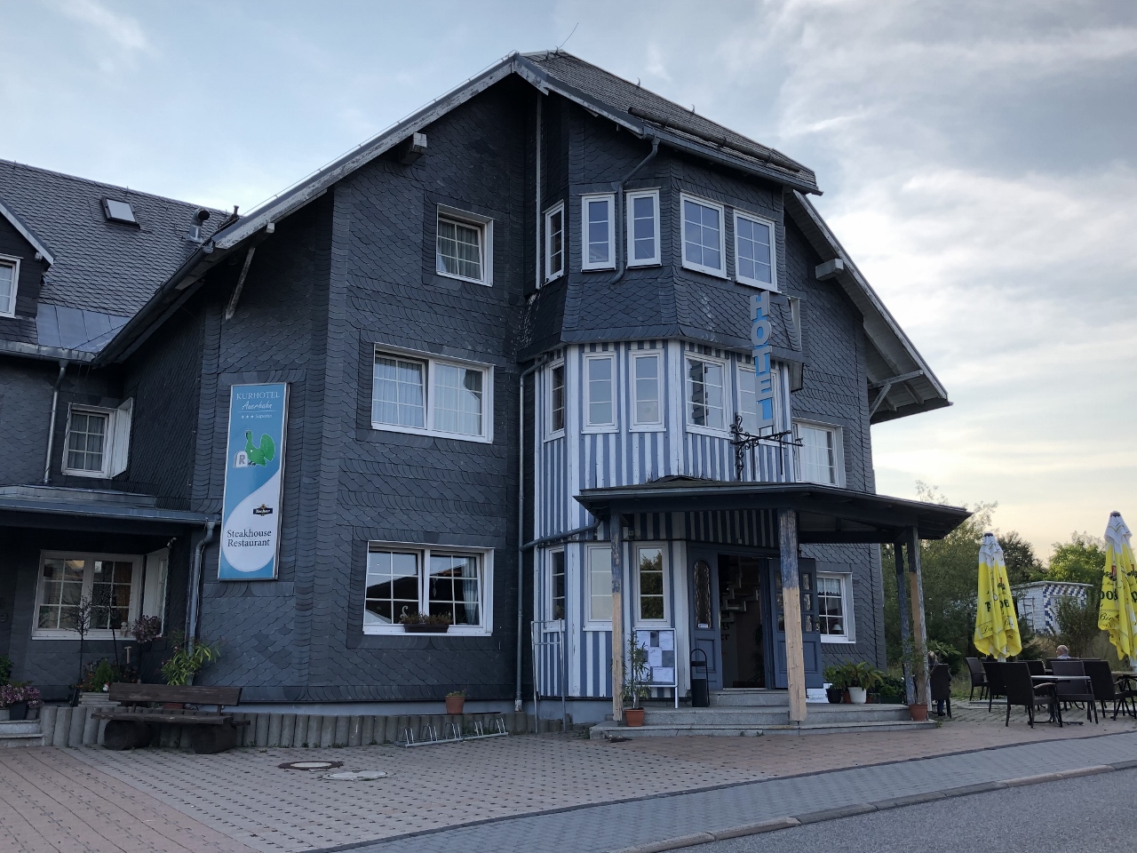 Nach einer Kurzbesichtigung des Aussichtsturmes geht es steil bergab zum heutigen Ziel Masserberg. Direkt am Ortseingang nehmen wir nochmal eine kleine Stärkung um dann problemlos unser Hotel zu finden und einzuchecken. Ich frage gleich mal, ob wir hier was zu essen bekommen würden, worauf sich die Wirtin recht verschaukelt fühlt, sie kann unsere gestrigen Erlebnisse aus Neuhaus nicht glauben.