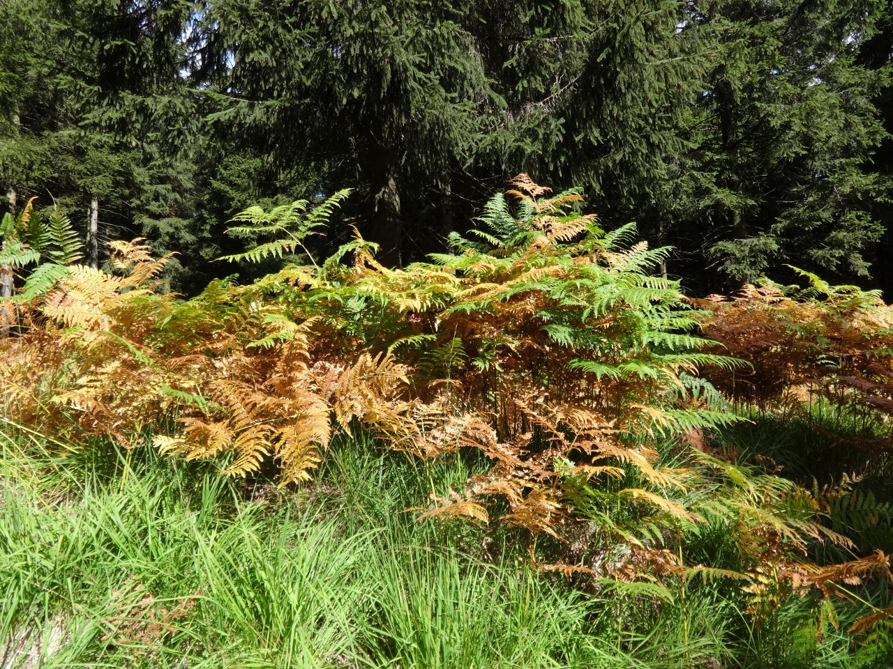 Anschließend ziehen wir, frisch gestärkt weiter und erreichen wenige Kilometer später die Ebertswiese und den Bergsee Ebertswiese. Die Ebertswiese wird als das schönste Hochplateau des Thüringer Waldes gepriesen und hat auch ein zauberhaft ruhiges Flair. Was vielleicht auch daran liegt, dass das hier gelegene Hotel geschlossen ist, wegen Wassermangels. Die Quelle, von der das Hotel das Wasser bezieht bietet nicht mehr ausreichend Wasser, die trockenen Jahre machen sich bemerkbar. Eigentlich hätten wir hier übernachten sollen, aber so müssen wir noch ein paar Kilometer weiter, zunächst zum Bergsee Ebertswiese, wobei der Begriff "See" schon eine sehr euphorische Übertreibung darstellt.