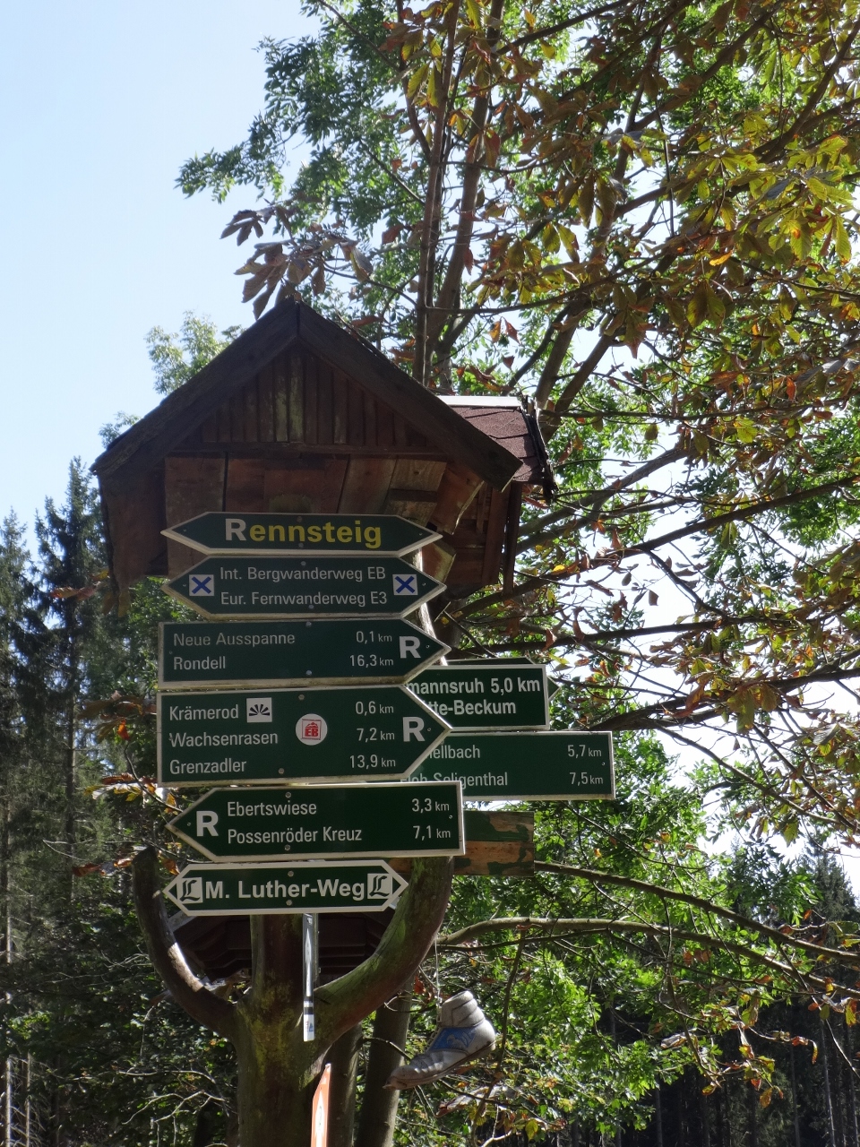 Vom Grenzadler wandern wir in den Wald, es wird einsamer und ruhiger, jetzt sind wir wirklich in der Einsamkeit des Thüringer Waldes. Man könnte Angst bekommen...