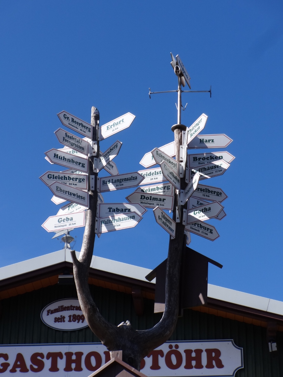 Während ich so vor mich hinwandere und gemeinsam mit den Gesellen in meinem Rucksack thüringisches Liedgut pflege, welches uns in der Oberhofer Kneipe so großzügig beigebracht wurde, kann ich zwischendurch immer mal wieder einen Blick auf den Großen Insel(s)berg werfen (offiziell ohne "s", aber beide Schreibweisen sieht man auf den Wegweisern). Dort hinauf, auf den Berg mit dem markanten Turm will ich noch.