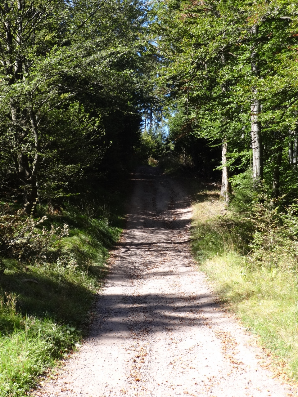 Von hier weg sollte es für heute nur noch bergab gehen, das wird bis auf wenige kleine Anstiege auch tatsächlich so sein. Es geht zunächst durch ein "Totalreservat", den Begriff hatte ich bis dahin auch noch nie gehört. Das bedeutet wohl, dass der Wald vollkommen unbewirtschaftet sich selbst überlassen bleibt. Das schien mir bisher auch schon der Fall gewesen zu sein, weite Bereiche, die wir bisher durchwandert hatten, wirkten sehr verwildert, naturbelassen. Vielleicht brauchte man auch einfach nur einen knalligen Namen, um eine weitere Hinweistafel ins "Totalreservat" zu stellen. Auf jeden Fall ist hier sofort wieder Ruhe, die Besucherströme konzentrieren sich auf den Gipfel und die Wege auf der anderen Seite