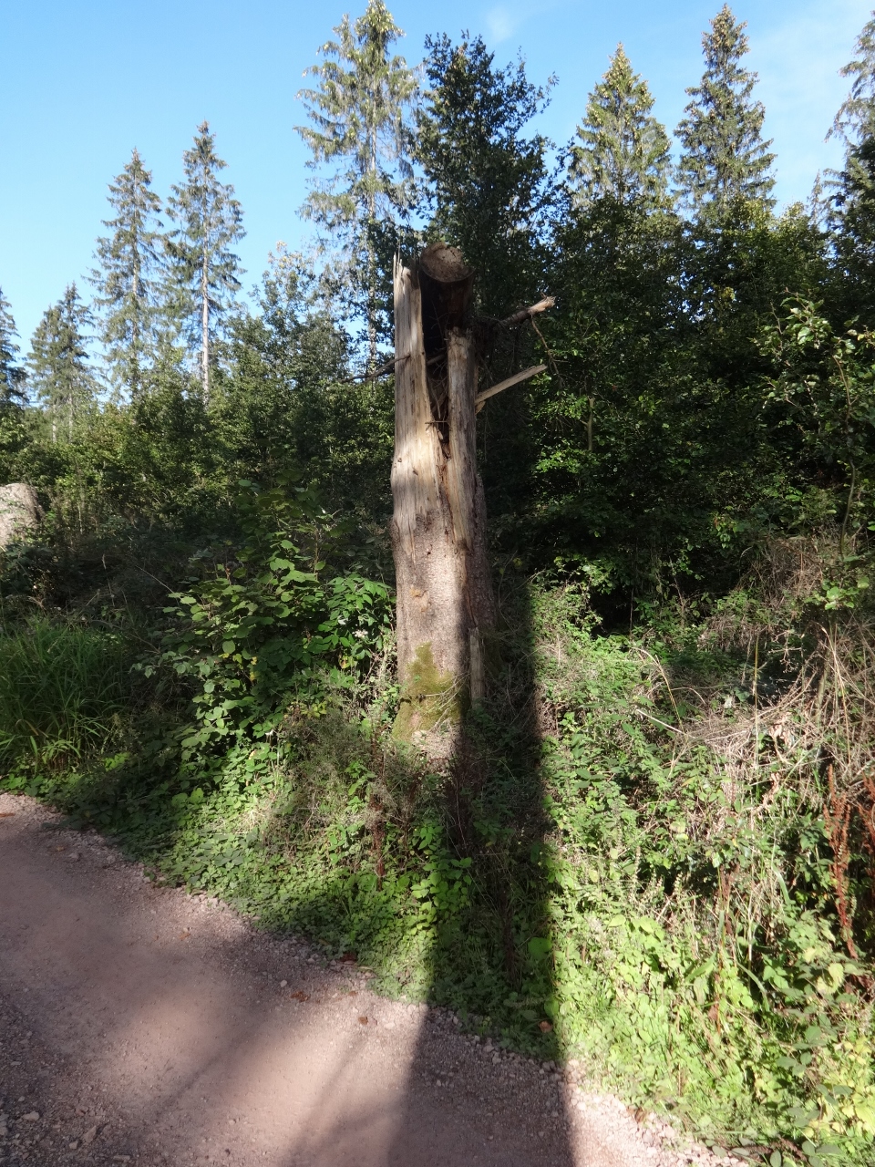 Vorbei an ein wenig Kunst stellen wir hier am Westhang des Thüringer Waldes doch massive Waldschäden fest. Wie schon berichtet, bisher sah der Wald fast durchgehend grün, üppig und gesund aus. Hier zeigt sich nun ein anderes Bild. Teils kleinere Gruppen, manchmal ein ganzer Hang komplett vertrockneter Bäume. Ohne Frage sieht man hier die Trockenheit der vergangenen Jahre, ohne deshalb gleich in Klimawandel-Weltuntergangspanik verfallen zu müssen. Interessanterweise immer Nadelbäume, Flachwurzler sind halt einfach anfälliger, da ist die gute alte deutsche Eiche stabiler.