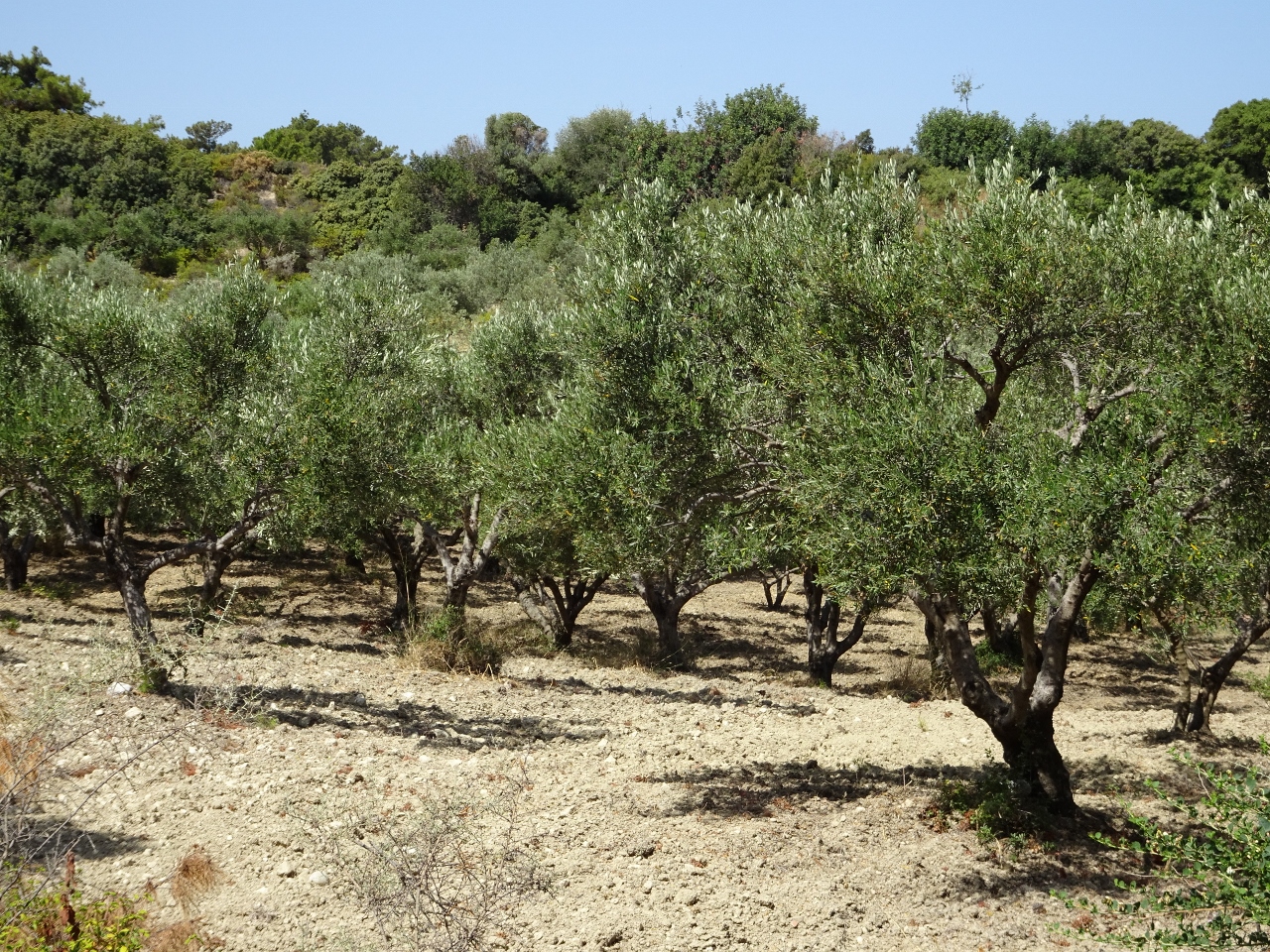 Olivenhain und natürlich bergauf. Wir überqueren eine Hügelkette und sehen von oben auf die Küste, man sieht sogar das türkische Festland auf der