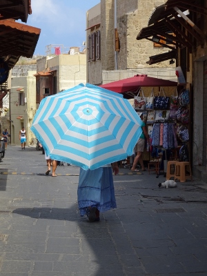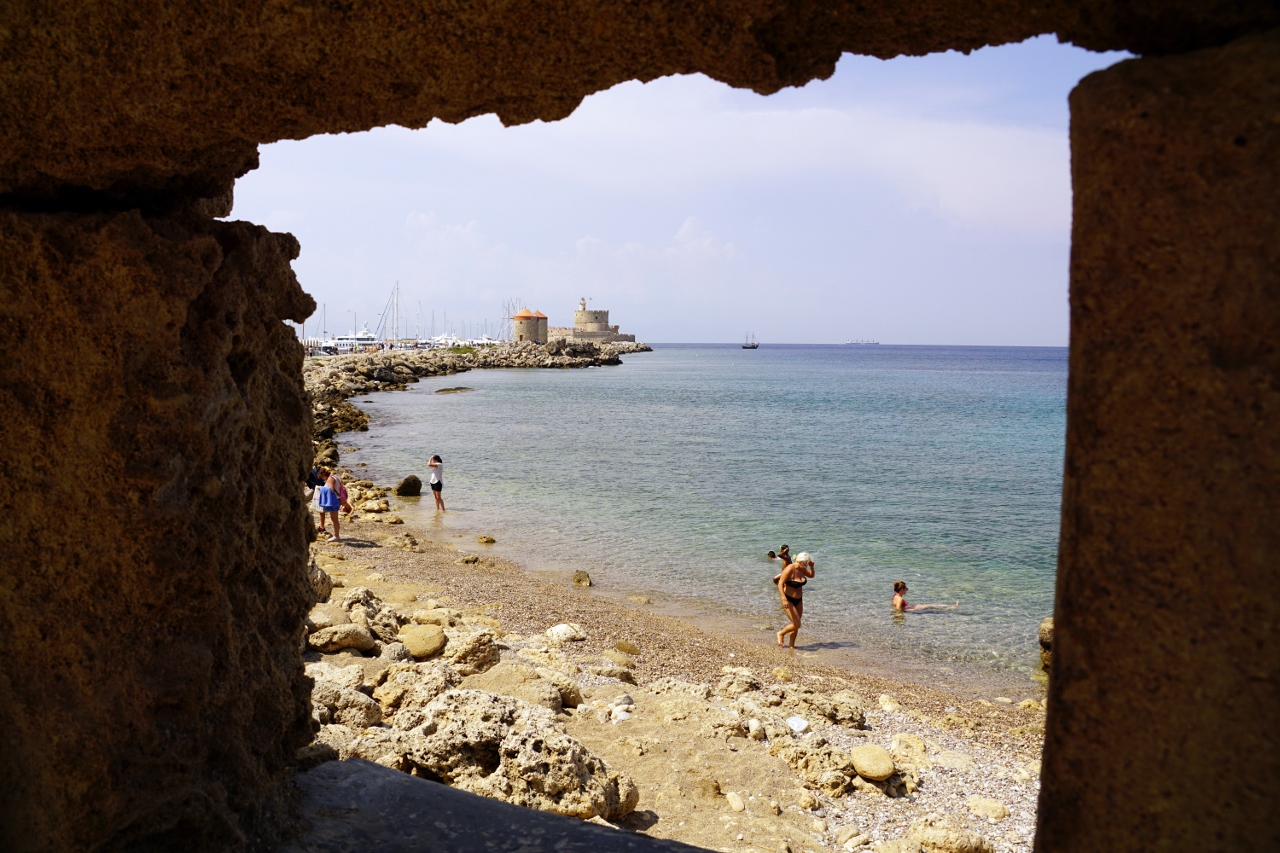 gehen zum Strand. Da der Stadtstrand in Rhodos ein Kiesstrand
