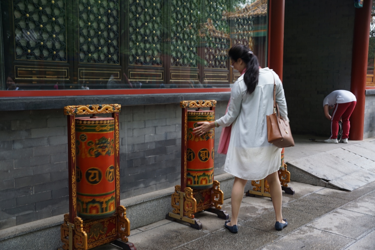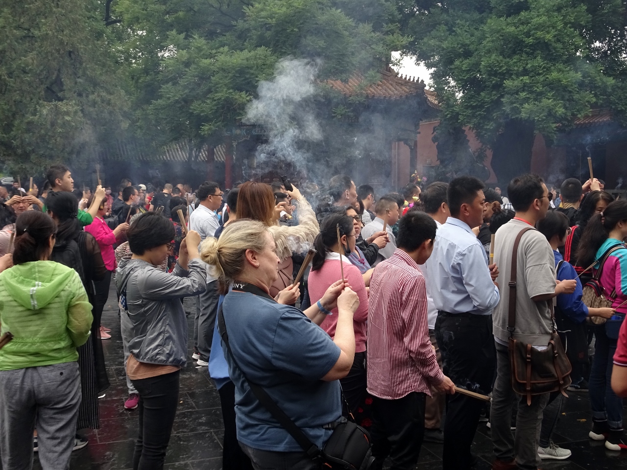 Es handelt sich hier um eine buddhistische Tempelanlage, die viele tibetanische Elemente enthält, da sie zu einer Zeit erbaut wurde, als das chinesische Kaiserreich die Nähe zu seinen Nachbarn Tibet und Mongolei suchte. Wir müssen zunächst vor dem Tor als auch dann im Innenhof anstehen, da der Besucherandrang recht groß ist. Aber die allermeisten stehen hier nicht zum Sightseeing an, sondern sind tatsächlich gekommen um zu beten und Opfergaben darzubringen. Mir war nicht bewußt, wie religiös die Chinesen sind, ca. 70% sind praktizierende Buddhisten, wie uns Kelly erzählt.