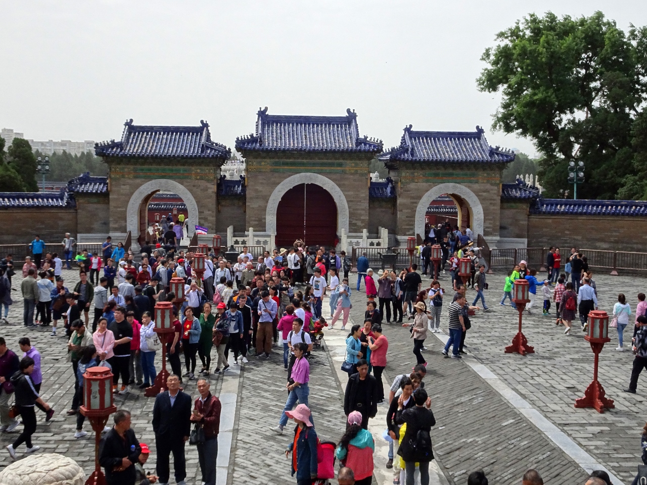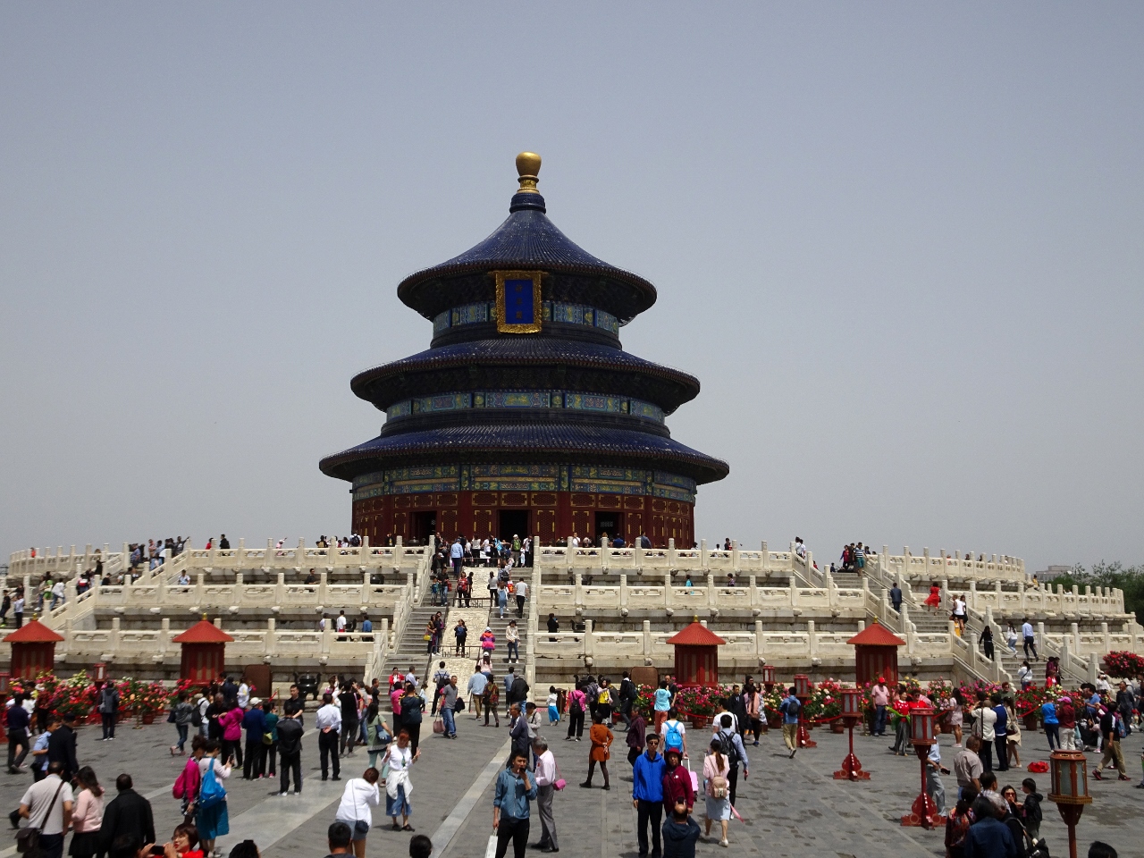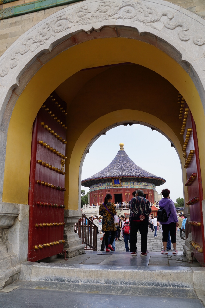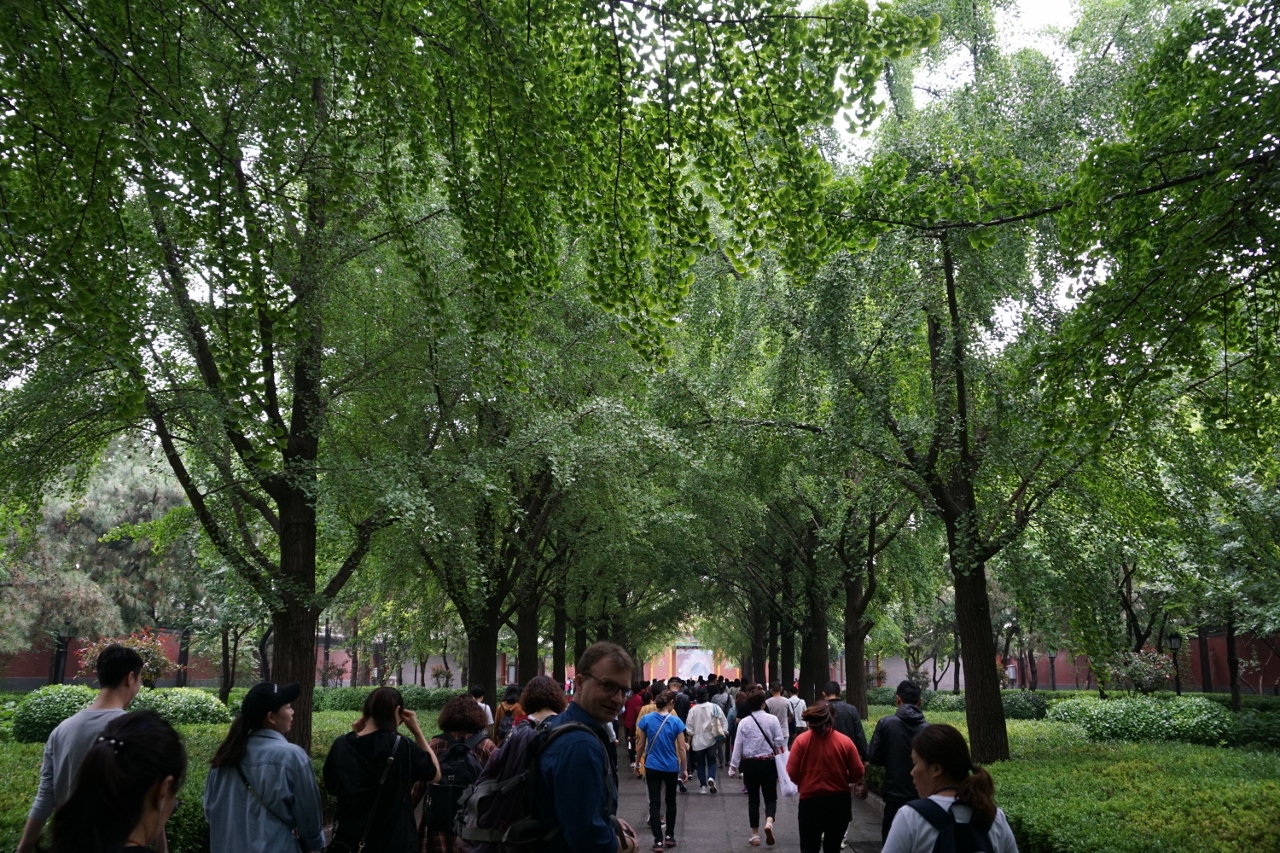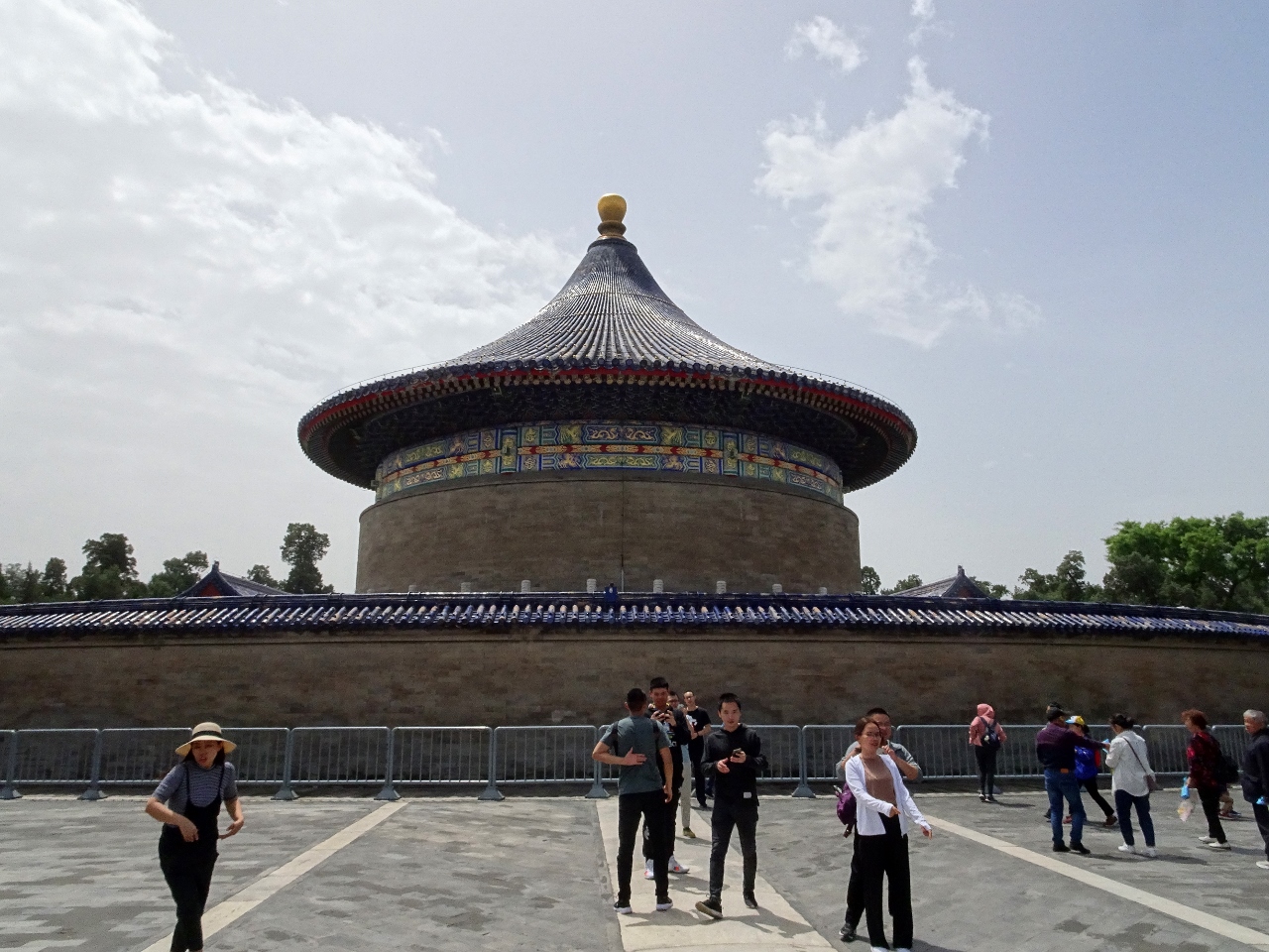 Hierbei handelt es sich nicht (mehr) um einen religiösen Ort, sondern die riesige Parkanlage (ca. 270 ha!) ist ein beliebtes Ausflugsziel der Pekinger. Die Außenmauer des Tempels ist quadratisch, der Tempel selbst ist rund. Das Quadrat symbolisiert die Erde, der Kreis den Himmel. Hier ist nämlich der Ort, an dem der jeweilig amtierende Kaiser zweimal im Jahr zu Himmel und Erde sprach um für eine gute Ernte zu beten. Wir werden vertraut gemacht mit einer Menge Riten und Geschichten, alles können wir gar nicht behalten.