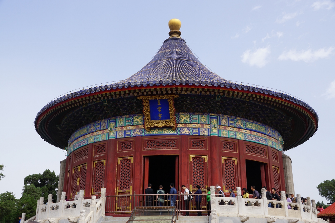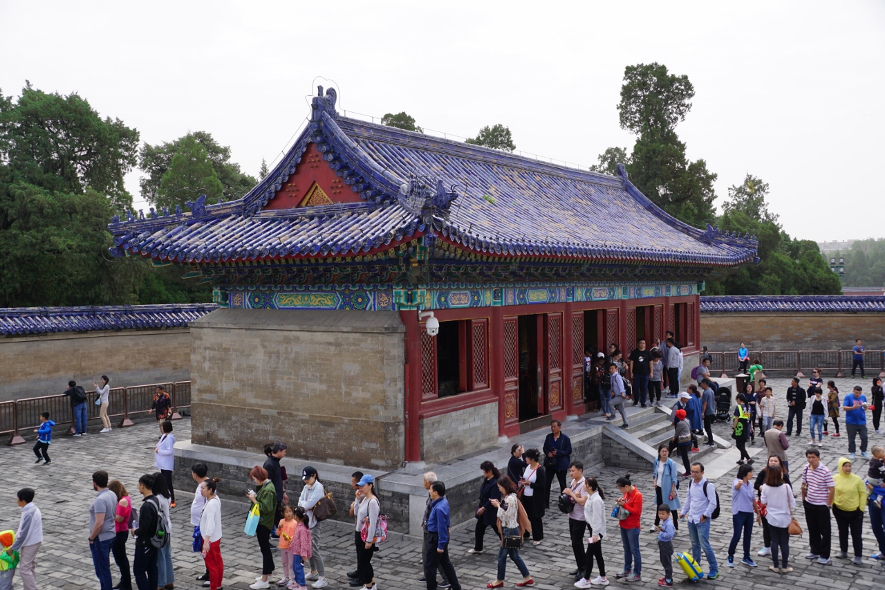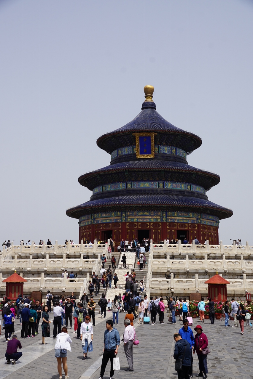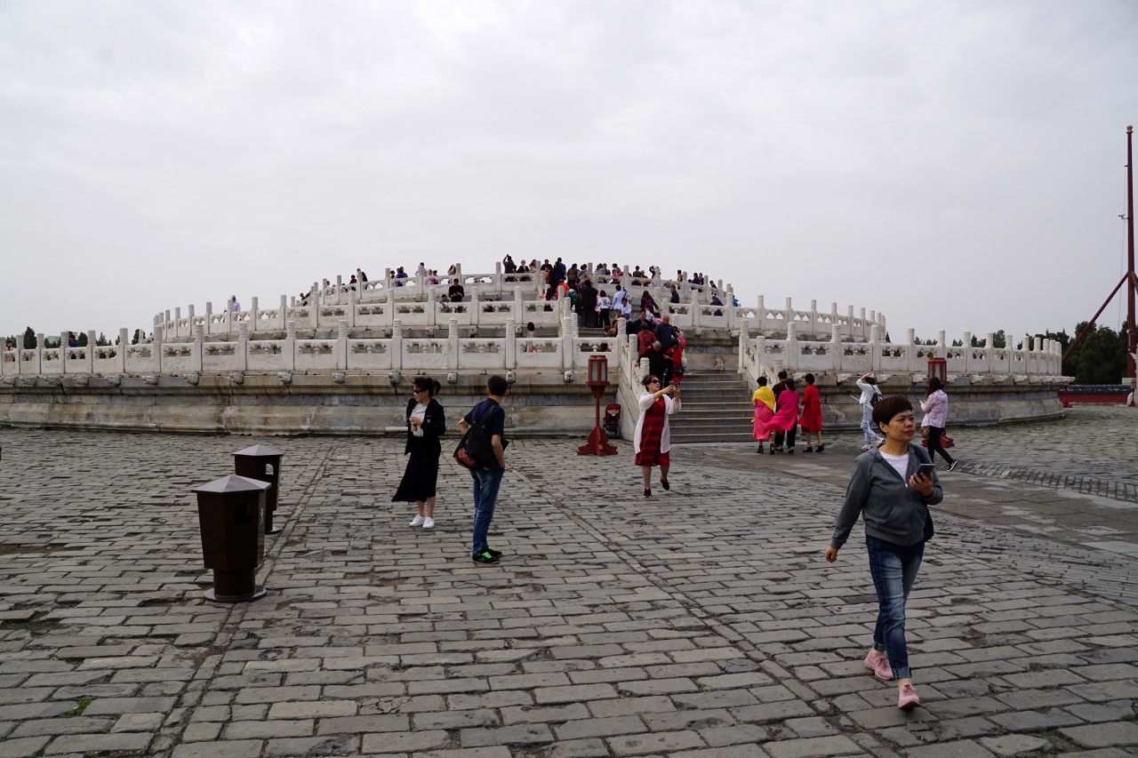 Hierbei handelt es sich nicht (mehr) um einen religiösen Ort, sondern die riesige Parkanlage (ca. 270 ha!) ist ein beliebtes Ausflugsziel der Pekinger. Die Außenmauer des Tempels ist quadratisch, der Tempel selbst ist rund. Das Quadrat symbolisiert die Erde, der Kreis den Himmel. Hier ist nämlich der Ort, an dem der jeweilig amtierende Kaiser zweimal im Jahr zu Himmel und Erde sprach um für eine gute Ernte zu beten. Wir werden vertraut gemacht mit einer Menge Riten und Geschichten, alles können wir gar nicht behalten.