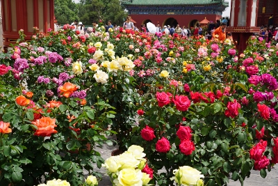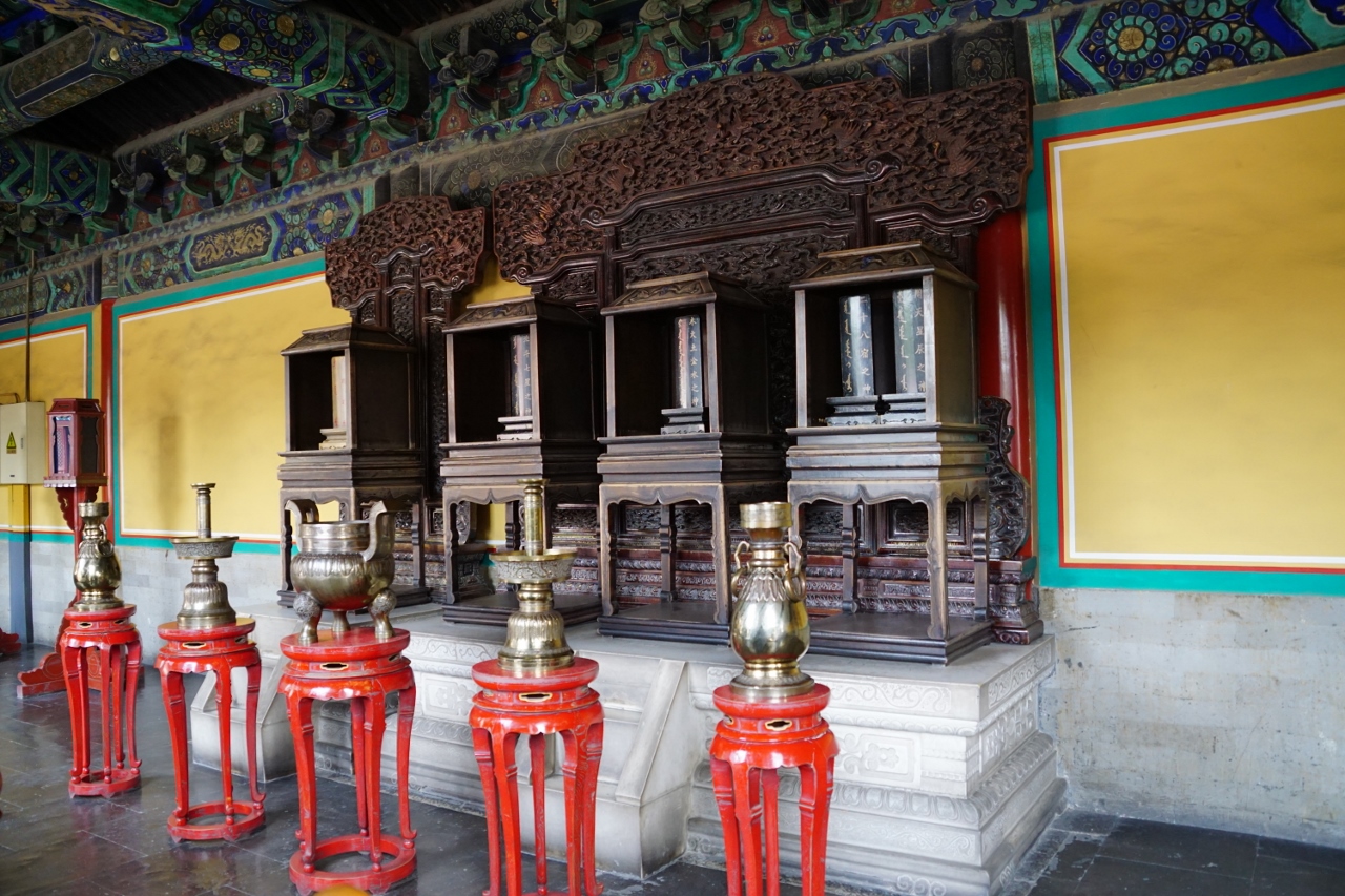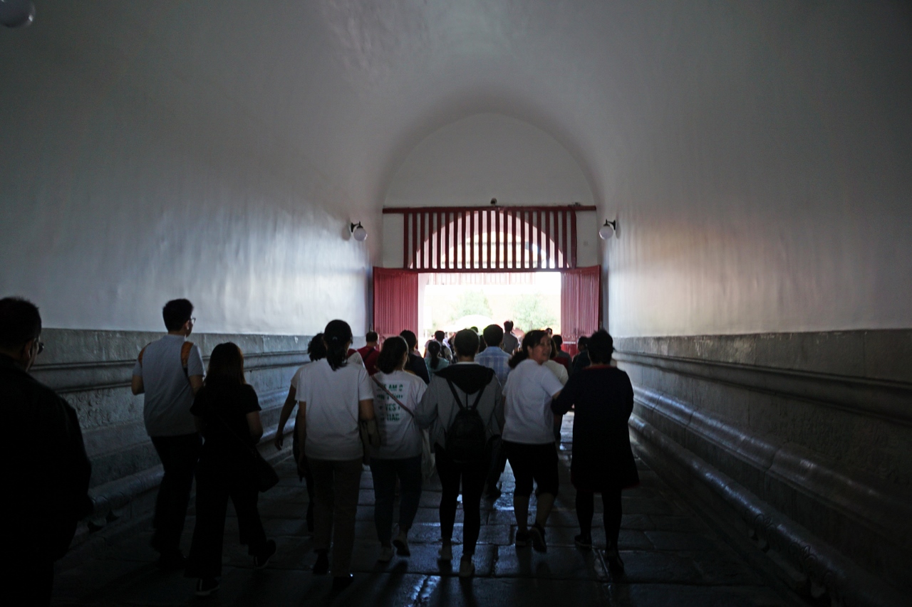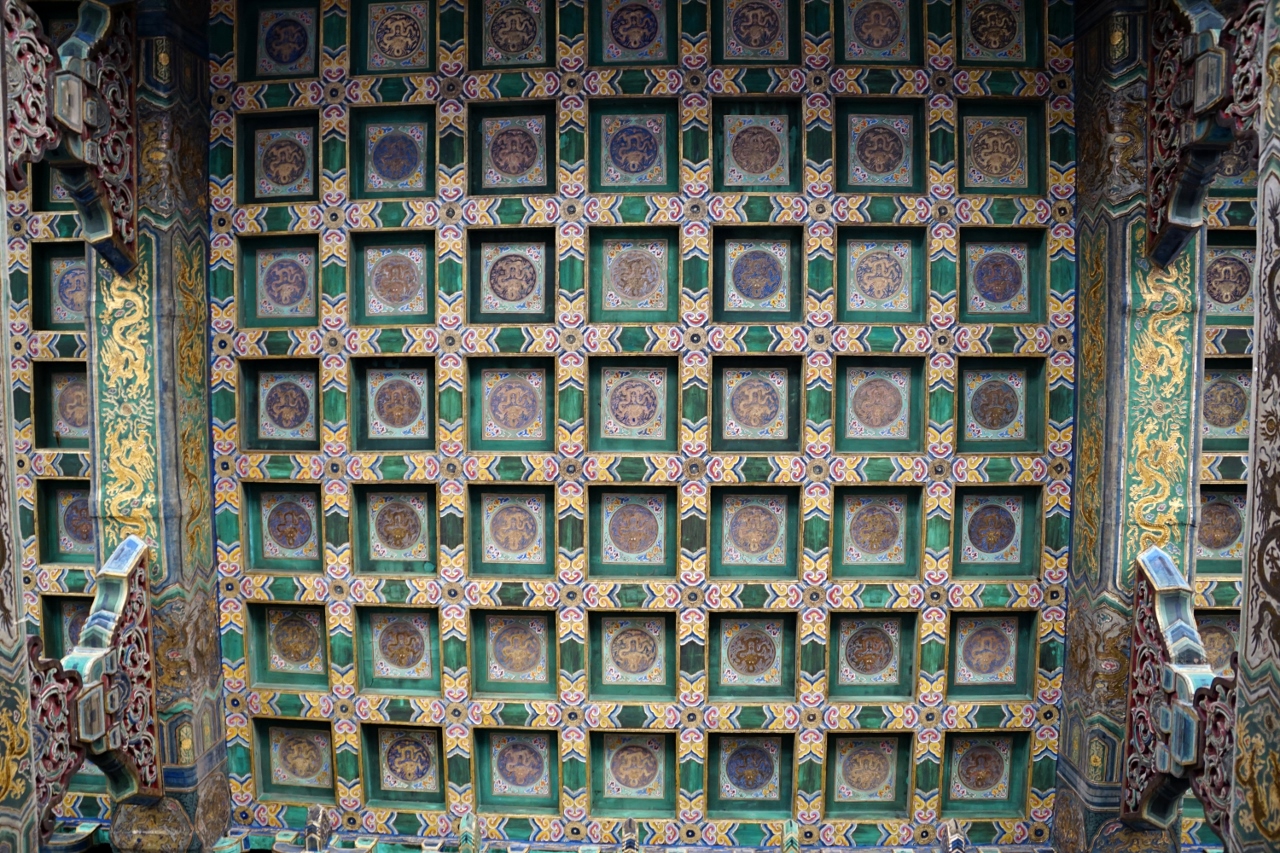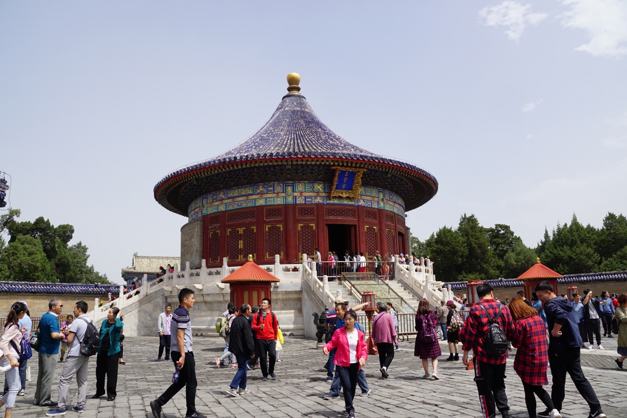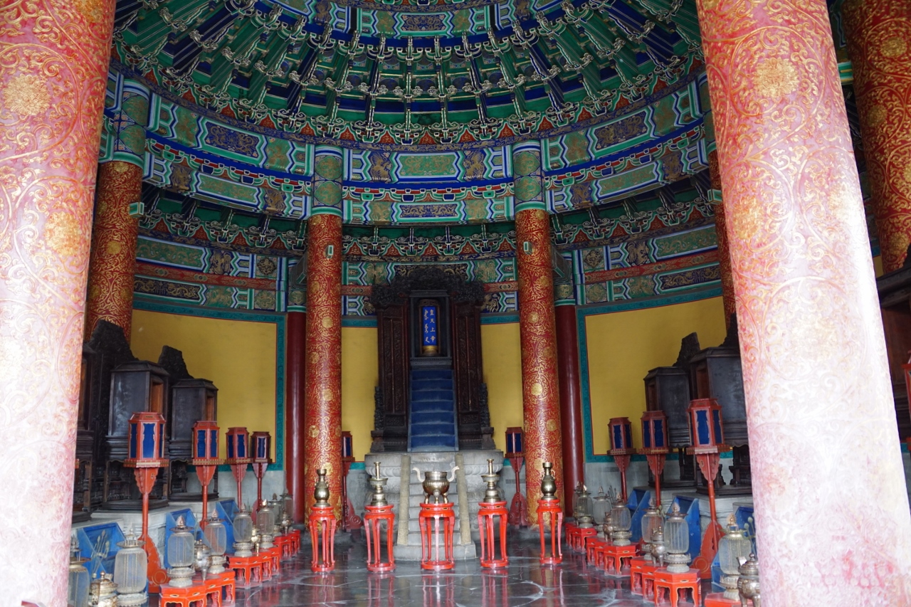 Hierbei handelt es sich nicht (mehr) um einen religiösen Ort, sondern die riesige Parkanlage (ca. 270 ha!) ist ein beliebtes Ausflugsziel der Pekinger. Die Außenmauer des Tempels ist quadratisch, der Tempel selbst ist rund. Das Quadrat symbolisiert die Erde, der Kreis den Himmel. Hier ist nämlich der Ort, an dem der jeweilig amtierende Kaiser zweimal im Jahr zu Himmel und Erde sprach um für eine gute Ernte zu beten. Wir werden vertraut gemacht mit einer Menge Riten und Geschichten, alles können wir gar nicht behalten.