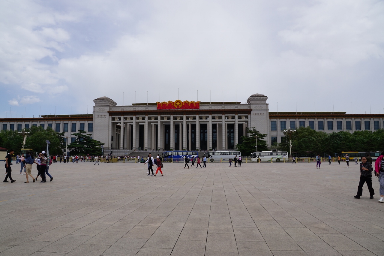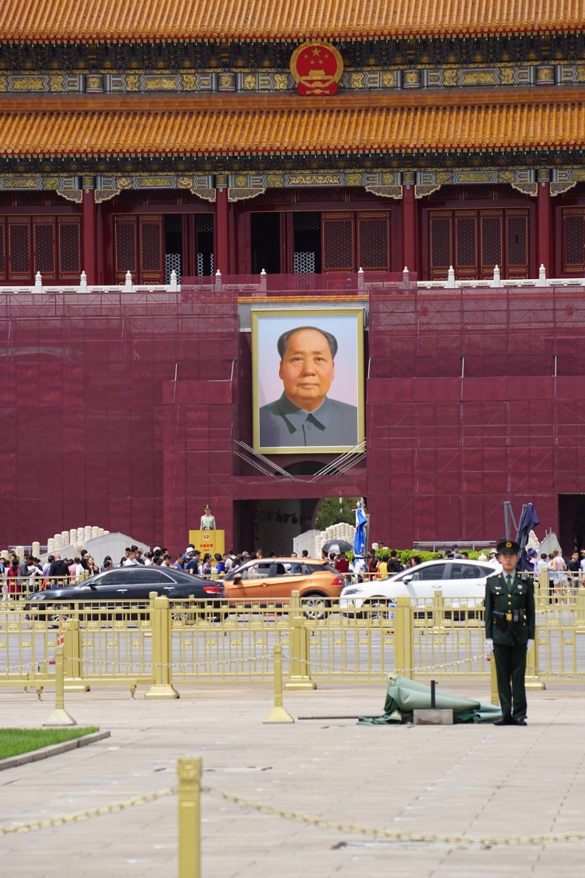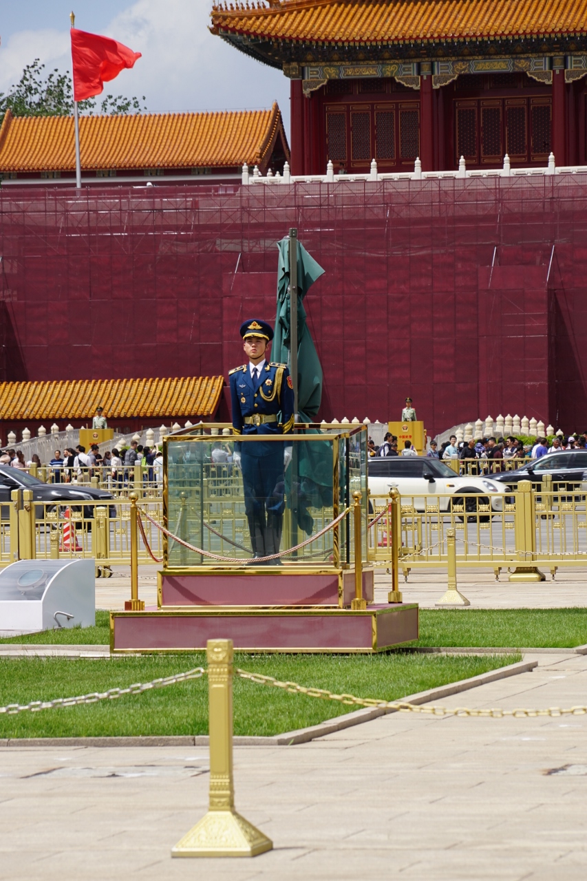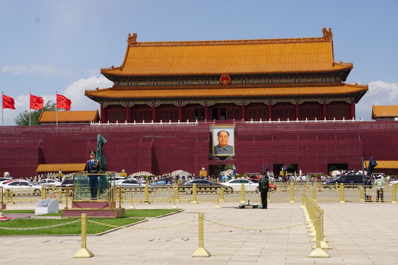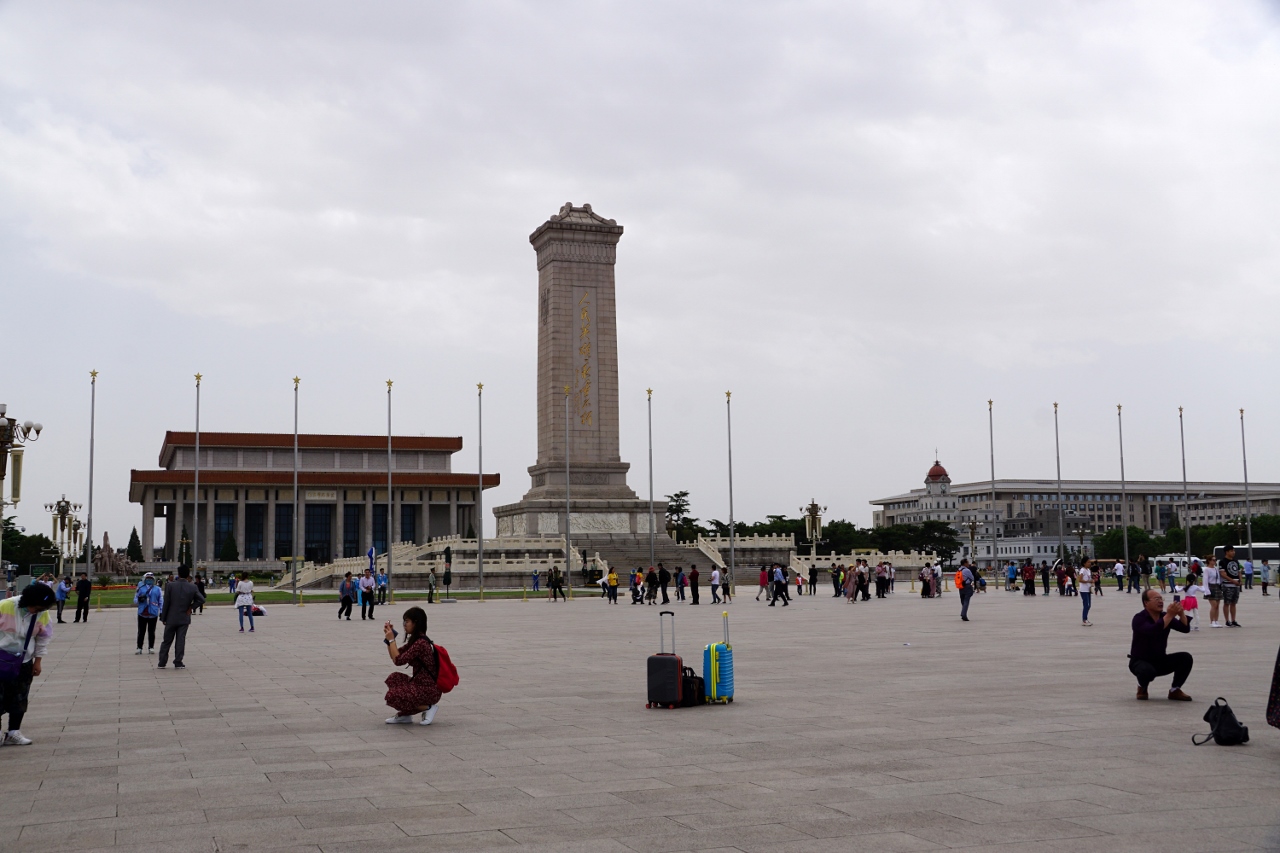 Obwohl bei uns eher wegen der Studentenproteste im Jahr 1989 bekannt, ist der Platz hierzulande noch immer ein nahezu heiliges Nationalsymbol. Eingerahmt von Chinesischem Nationalmuseum und Palast des Volkes, in dem die chinesische Regierung ihre Parteitage u.ä. abhält, steht in der Mitte eine riesige Säule, die die Helden des Volkes, also die Opfer der vergangenen Kriege feiert, sowie eine streng bewachte chinesische Flagge. Und Mao schaut von hinten, dass das alles richtig läuft.
