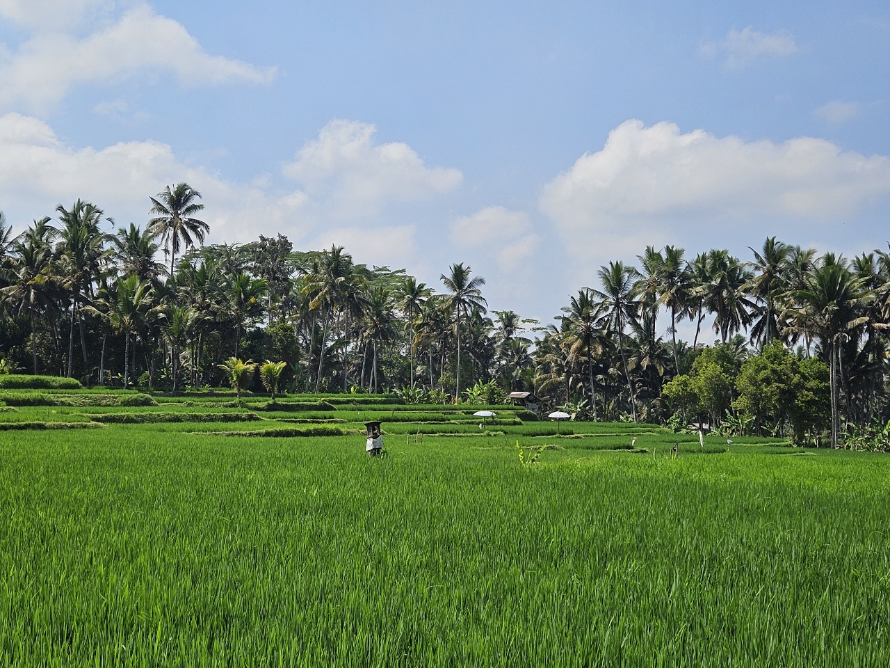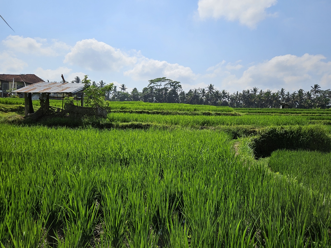 umgeben von Reisfeldern, durch die wir eine kleine Wanderng