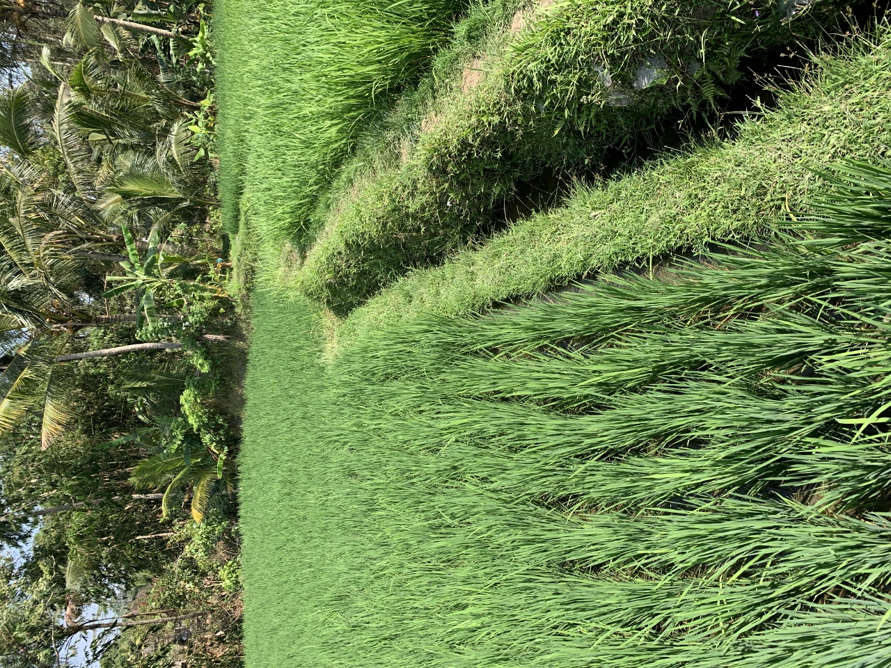 Die Wege zwischen den Reisfeldern sind schmal, oft mit Gras