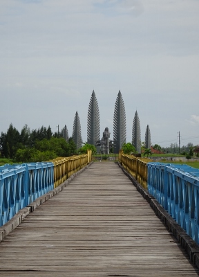 Wir gehen zu Fuß über die Brücke, die bis zur Hälfte hellblau, der Farbe der Vietkong gestrichen ist und auf der anderen Seite gelb, der Farbe des damaligen Südvietnams.
