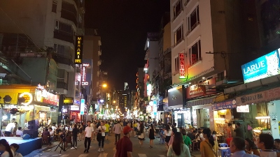 Das Essen ist einigermassen gut in der Bui Vien, trotzdem kehren wir anschliessend ins Hotel zurück um uns zu erholen. Abends kehren wir noch mal in die Straße zurück und stellen fest, dass bei Dunkelheit und greller Neonbeleuchtung alles nicht mehr ganz so schlimm aussieht, aber die Musik oder vielmehr der unsägliche Lärm dieser bescheuerten Elektro-Pop, House- oder sonstwas Beschallung macht den Genuss jedwegen Getränks unmöglich. Das hier ist Ballermann in dreckig und doppelt so laut, sonst gar nix. Natürlich kommt sofort wieder der Einwand "wenn man 20 Jahre jünger wäre", aber ich erinnere mich noch, dass ich bereits vor 30 Jahren nichts mit rhythmusfreiem Bassgewummere und Elektronikgedudel anfangen konnte, speziell dann nicht, wenn davon das Bier im Glas Blasen schlägt und einfach jede Unterhaltung unmöglich ist.