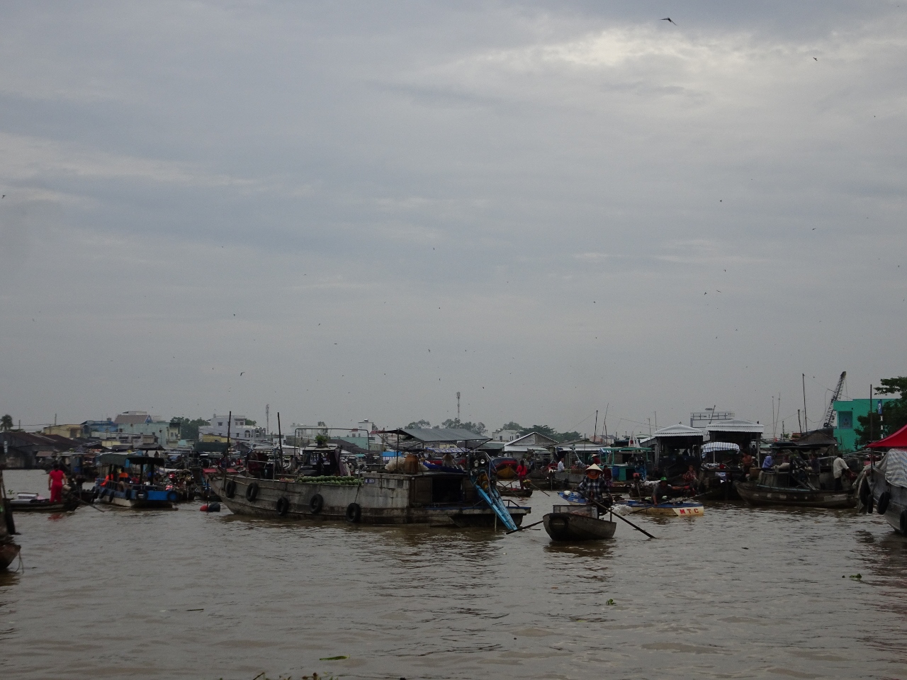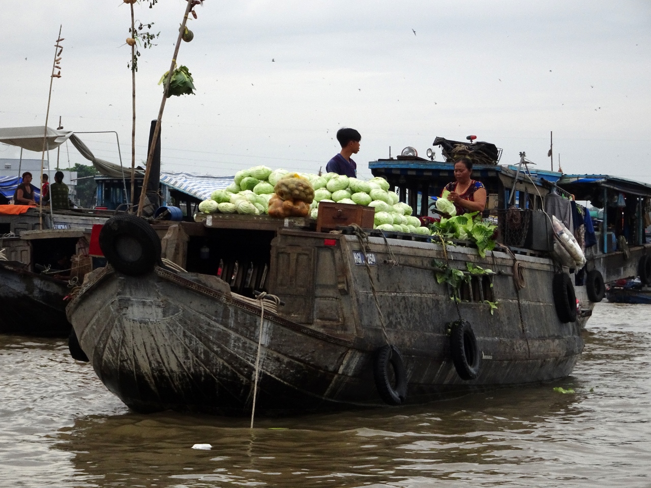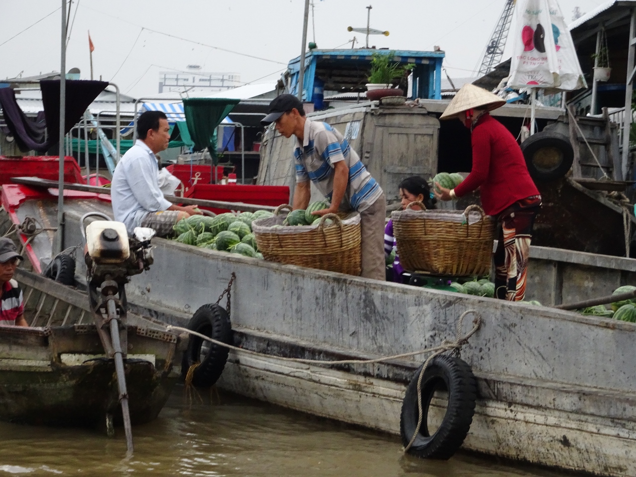 Wir fahren den Song Can Tho, also den Con Tho River, einen Zufluss des Mekong stromaufwärts entlang, bis weit in die Vorstädte von Can Tho. Nach etwa einer dreiviertel Stunde erreichen wir den schwimmenden Marktplatz. Bauern und Händler aus der nahen und weiteren Umgebung kommen hierher und verkaufen ihre Waren, allen voran Obst und Gemüse direkt von den Lastkähnen aus. An jedem Kahn sind an einer langen Stange die angebotenen Produkte angebunden. Händler mit kleinen Booten kommen zu den Lastkähnen und kaufen die Waren ab und verkaufen den Bootlern im Gegenzug, was auf dem Lande nicht zu haben ist.