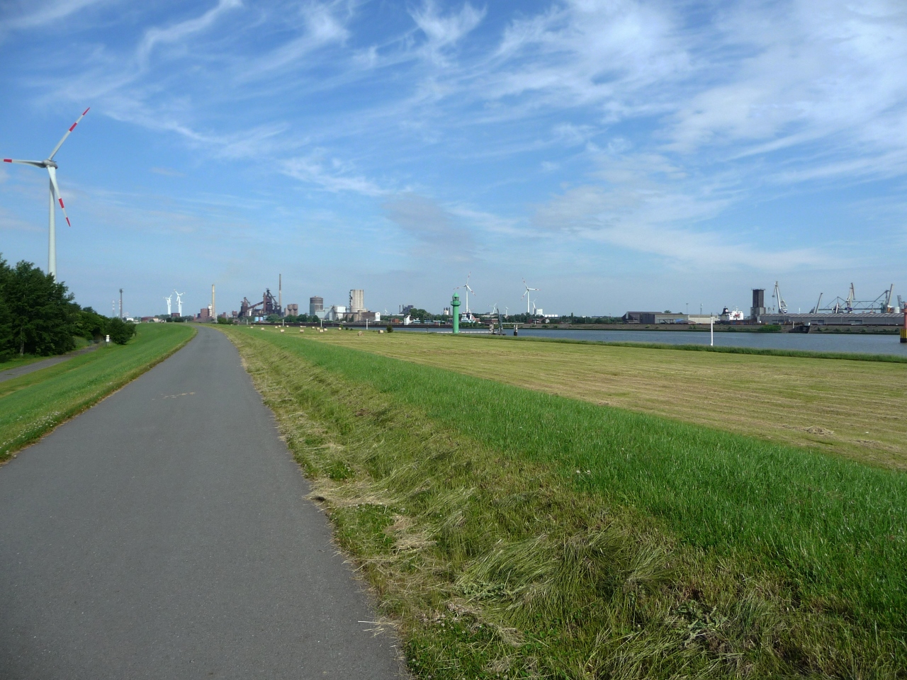 Nachdem wir das Stadtzentrum von Bremen verlassen und den Weserradweg gefunden haben, führt uns dieser zunächst durch ein Industriegebiet. Hier können wir zwar hervorragend