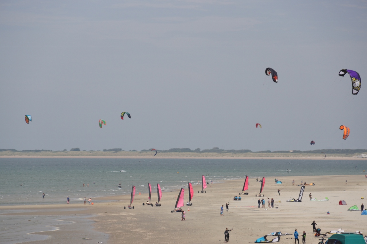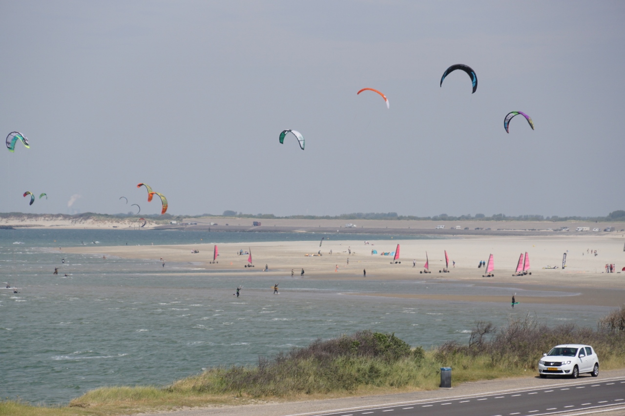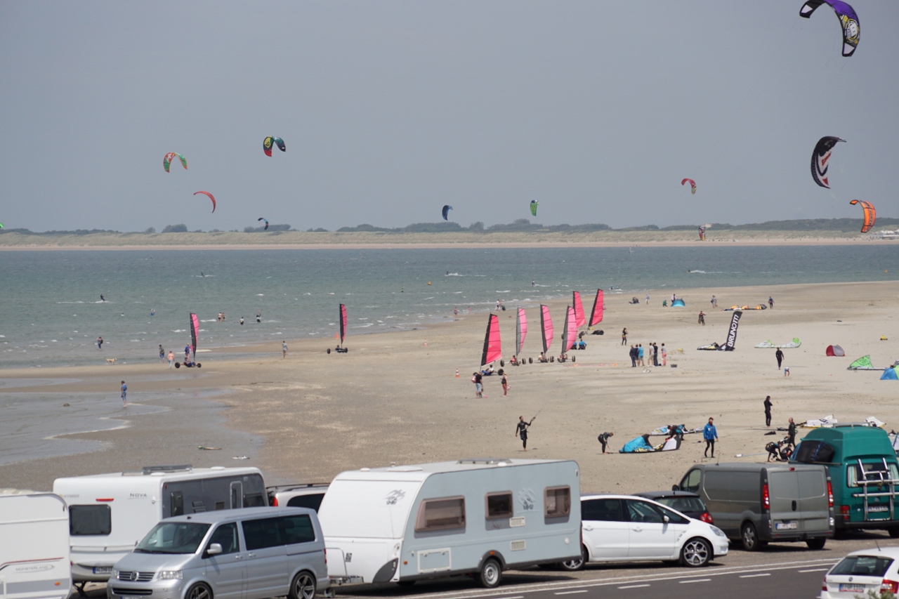Länge des Dammes Surfer, Kite-Surfer und Strandserver mit ihren segelbetriebenen Buggies. Jede Menge Surf- Kite-Surf- und Wasweißichschulen sind hier ansässig,