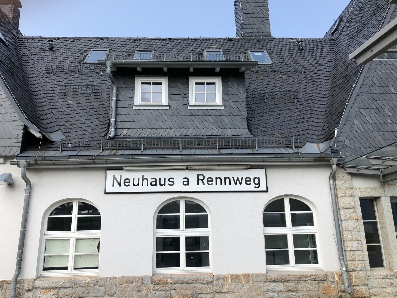 Neuhaus am Rennweg ist nicht der Beginn des Rennsteig Wanderweges, etwa ein Drittel des Weges ist hier schon absolviert, wenn man in Blankenstein gestartet wäre. Trotzdem haben wir uns für Neuhaus als Startpunkt entschieden. Erstens ist von hier aus der Weg bis (fast) zum Ende erreichbar für uns und zweitens ist Neuhaus am Rennweg in einigermassen normalem Zeitrahmen mit dem Zug erreichbar. Blankenstein, der eigentliche Beginn des Rennsteiges liegt im Nirgendwo, zumindest, wenn man auf öffentliche Verkehrsmittel baut.