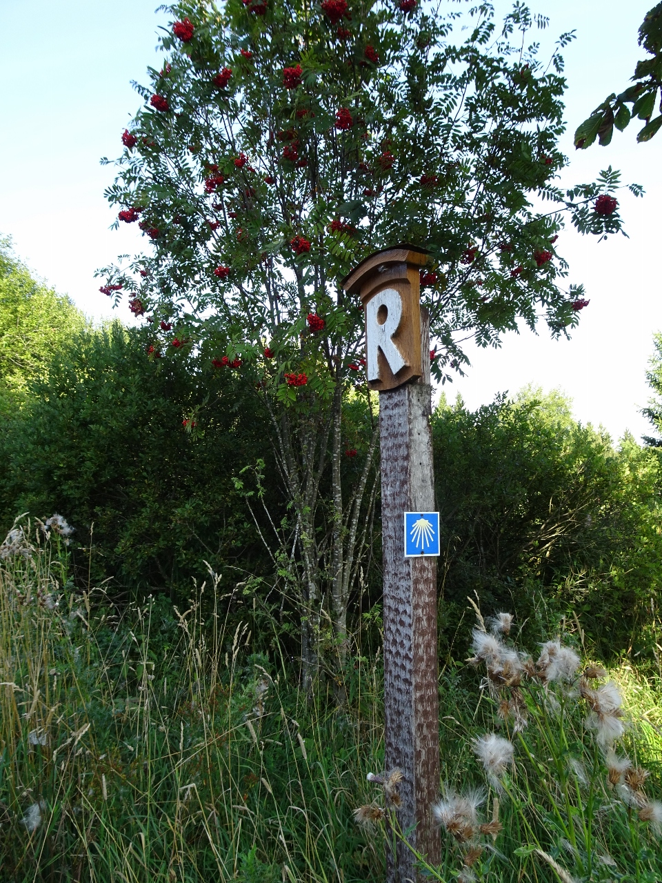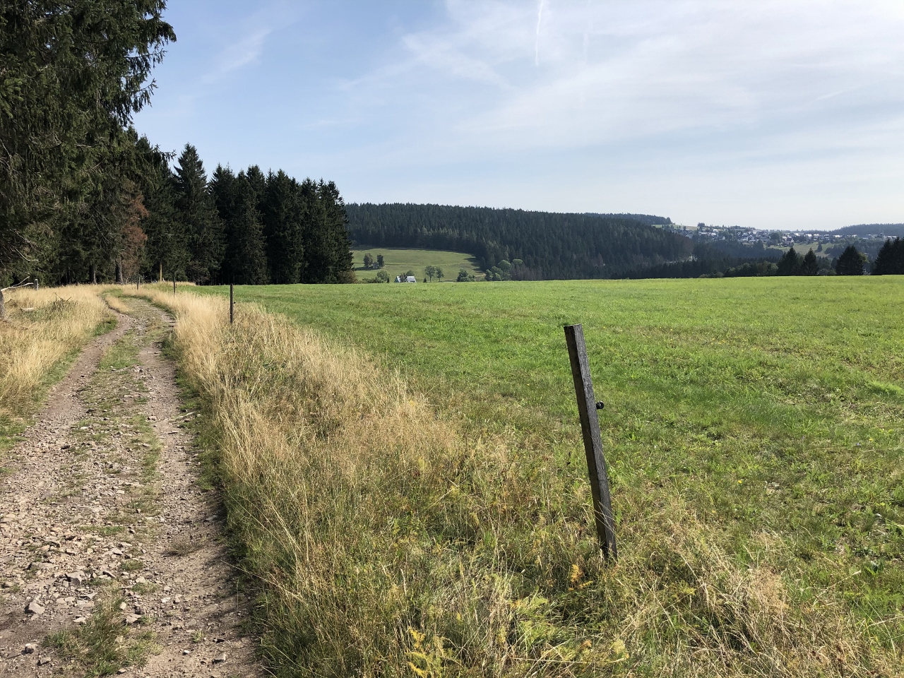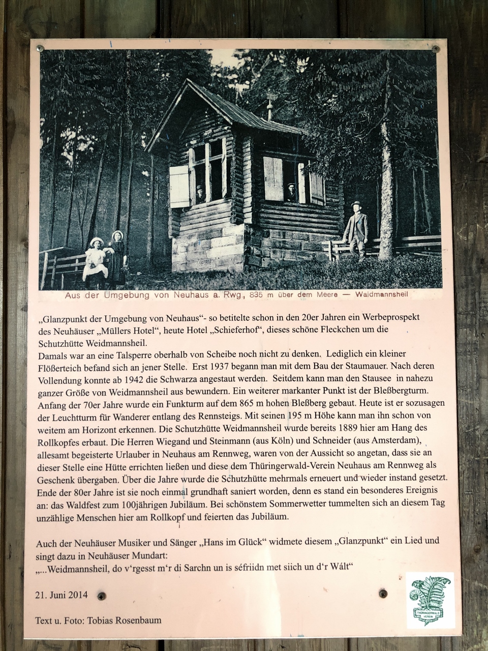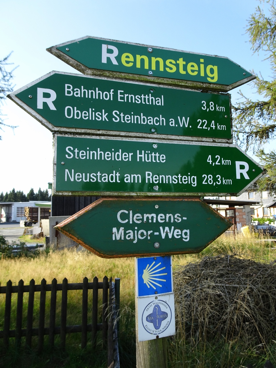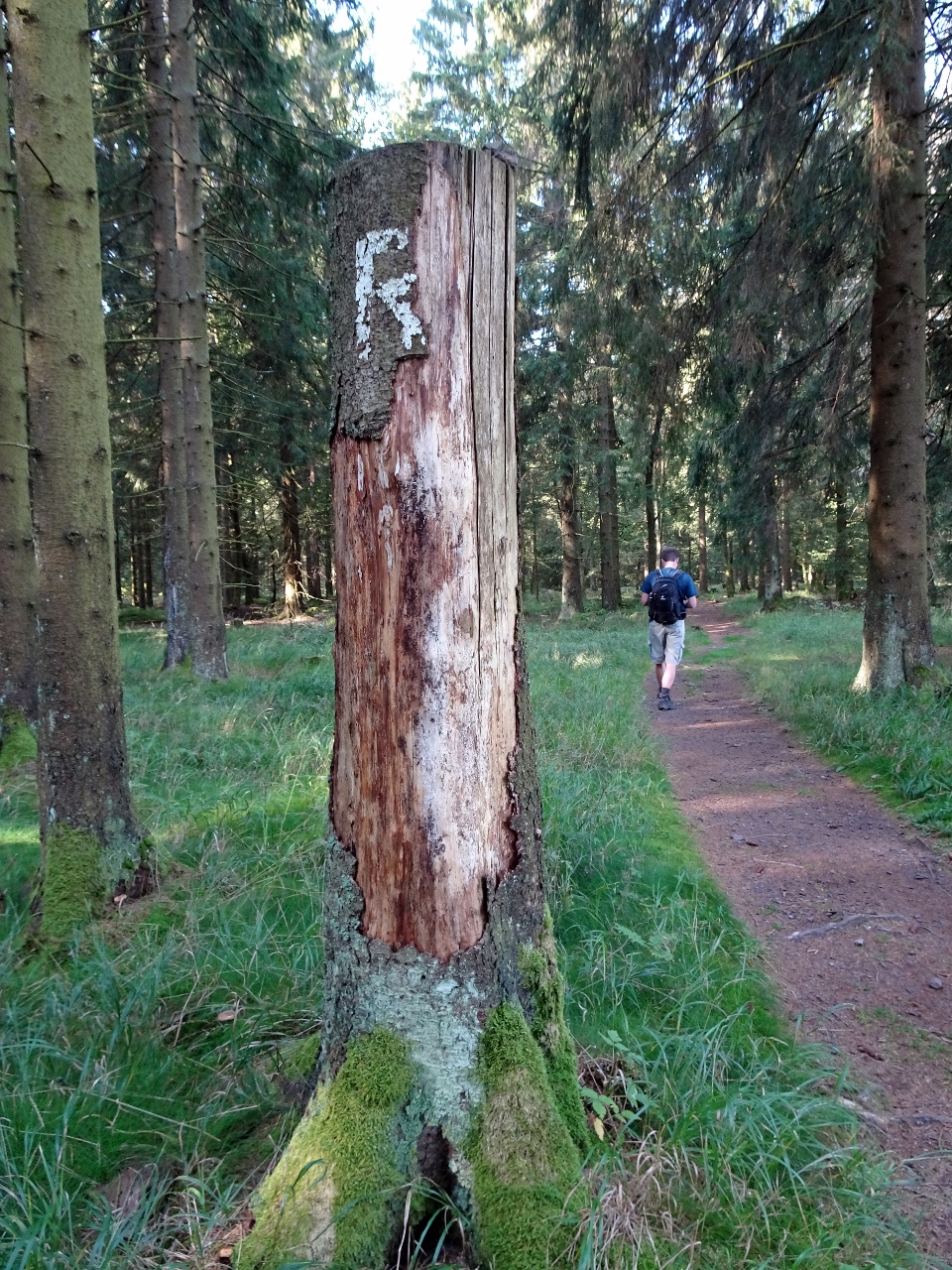 Der Rennsteig ist in seiner gesamten Länge exzellent ausgeschildert, sei es durch zahlreiche Wegweiser mit erstaunlich exakten Entfernungsangaben oder durch das charakteristische weiße "R" auf Wegweisern, gemalt auf Bäume oder auch mal auf dem Weg selbst. Unsere Richtung ist Neustadt am Rennsteig. Auch ein interessantes Detail, dass wir gestern bei der spontanen Führung durch die Kirche erfahren haben: die Bezeichnung Neuhaus am "Rennweg" hat die Post (Thurn & Taxis) im 19.Jahrhundert eingeführt, um eine klarere Unterscheidung zu den Orten Neustadt bei Coburg und Neustadt am Rennsteig zu etablieren. Und das wurde dann vom Volk einfach übernommen.