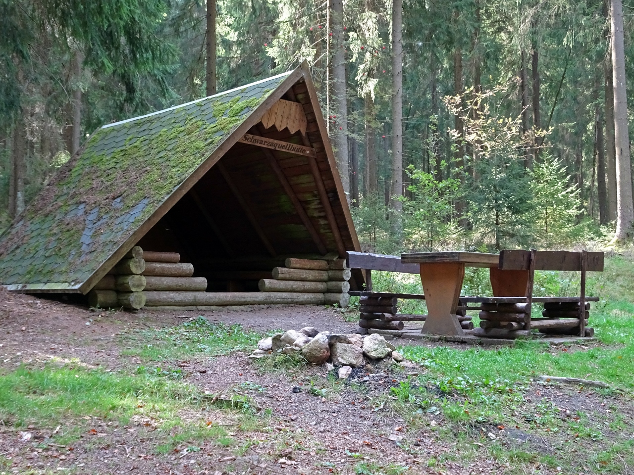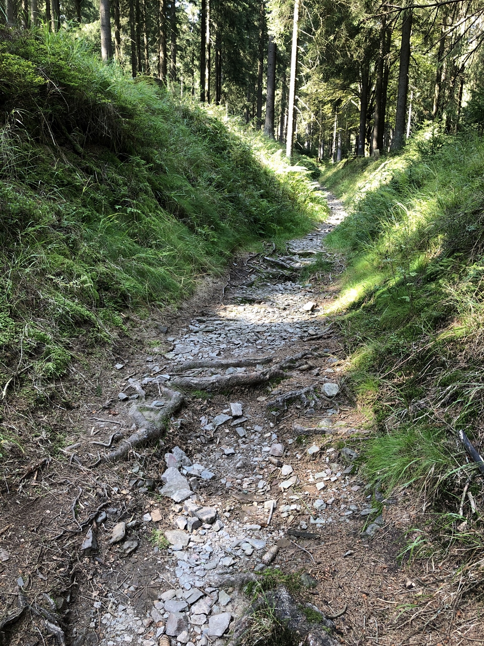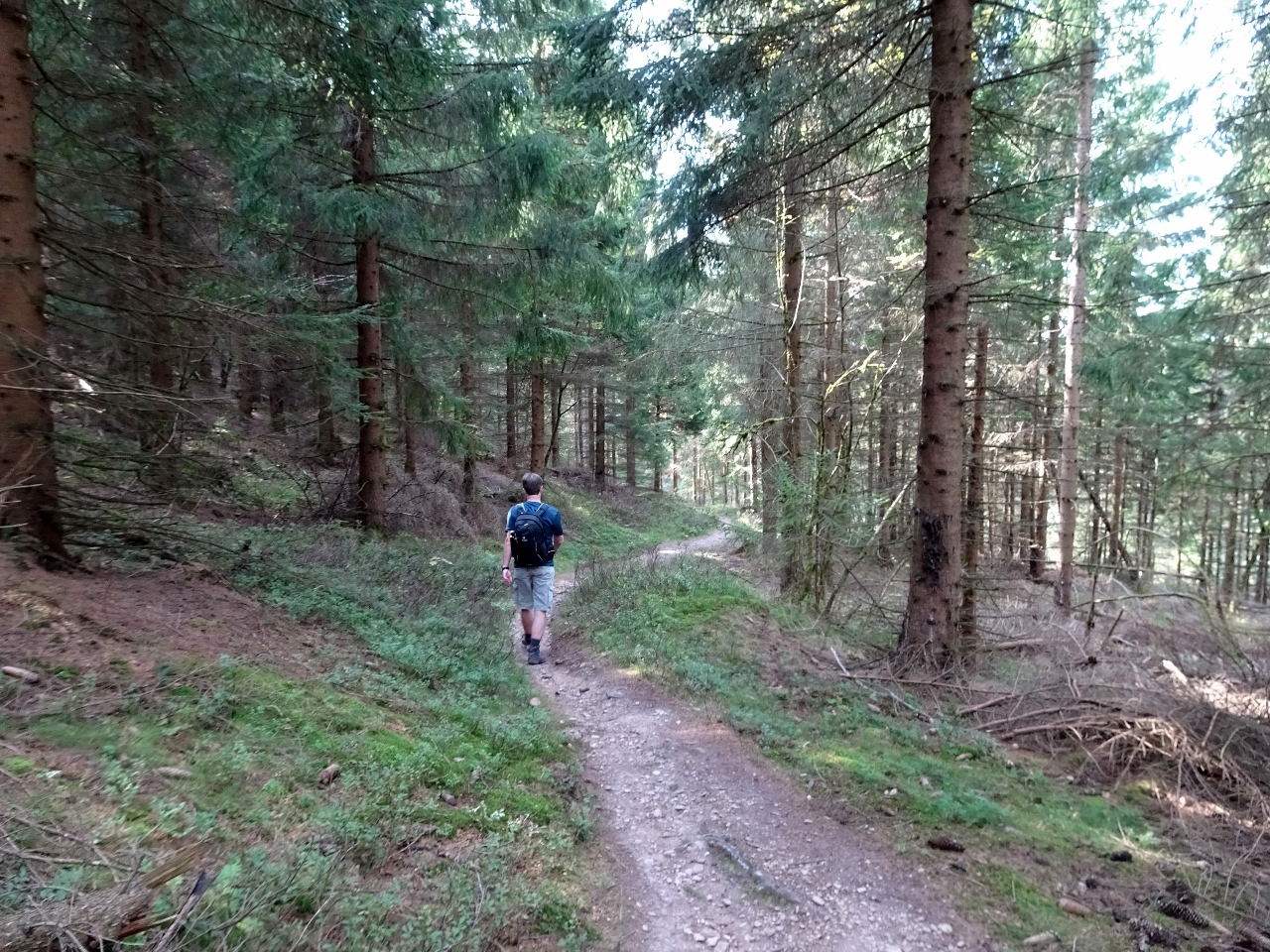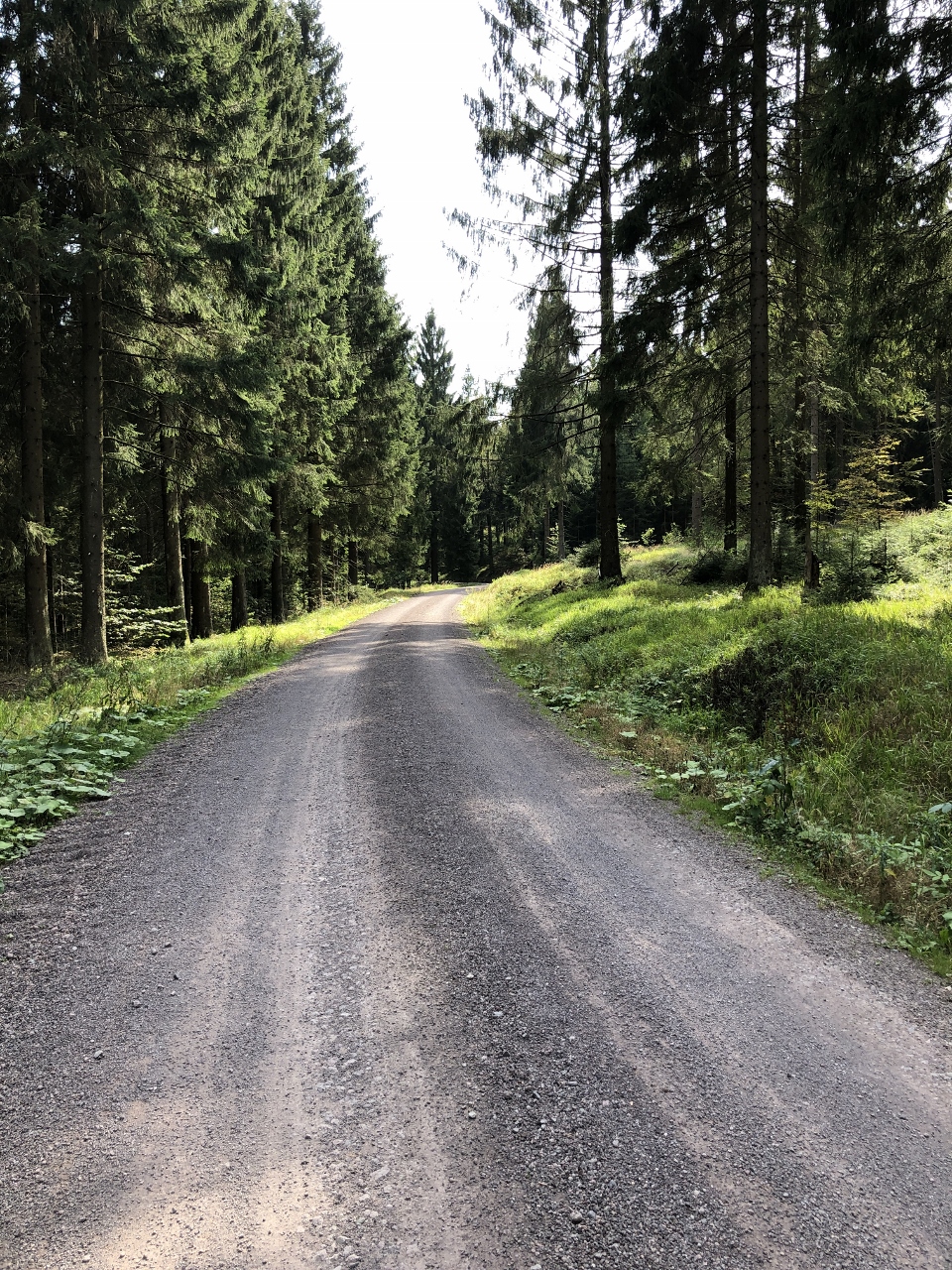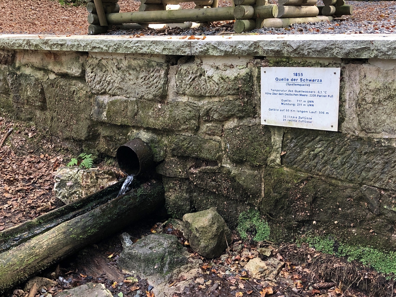 Dort geht nämlich unser Weg, klein und verborgen in den Wald. Und stramm bergab. Die nächsten drei Kilometer geht es bis zur Quelle des Bächleins Schwarza auf Bergziegenterrain abwärts.