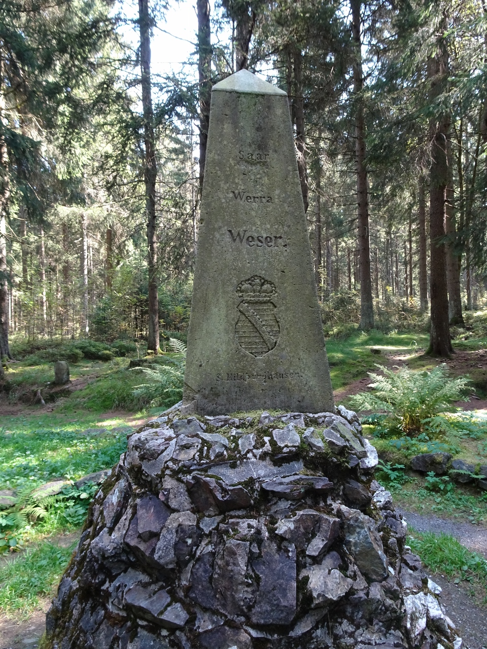 Aus Neuhaus raus geht es noch durch ein Gewerbegebiet, aber bald rein in den dichten Wald. Der Rennsteig war in der Vergangenheit auch immer ein Grenzweg zwischen den verschiedenen Fürstentümern und entsprechend findet man hier überall unzählige Grenzsteine.
