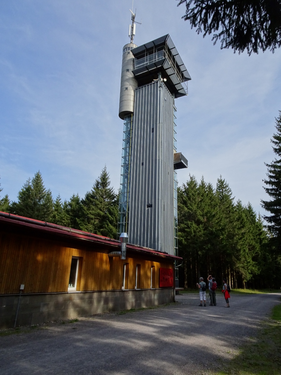 Nach einer wohlverdienten Siesta geht es weiter auf den unterschiedlichsten Wegen, mal breit und schotterig, mal schmal und waldwegig, zuerst wieder bergab und schließlich wieder lang und anhaltend bergan zur Rennsteigwarte, wo zwar der Aussichtsturm geöffnet, aber das Lokal, wie könnte es anders sein, geschlossen ist.