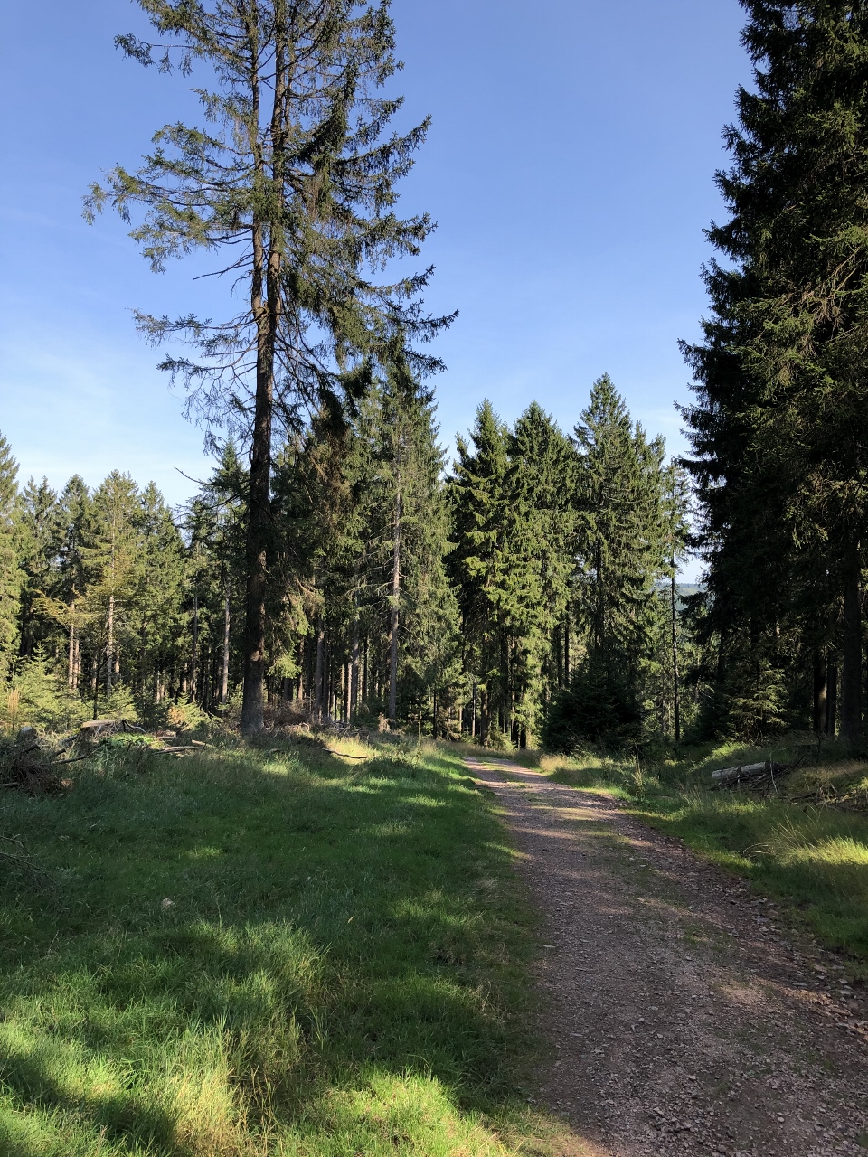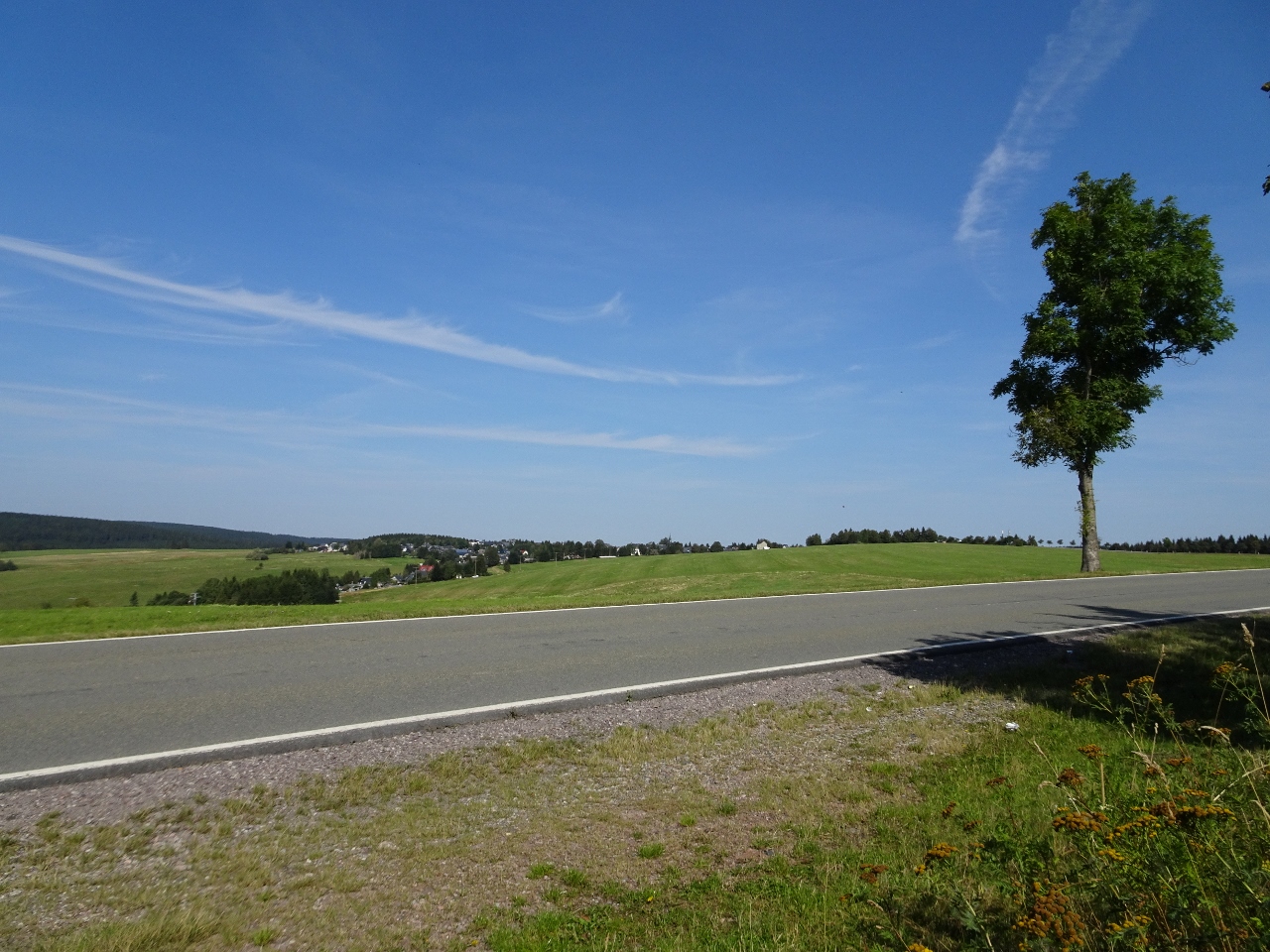 Ab hier wird die Strecke ein wenig enttäuschend, es geht kilometerweit entlang einer Bundes- oder Landesstraße, immer berauf und bergab, wobei der Teil bergan deutlich überwiegt, bis wir schließlich in Neustadt am Rennsteig ankommen. Hier soll es laut Reiseführer App 5 Einkehrmöglichkeiten geben, sage und schreibe 0 davon haben geöffnet. Wir finden aber ein größeres Hotel, mit angeschlossenem und geöffnetem (!) Restaurant.