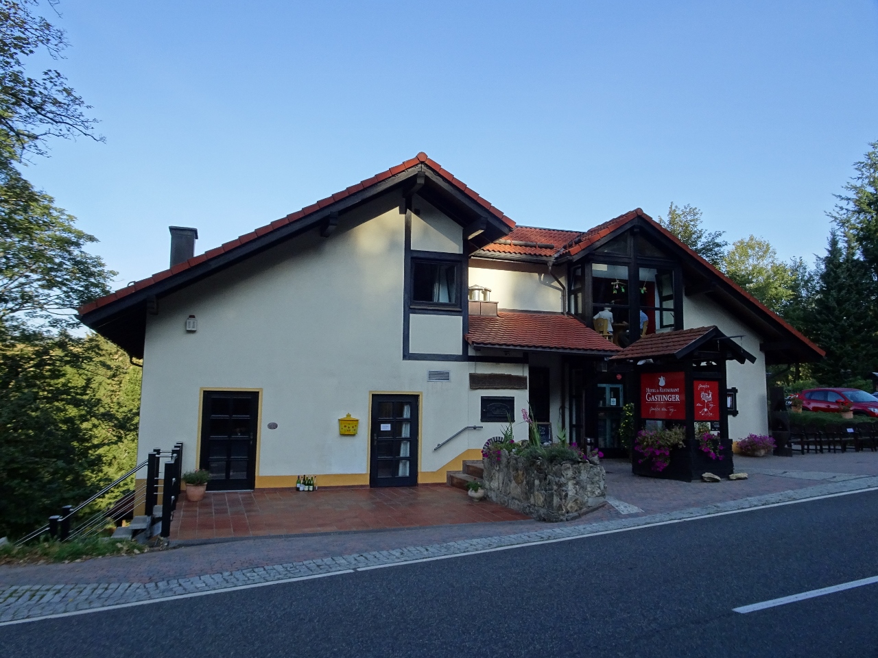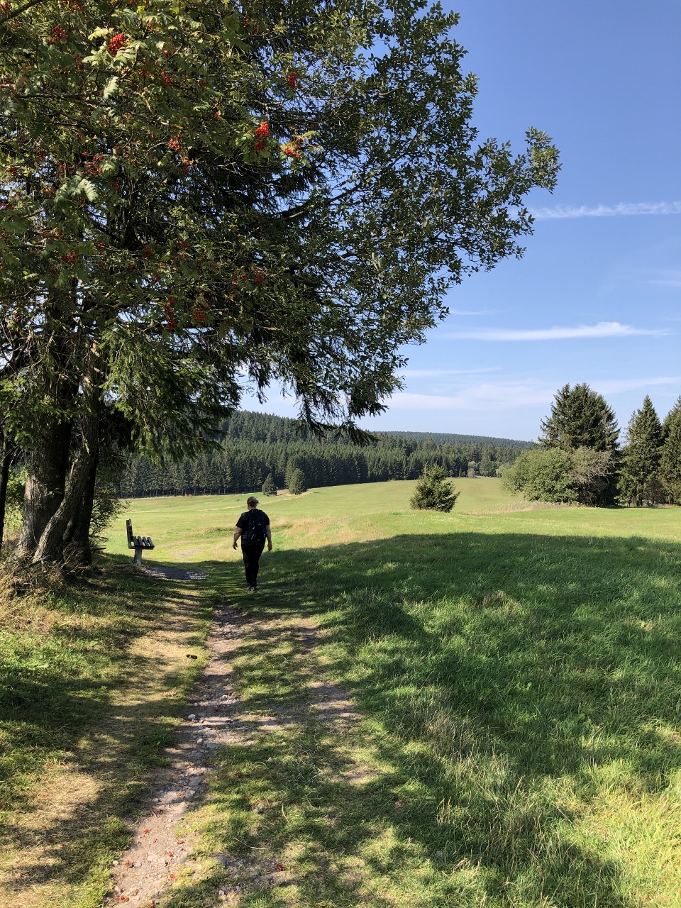 Ab da geht es mehrheitlich bergab über Allzunah in Richtung unseres Hotels, das wir über einen ziemlich wilden, aber gut ausgeschilderten Waldpfad abseits des Rennsteiges finden. Das Hotel Gastinger liegt weit außerhalb des Ortes Schmiedefeld, also bleiben wir heute hier, zumal auch für die kulinarische Abendversorgung bestens gesorgt ist. Bei traumhaftem Wetter gewandert und zum Abschluß auf der Hotelterrasse in der Sonne sitzend das Feierabendbier genießen. Auch wenn wir völlig platt sind, sind wir doch zufrieden.