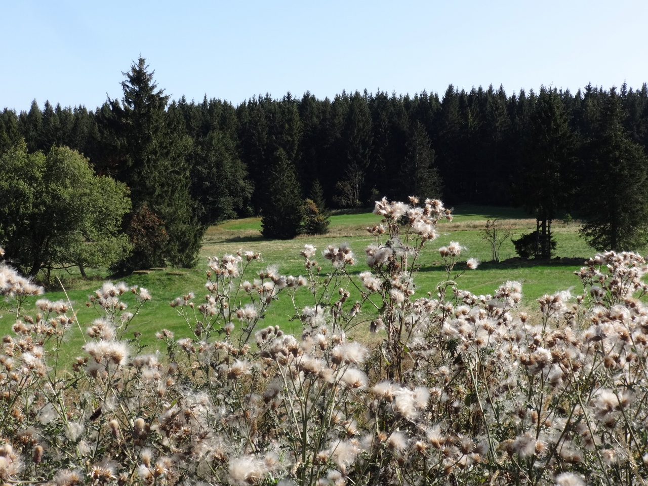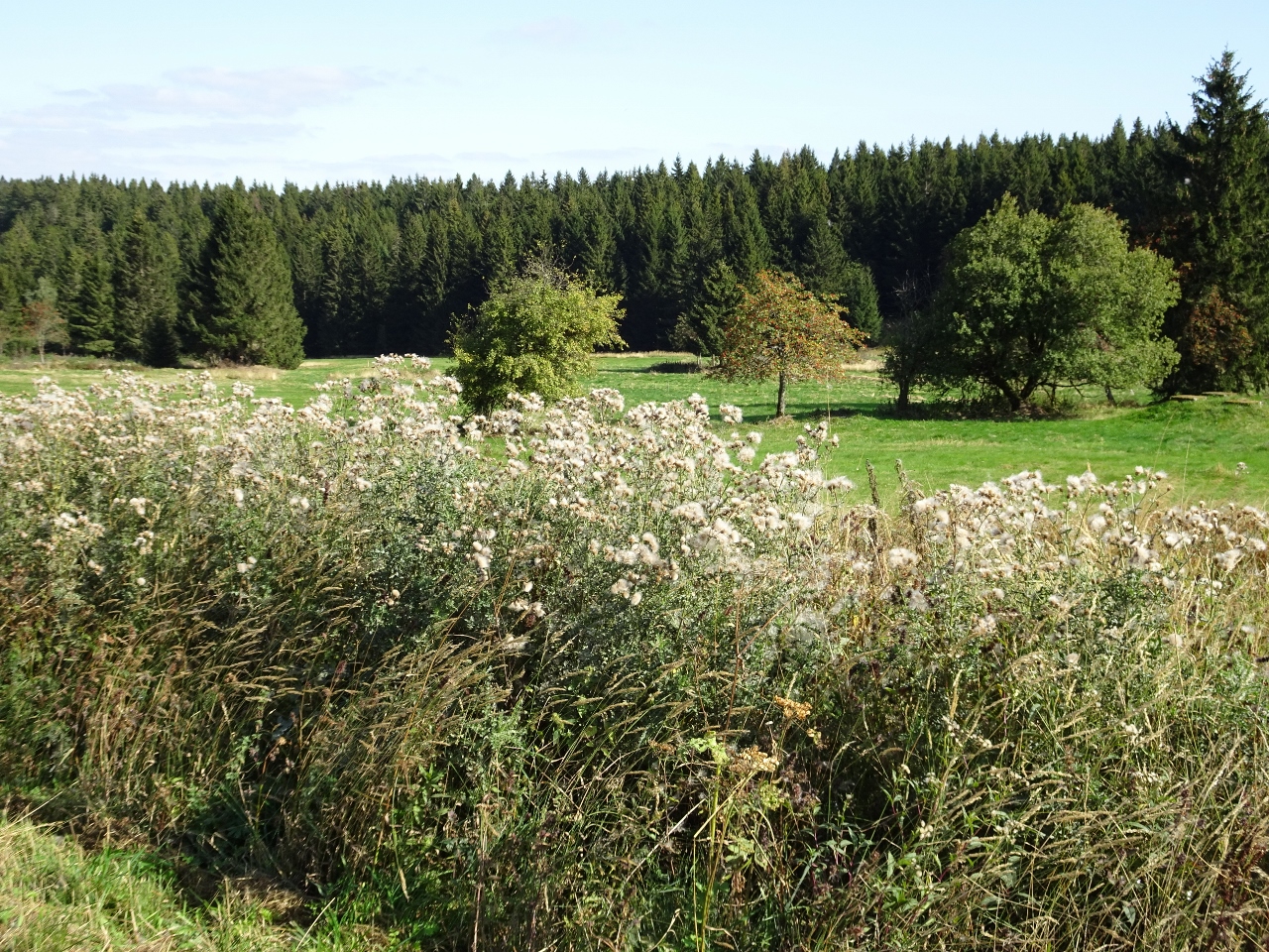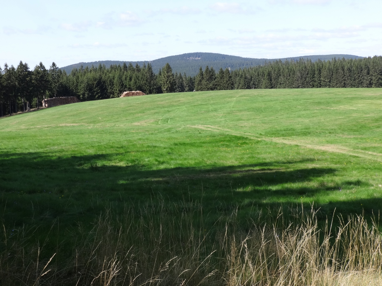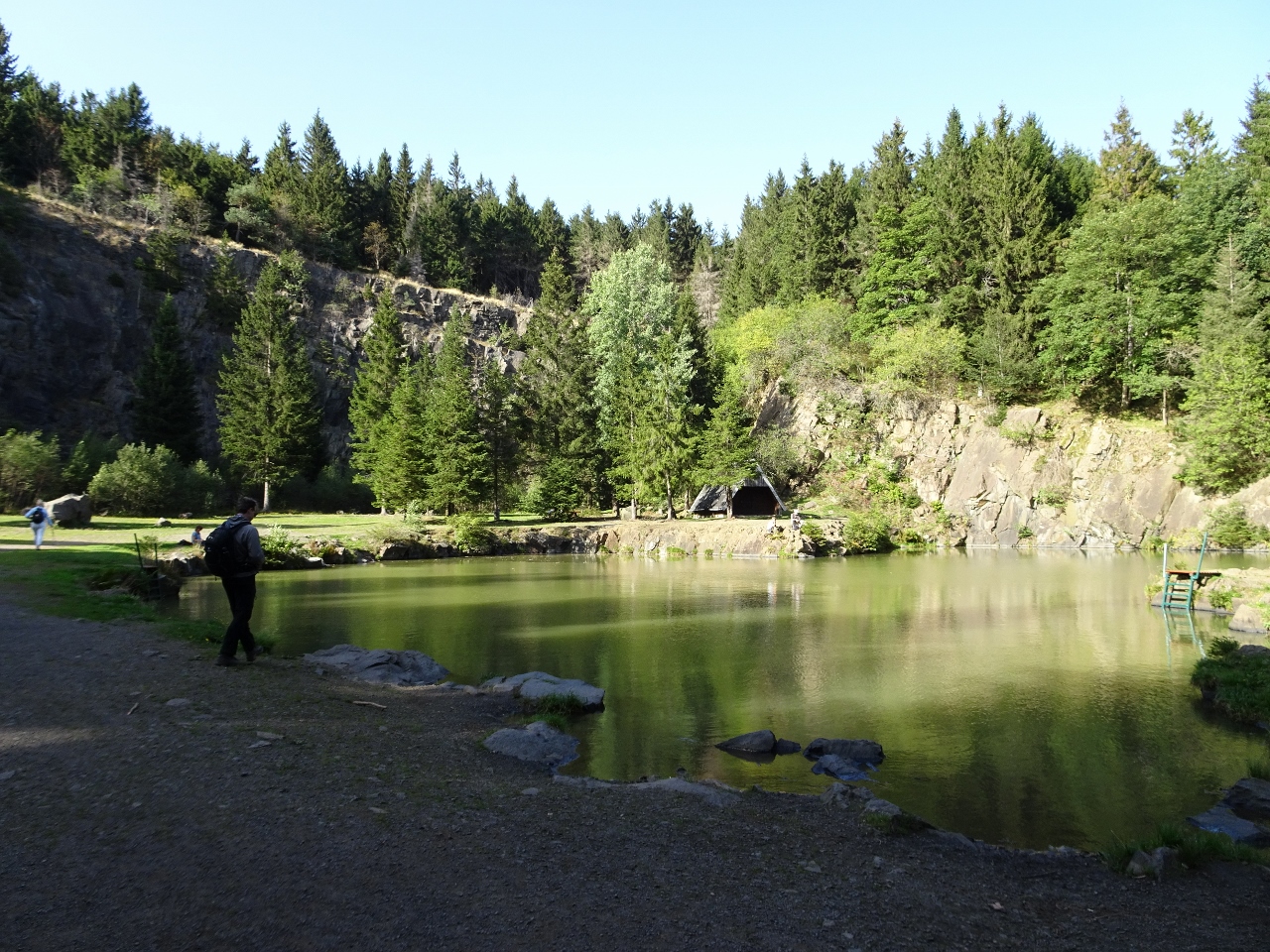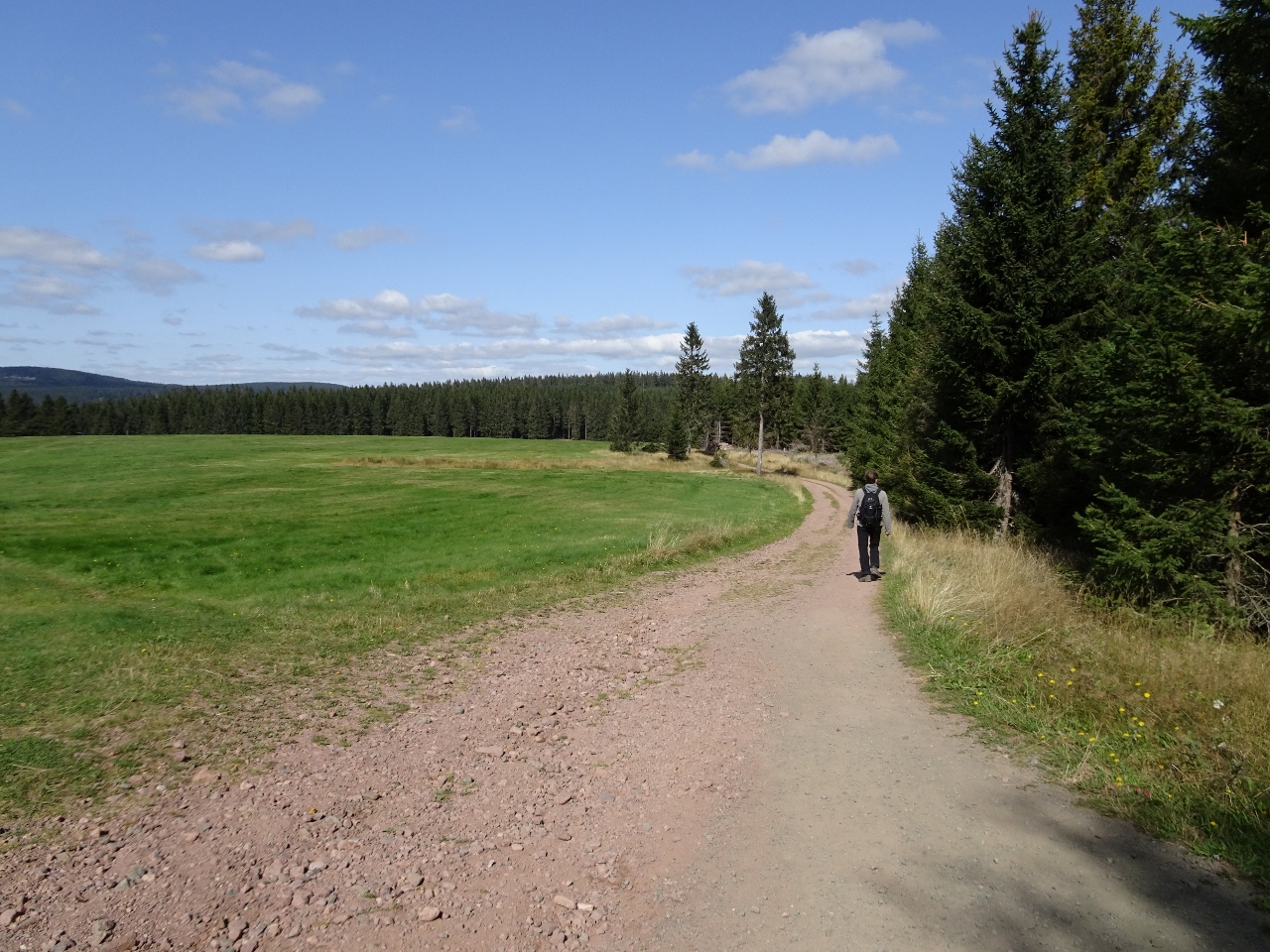 Anschließend ziehen wir, frisch gestärkt weiter und erreichen wenige Kilometer später die Ebertswiese und den Bergsee Ebertswiese. Die Ebertswiese wird als das schönste Hochplateau des Thüringer Waldes gepriesen und hat auch ein zauberhaft ruhiges Flair. Was vielleicht auch daran liegt, dass das hier gelegene Hotel geschlossen ist, wegen Wassermangels. Die Quelle, von der das Hotel das Wasser bezieht bietet nicht mehr ausreichend Wasser, die trockenen Jahre machen sich bemerkbar. Eigentlich hätten wir hier übernachten sollen, aber so müssen wir noch ein paar Kilometer weiter, zunächst zum Bergsee Ebertswiese, wobei der Begriff "See" schon eine sehr euphorische Übertreibung darstellt.
