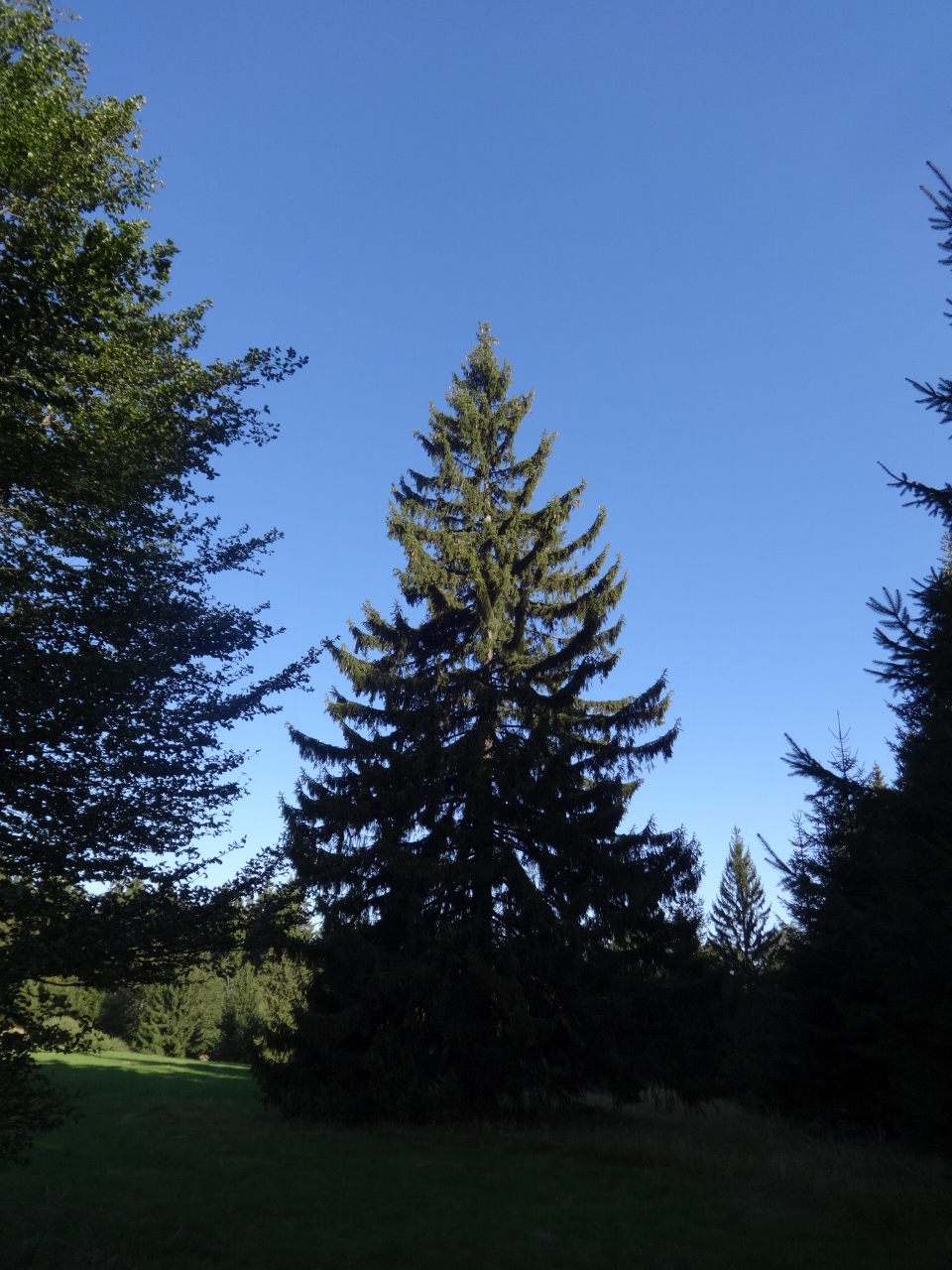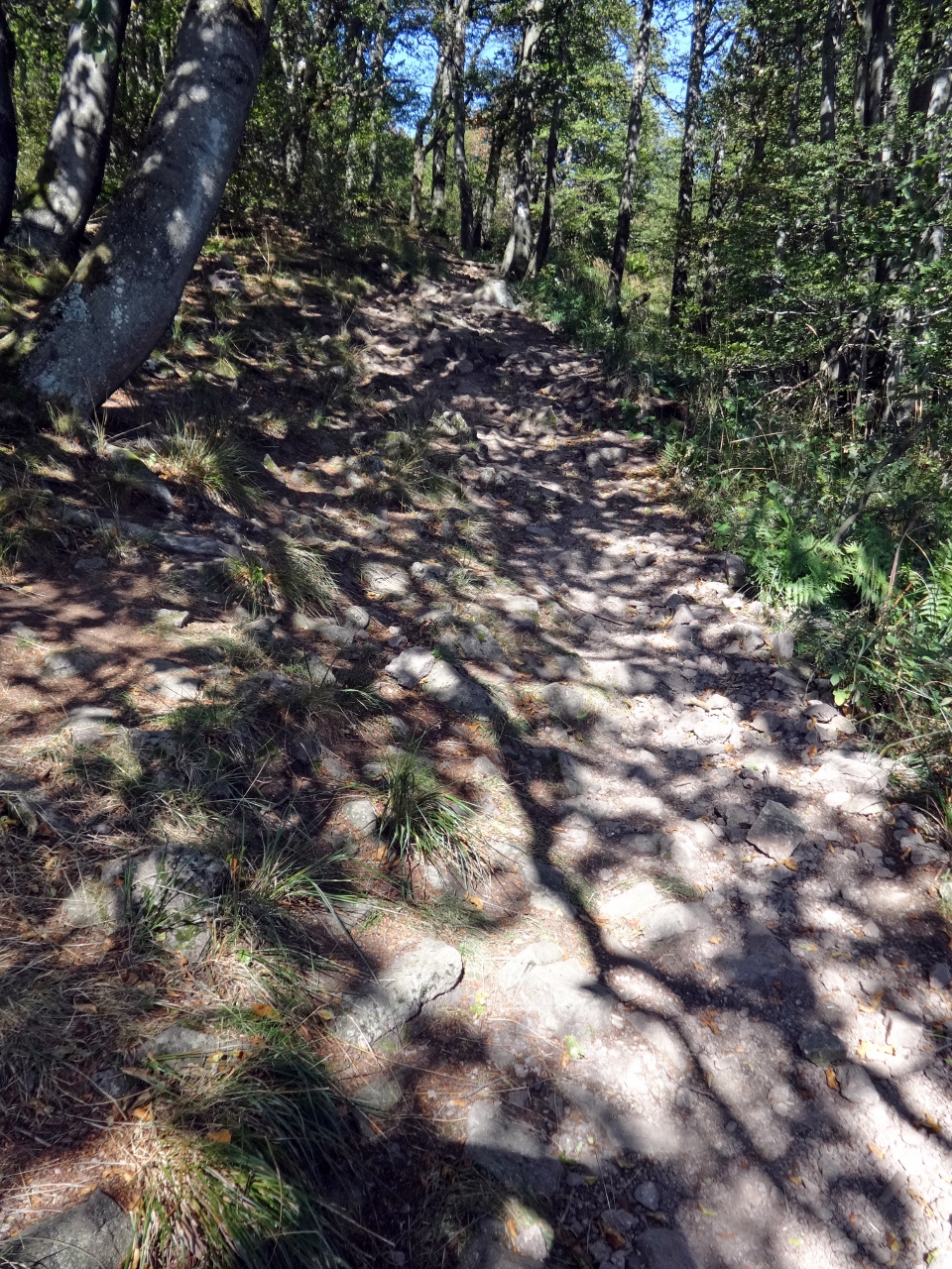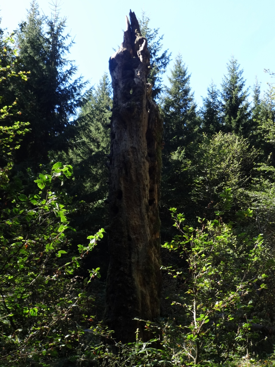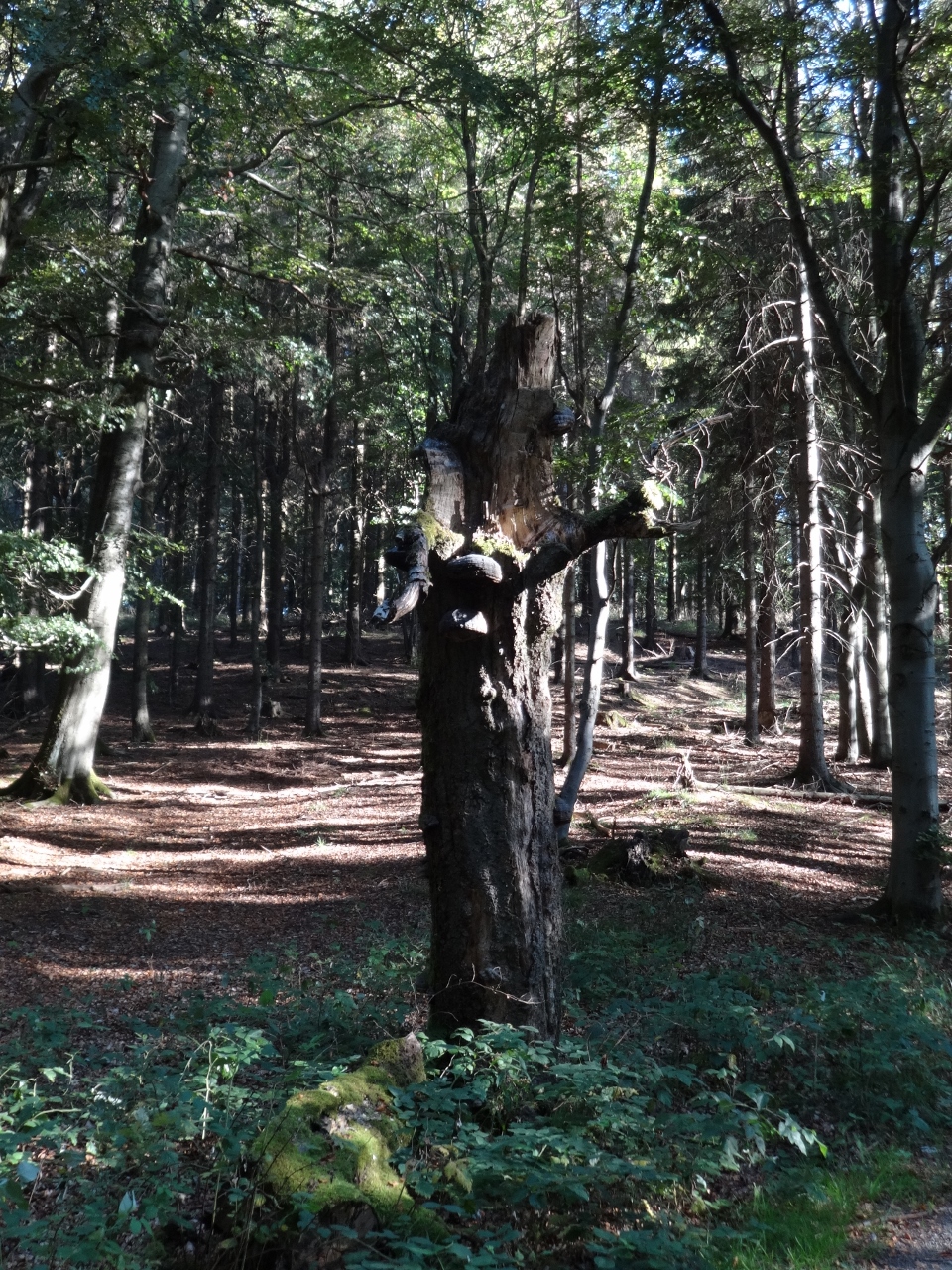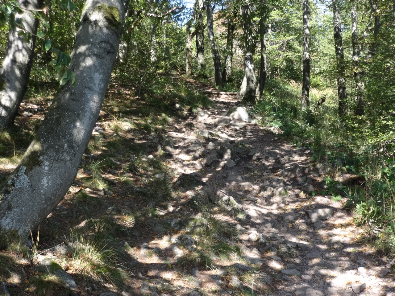 Von hier weg sollte es für heute nur noch bergab gehen, das wird bis auf wenige kleine Anstiege auch tatsächlich so sein. Es geht zunächst durch ein "Totalreservat", den Begriff hatte ich bis dahin auch noch nie gehört. Das bedeutet wohl, dass der Wald vollkommen unbewirtschaftet sich selbst überlassen bleibt. Das schien mir bisher auch schon der Fall gewesen zu sein, weite Bereiche, die wir bisher durchwandert hatten, wirkten sehr verwildert, naturbelassen. Vielleicht brauchte man auch einfach nur einen knalligen Namen, um eine weitere Hinweistafel ins "Totalreservat" zu stellen. Auf jeden Fall ist hier sofort wieder Ruhe, die Besucherströme konzentrieren sich auf den Gipfel und die Wege auf der anderen Seite