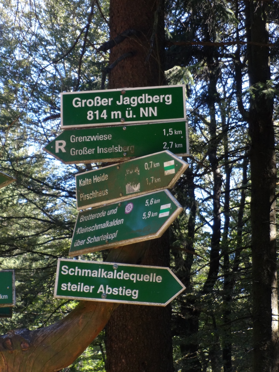 Während ich so vor mich hinwandere und gemeinsam mit den Gesellen in meinem Rucksack thüringisches Liedgut pflege, welches uns in der Oberhofer Kneipe so großzügig beigebracht wurde, kann ich zwischendurch immer mal wieder einen Blick auf den Großen Insel(s)berg werfen (offiziell ohne "s", aber beide Schreibweisen sieht man auf den Wegweisern). Dort hinauf, auf den Berg mit dem markanten Turm will ich noch.