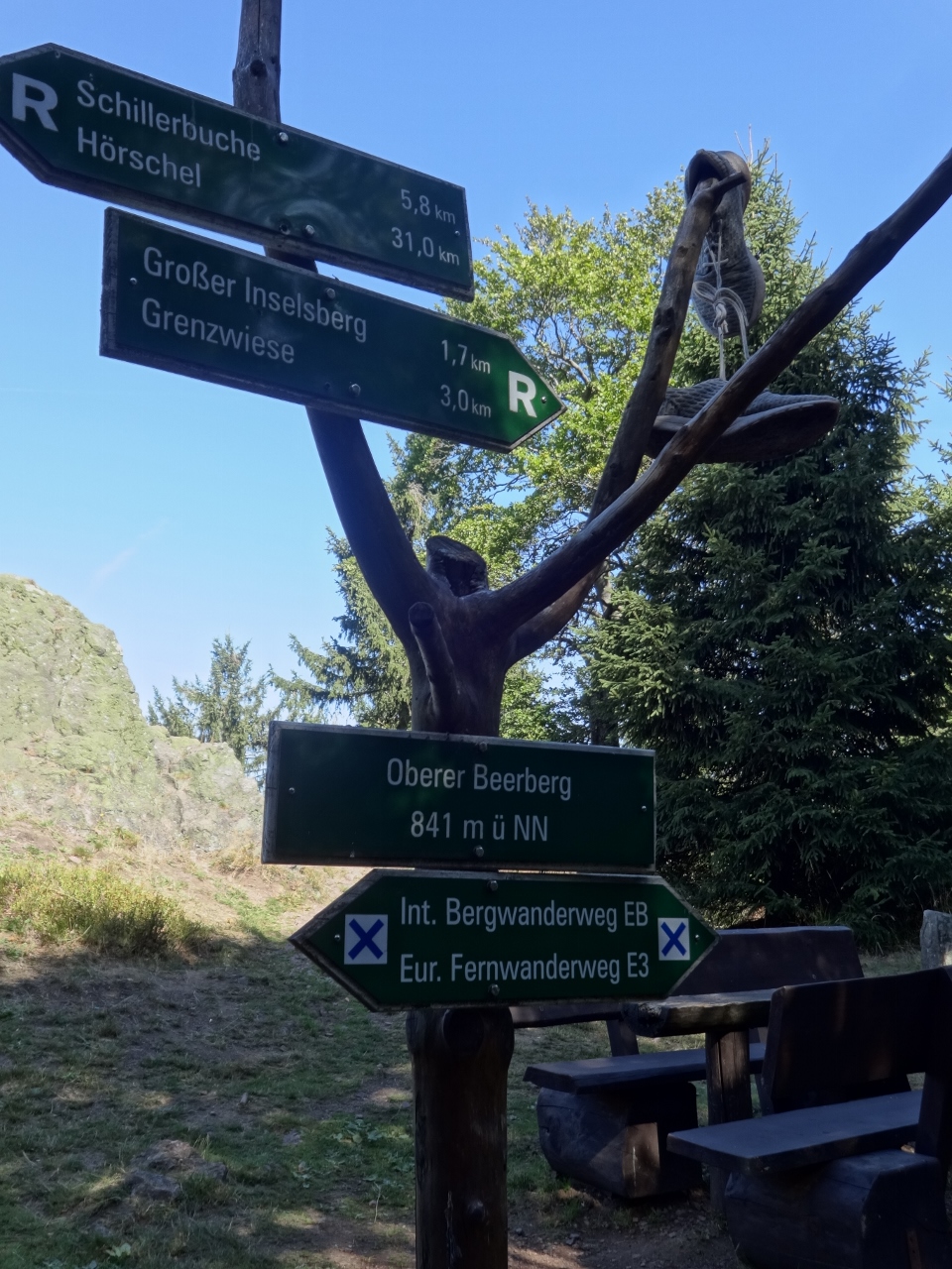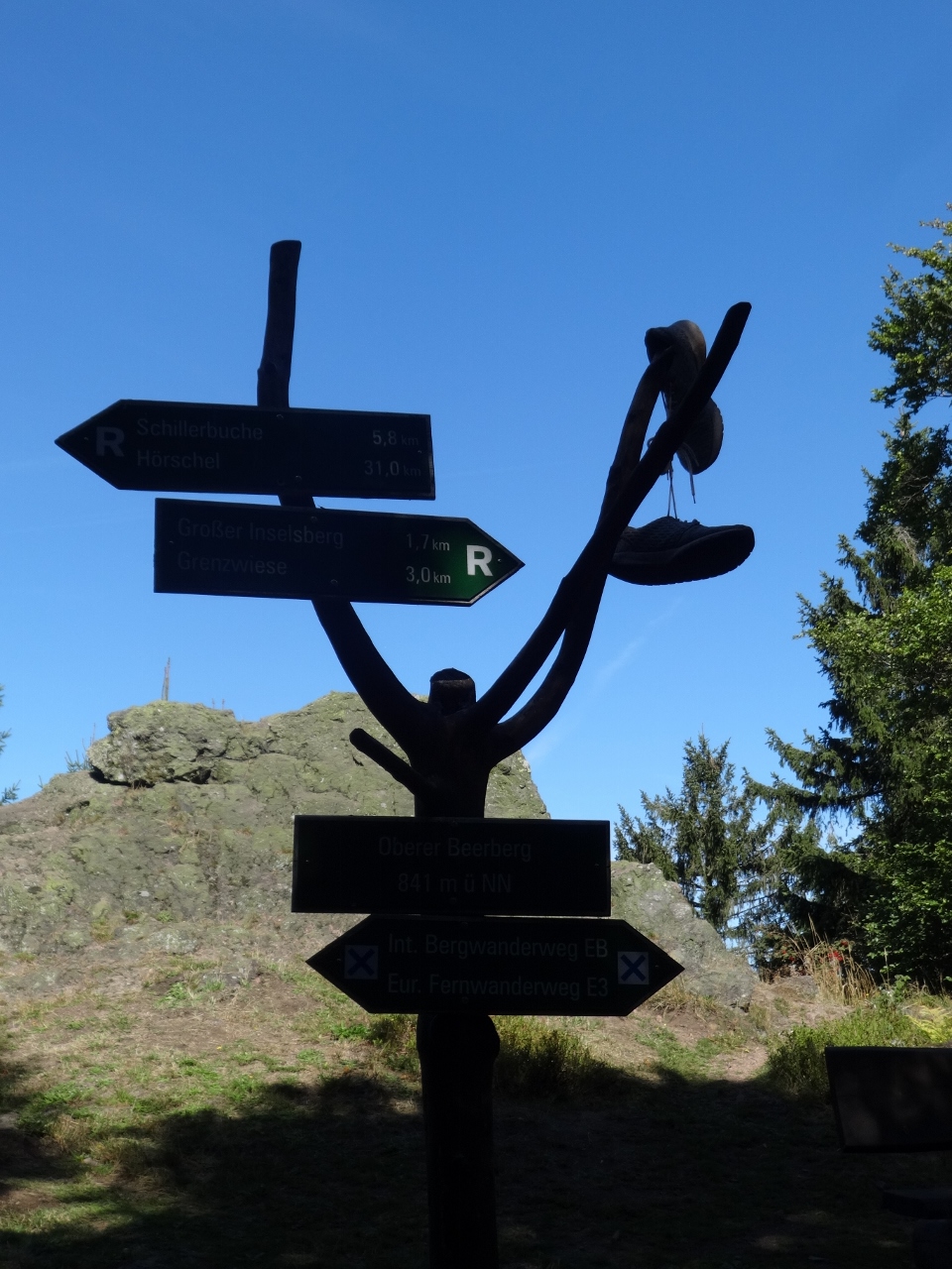 Gut gestärkt setze ich meine Reise anschließend über die "Grenzwiese" fort, hier beginnt der Anstieg zum Großen Inselberg. Es gibt eine leichtere und eine schwerere Aufstiegsvariante. Ein älteres Paar diskutiert, welche Variante zu wählen sei, worauf sie ihm im Brustton der größten Selbstverständlichkeit zu verstehen gibt: "Natürlich die schwere Variante! Wozu hab ich dir denn die Wanderstiefel gekauft?"
