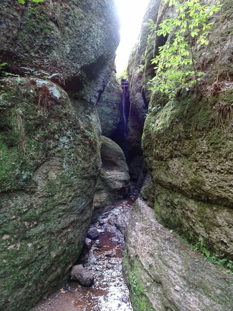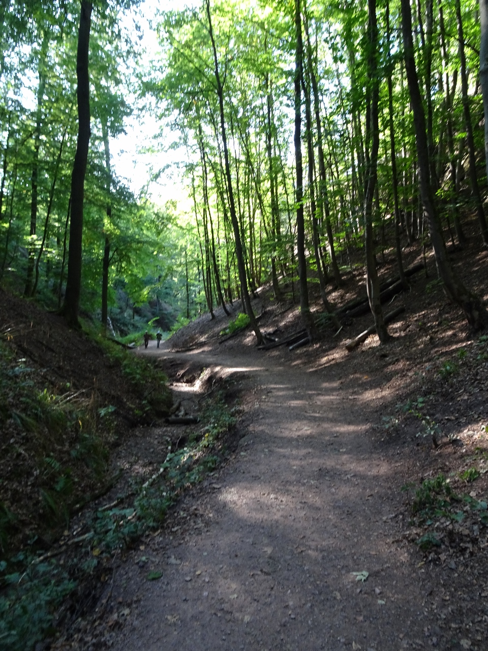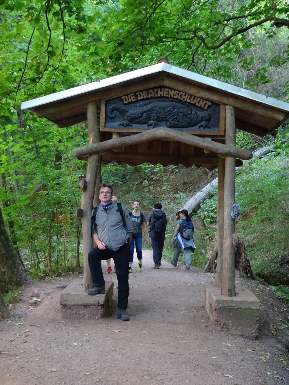 Am frühen Nachmittag kommen wir an der "Hohen Sonne" an, einem Park- und Rastplatz, der Ausgangs- und Zielpunkt zahlreicher Wanderer ist. Es ist Samstag, entsprechend voll ist es hier, wir machen trotzdem kurz Rast, von hier ab geht es nur noch durch eine der Schluchten abwärts nach Eisenach. Wir wählen die laut aller Recherchen spektakulärste, die Drachenschlucht. Obwohl hier wirklich Rush-Hour herrscht, ist es ein eindrucksvolles Naturschauspiel.