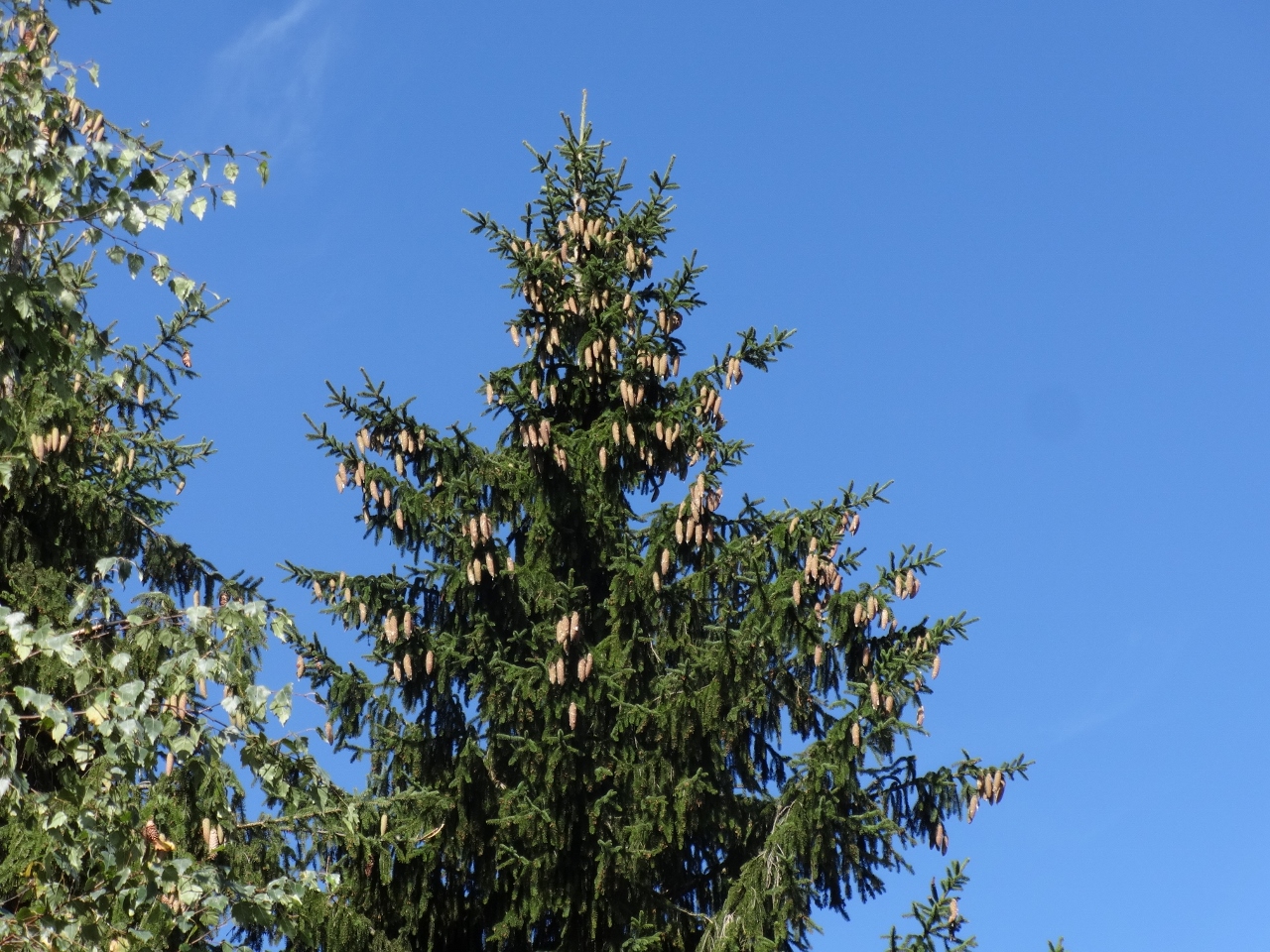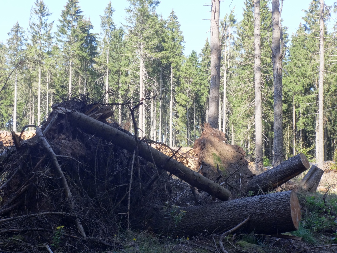 Vorbei an ein wenig Kunst stellen wir hier am Westhang des Thüringer Waldes doch massive Waldschäden fest. Wie schon berichtet, bisher sah der Wald fast durchgehend grün, üppig und gesund aus. Hier zeigt sich nun ein anderes Bild. Teils kleinere Gruppen, manchmal ein ganzer Hang komplett vertrockneter Bäume. Ohne Frage sieht man hier die Trockenheit der vergangenen Jahre, ohne deshalb gleich in Klimawandel-Weltuntergangspanik verfallen zu müssen. Interessanterweise immer Nadelbäume, Flachwurzler sind halt einfach anfälliger, da ist die gute alte deutsche Eiche stabiler.