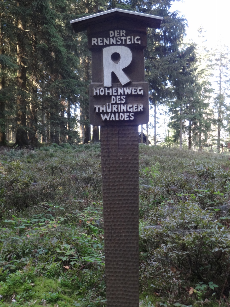 Es ist strahlend blauer Himmel und sehr angenehm für Ende September, nur der kalte Wind pfeift uns an manchen Ecken um die Ohren. Im Morgentau geht es durch den Wald zurück zum Rennsteig. Dort geht es zunächst ein wenig bergan, aber sehr moderat, heute wird es die meiste Zeit bergab gehen, unser Ziel Eisenach liegt interessanterweise tiefer als unsere Heimat Regensburg.