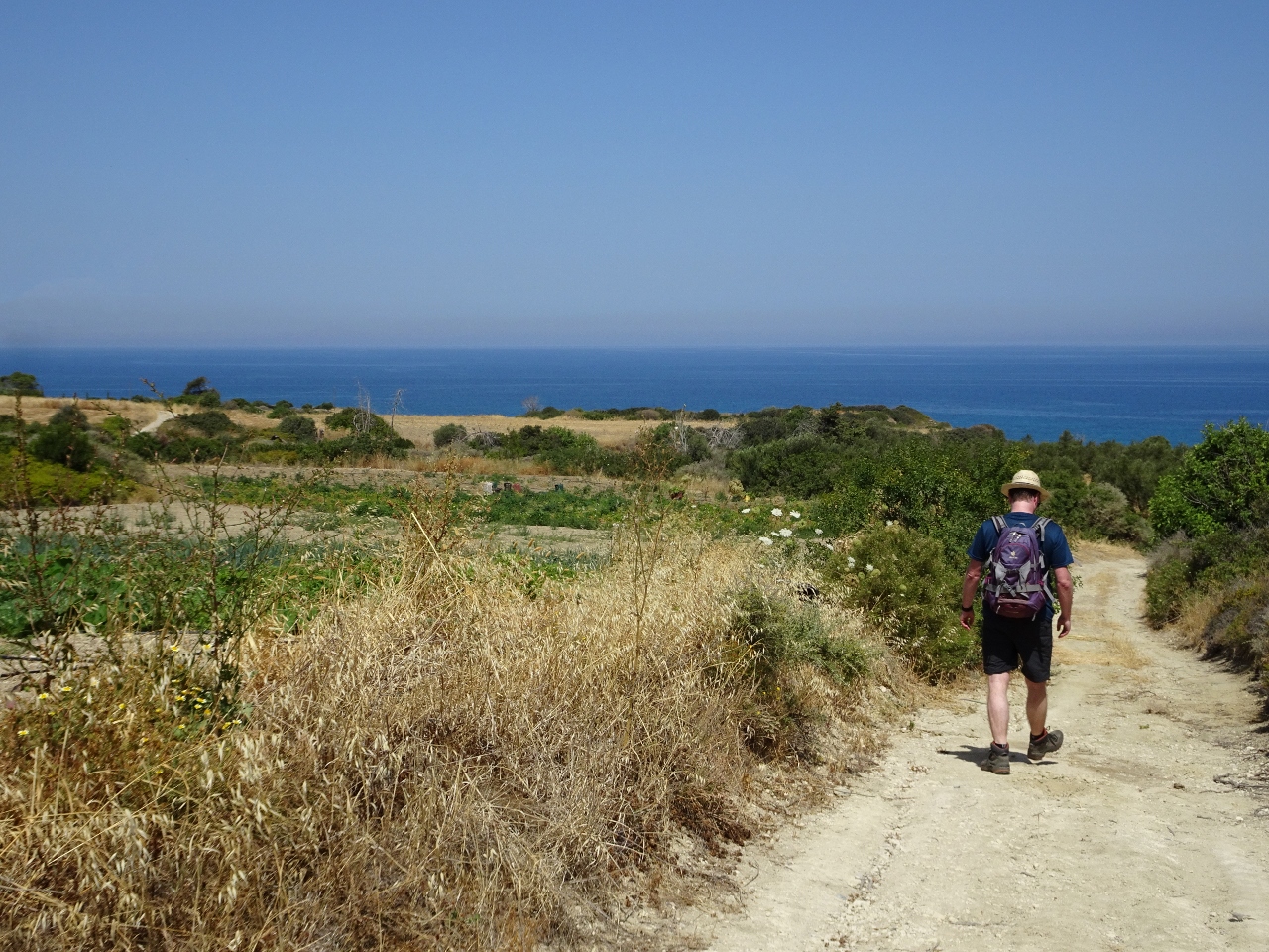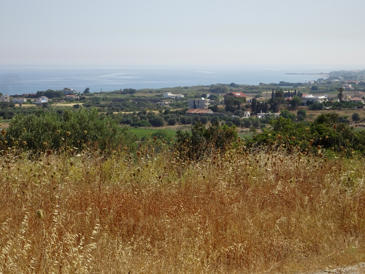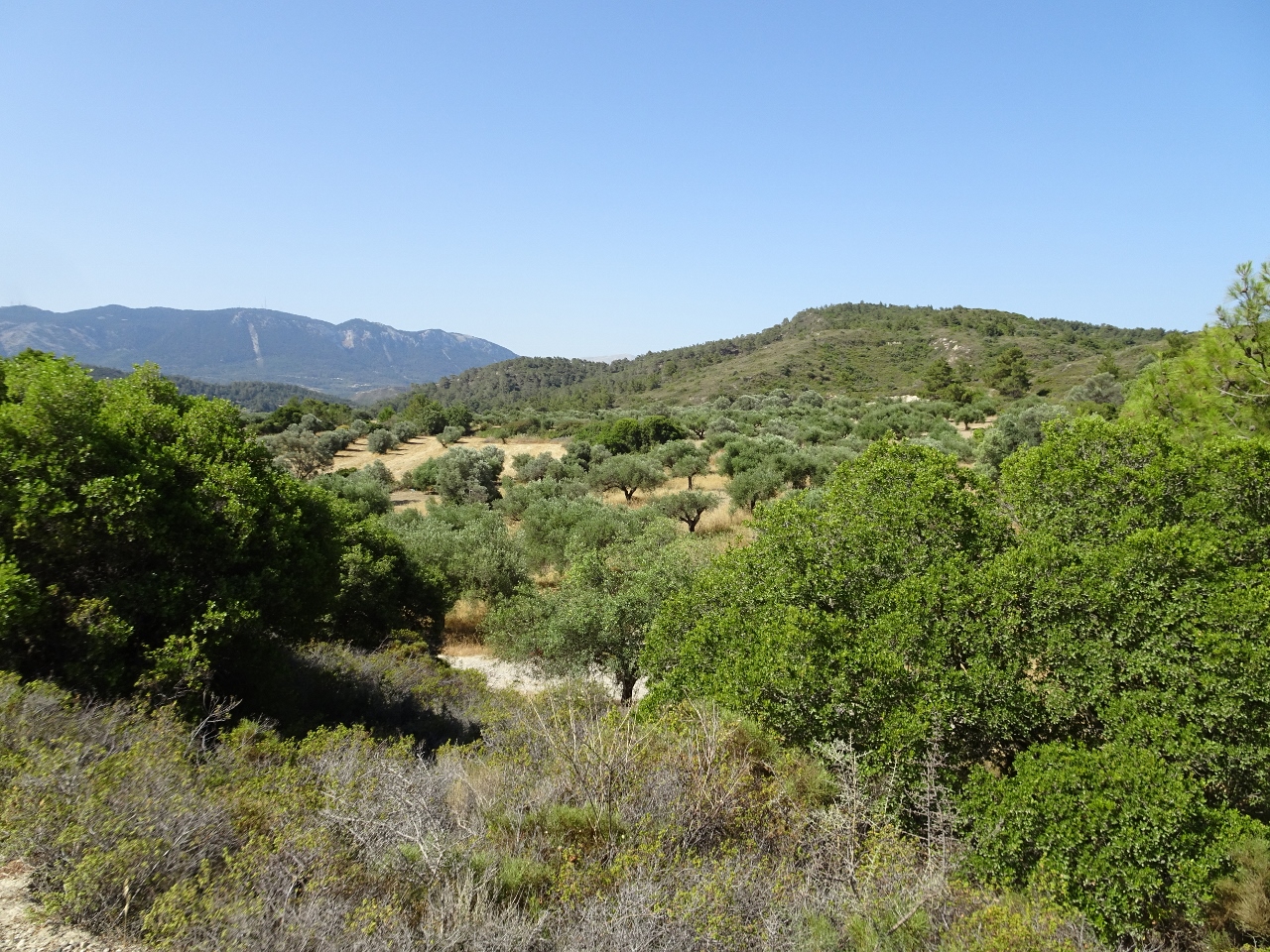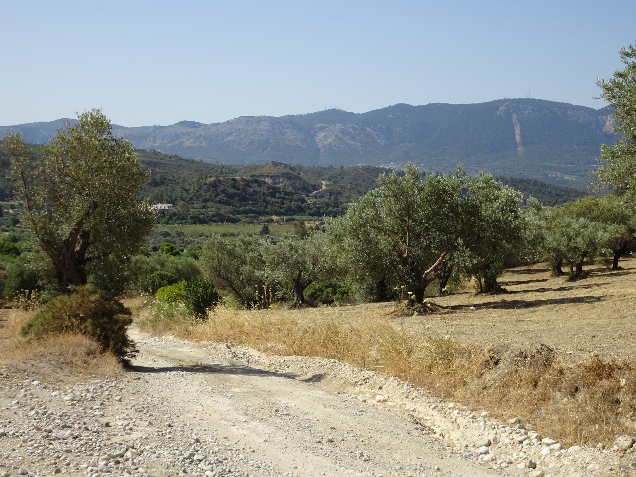 Olivenhain und natürlich bergauf. Wir überqueren eine Hügelkette und sehen von oben auf die Küste, man sieht sogar das türkische Festland auf der