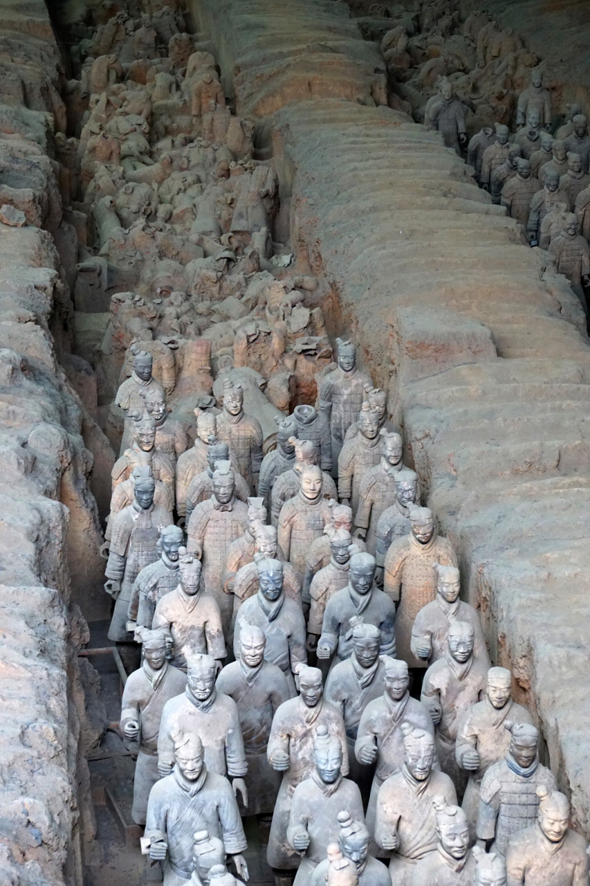 Mausoleum von Qin , dem ersten Kaisers von China. Der wurde bereits im Alter von dreizehn Jahren König eines der 7 Königreiche, die er im Laufe seines Lebens vereinigen sollte um das damit geschaffene Kaiserreich als erster Kaiser zu regieren. Bereits in diesem zarten Alter begann der Bube seine Grabstätte zu planen und ließ zu deren Bewachung eine Armee aus Tonsoldaten erschaffen. Das war etwa 220 v. Chr., die tönerne Armee war in Hallen aus Holz, gedeckt mit einer Erdschicht aufgestellt. Nachdem Qin im Alter von 50 Jahren verstarb, wurde bei einem Bauernaufstand ein Teil der Soldaten und der Hallen zerstört, den Rest besorgte die Zeit, die Hallen stürzten ein und der Staub der Geschichte legte sich über Qin`s Armee.