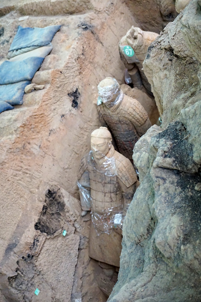 Gefunden werden die Objekte nicht stehend und aufgereiht, wie sie präsentiert werden, sondern meist liegend und in Scherben. Diese werden geborgen und sorgfältig beschriftet, um dann in der Mitte der Halle in kleinster Puzzlearbeit zusammengesetzt und an ihren Fundort zurück gebracht zu werden. Ein Problem stellt dabei dar, dass es den Ärchologen bisher nicht gelungen ist zu ergründen, woher der Lehm stammt, aus dem die Armee geformt wurde, weshalb jeder Krümel geborgen und in Säcken aufbewahrt wird, um die gefundenen Scherben zusammen zu kleistern oder ganz verlorene Stücke nachzumodellieren. Die Objekte sind auch keineswegs graubraun, wie sie präsentiert werden, wenn man sie ausgräbt sondern sehr bunt und detaillreich lackiert. Allerdings löst sich der Lack wenige Wochen, nachdem die Stücke freigelegt sind und Licht und Luft ausgesetzt werden, ein Problem, was die Forscher gerade zu lösen versuchen. Das ist einer der Gründe, warum nicht einfach alles freigelegt wird, sondern vieles noch unter der Erde schlummert oder im Dunkeln verborgen bleibt.