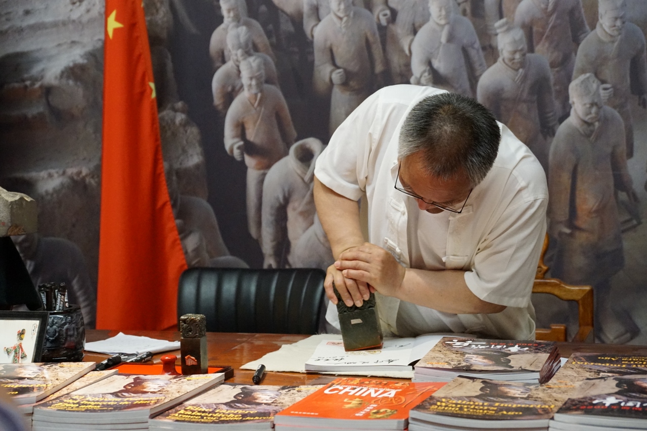 Auf dem Weg zum Ausgang weiß Lilly eine Abkürzung und führt uns (rein zufällig natürlich) an einem Shop vorbei, in dem einer der Entdecker der Grabungsstätten Bücher darüber signiert (und sich das Ganze anständig bezahlen lässt). Aber wann kommt man wohl je wieder hierher und für uns ist dieses Buch natürlich ein absolutes Unikat, auch wenn Mr. Yang täglich wohl tausende davon signiert. Aber wahrscheinlich nicht allzu viele deutsche Ausgaben.