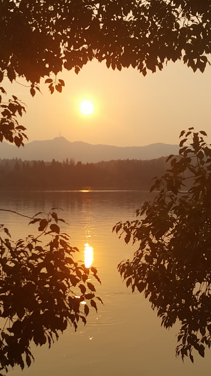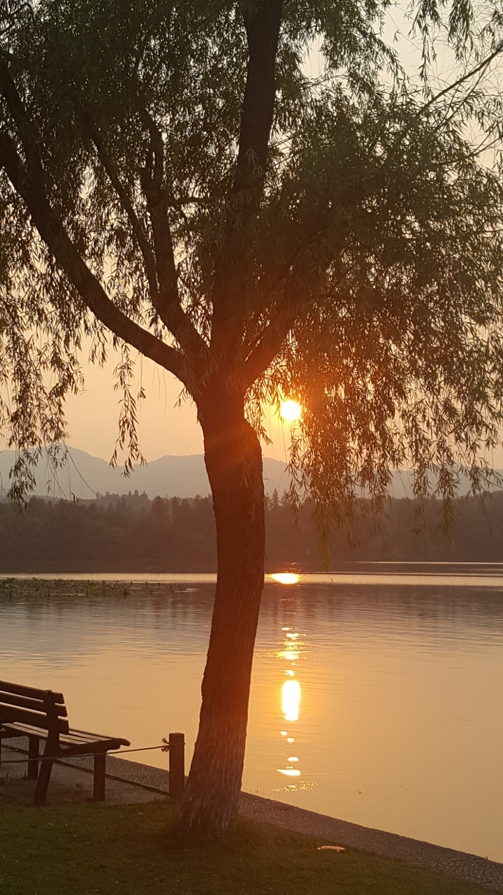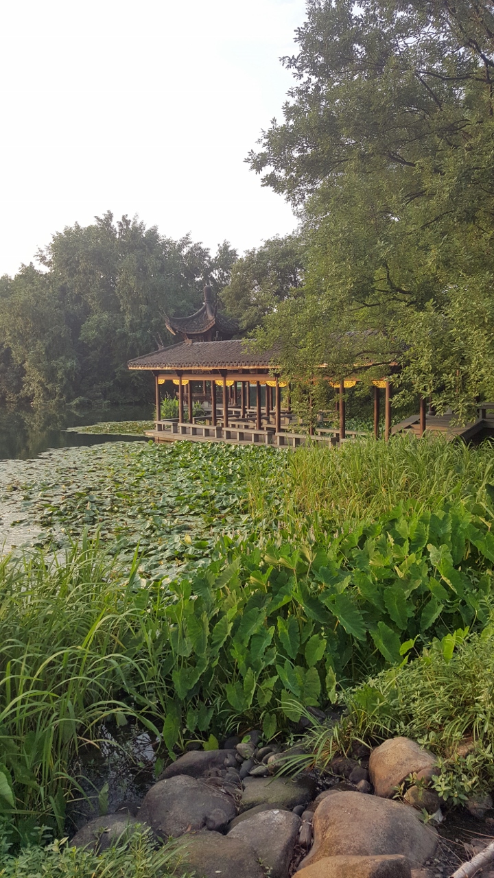 Das Hotel soll dem Namen nach ein Resort sein, es gibt auch einen überwachten Eingang und einen Klinikbereich (?), aber viel mehr steckt wohl nicht dahinter. Die Lobby schaut noch recht glänzend aufpoliert aus, aber bereits auf dem Weg zum Zimmer ändert sich der Auftritt des Hauses. Den letzten Anstrich hat die Bude noch auf Anweisung von Mao bekommen, aber egal, das Zimmer hat, was man braucht. Wir halten uns auch gar nicht lange darin auf, sondern ziehen gleich noch mal los, wir sind hier mitten in der "West Lake Scenic Area", einem großen Seen- und Waldgebiet. Und Sonnenuntergang gibbet heute auch.