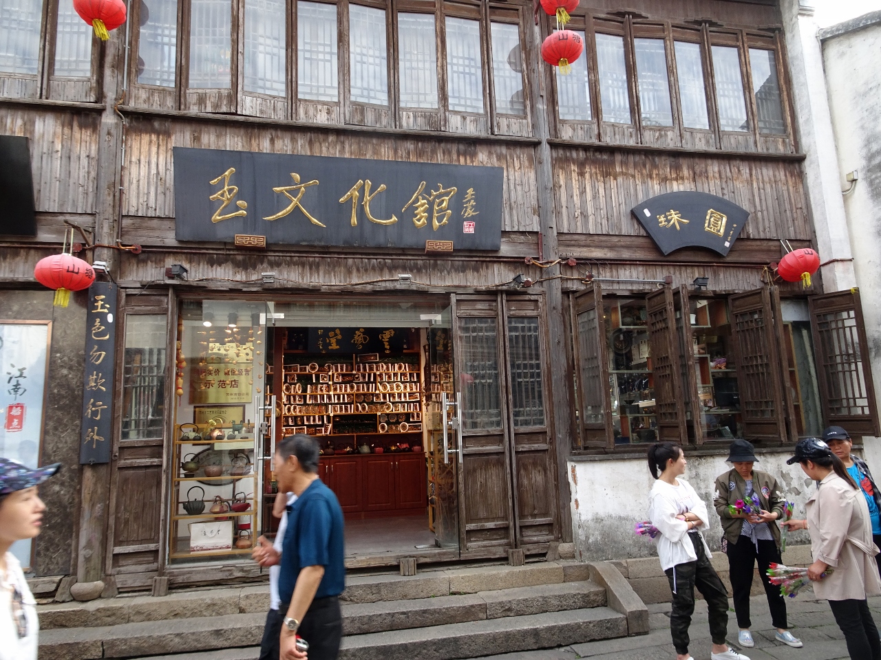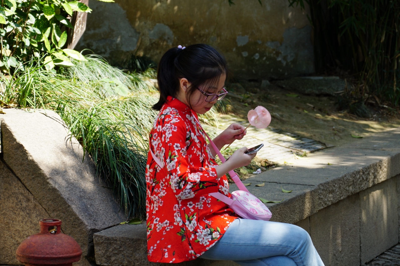Wir steigen an der Pingjiang Road aus, einer schmalen Straße entlang einem dieser Kanäle, hier gibt es dutzende Souvenirgeschäfte und Restaurants, in einem gehen wir erst mal zum Lunch, soweit habe ich Charly verstanden. Dafür musste ich aber drei mal nachfragen. Während unsere bisherigen Guides alle flotten Schrittes unterwegs waren, so dass wir sie oftmals bremsen mussten, macht Charly winzige Trippelschritte und spielt währenddessen ununterbrochen an seinem Smartphone. Ab und an wird er noch langsamer oder bleibt unvermittelt stehen, so dass ich ihm mehrfach in die Hacken laufe. Nach unsäglich langsamen mehreren hundert Metern verkündet er vor einem Restaurant freudestrahlend, dass wir schon da wären. Wir wählen an einer Art Buffet zwei Gerichte für uns aus, Charly fragt ganz ungläubig, warum nur zwei... Also setzen wir uns und er setzt sich zu uns an den Tisch. Das hat bisher noch keiner der Guides gemacht, außer bei den Street-Food-Safaris. Kaum ist das erste Gericht am Tisch, langt Charly fleißig zu, wir schauen uns ungläubig an, drum waren ihm zwei Gerichte wohl zu wenig. Er hat sehr chinesische Tischsitten, aber wir versuchen uns erst mal nichts anmerken zu lassen und essen auch. Nachdem Charly auch vom zweiten Gericht, der Ente gekostet hat, ist er wohl gesättigt und möchte weiter. Wir verweigern und verspeisen, was er uns übrig gelassen hat. Er beginnt herzhaft zu gähnen und wenn er gerade mal nicht gähnt, rülpst er lautstark. Als wir fertig sind, begleitet er mich zum Cashier Desk und lässt mich bezahlen, anschließend schickt er uns nach draußen. Wir gehen aber nicht ums Eck und ich sehe, dass er sich eine Quittung für das Essen ausstellen lässt, was er damit wohl vor hat?