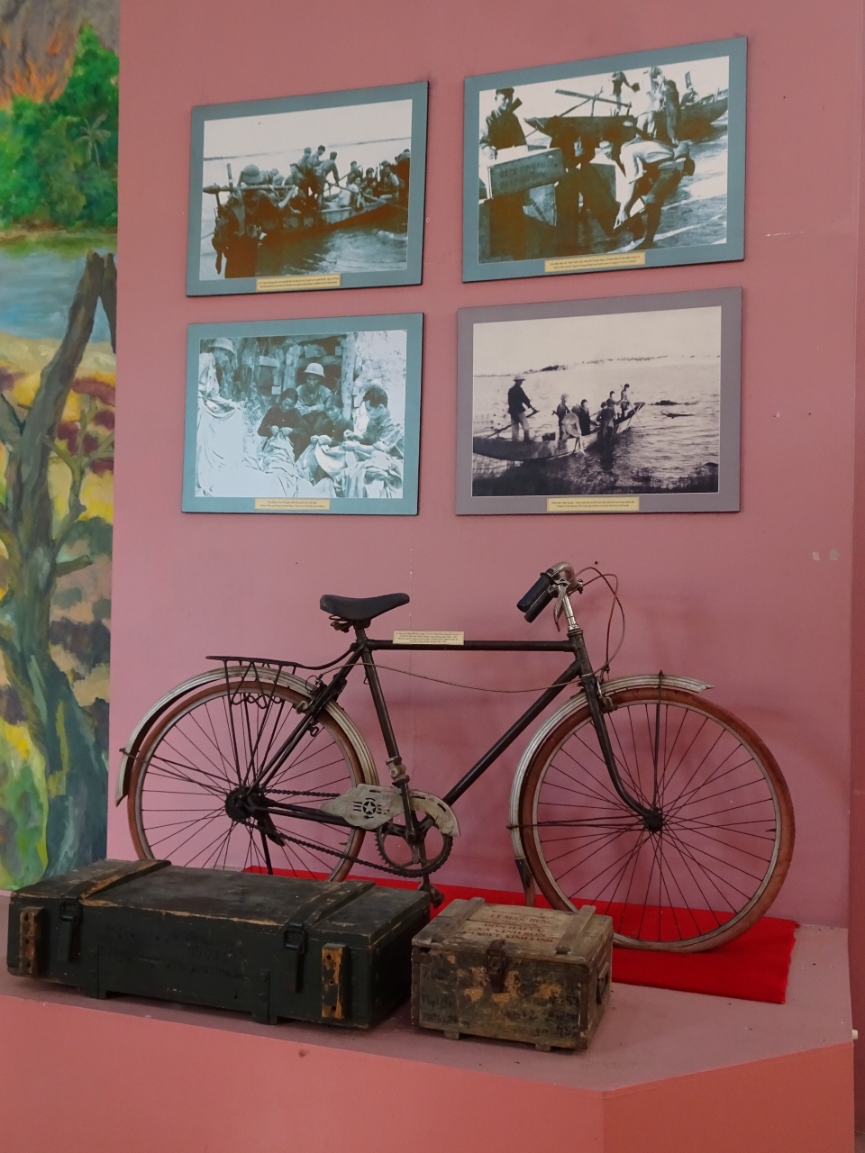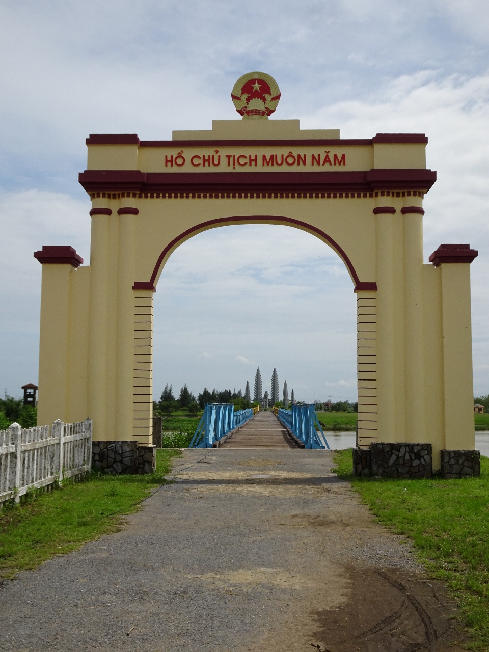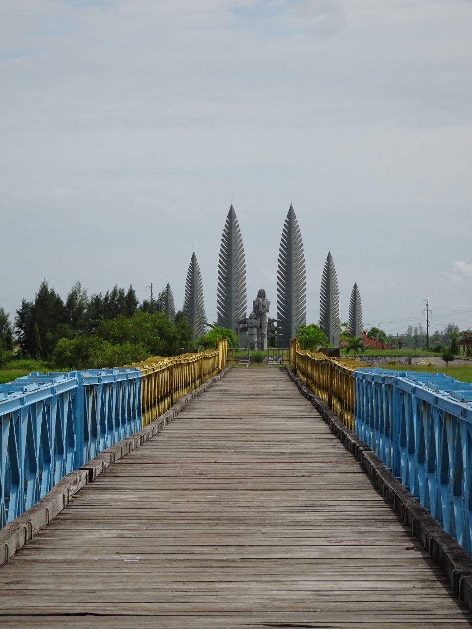 Wir gehen zu Fuß über die Brücke, die bis zur Hälfte hellblau, der Farbe der Vietkong gestrichen ist und auf der anderen Seite gelb, der Farbe des damaligen Südvietnams.